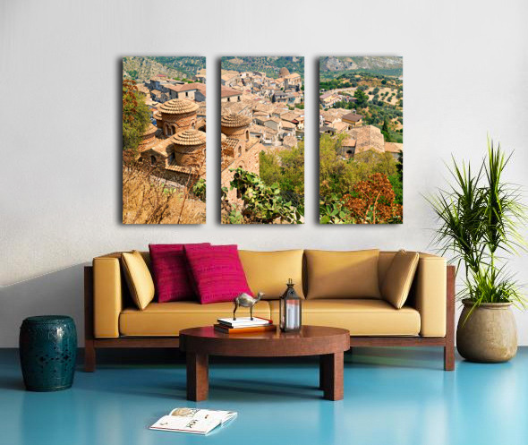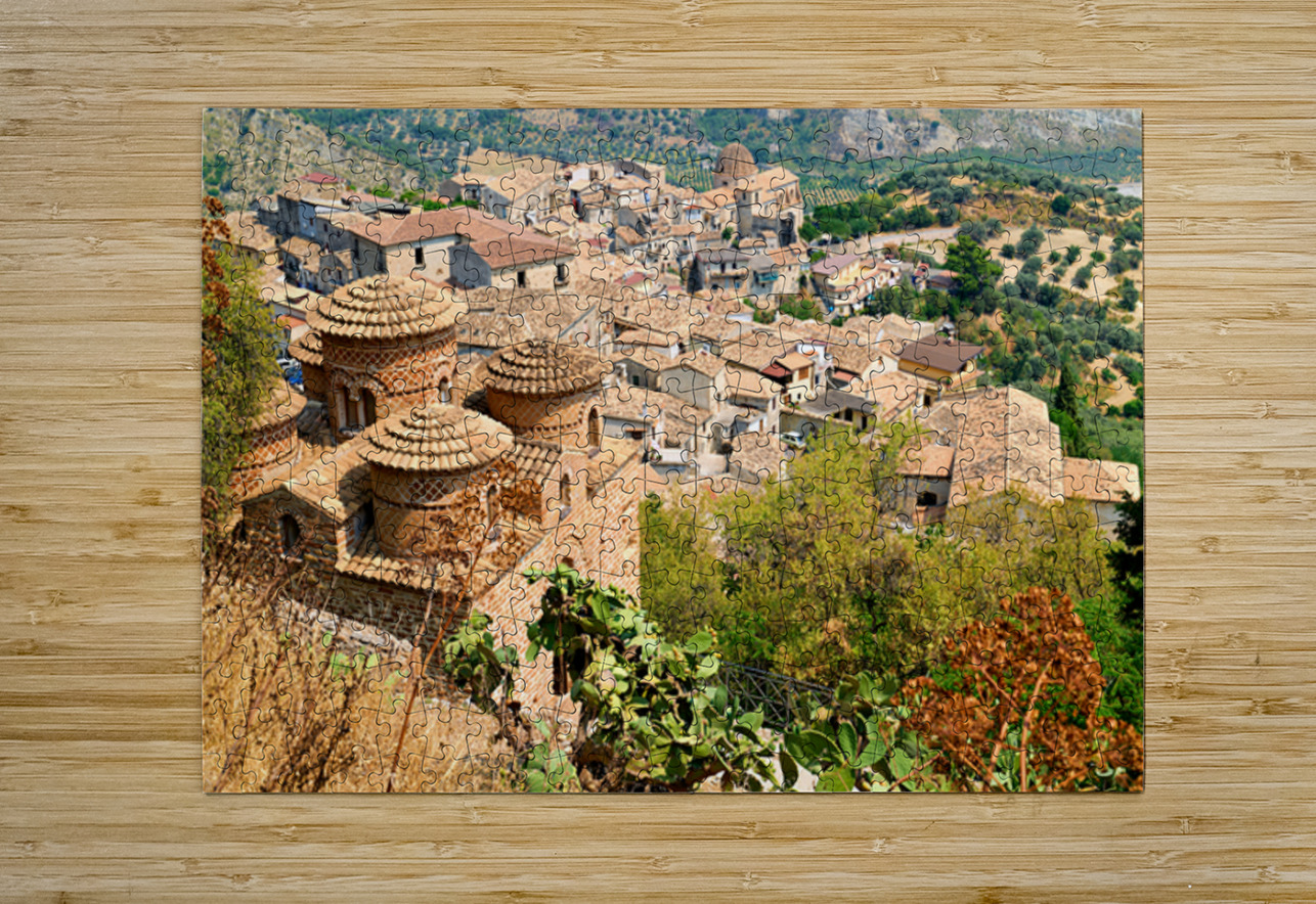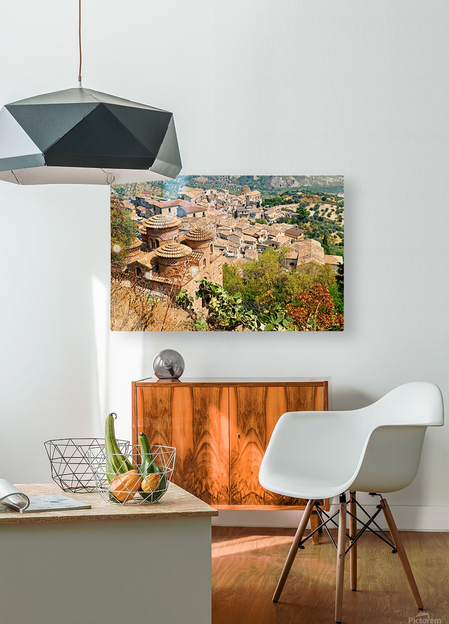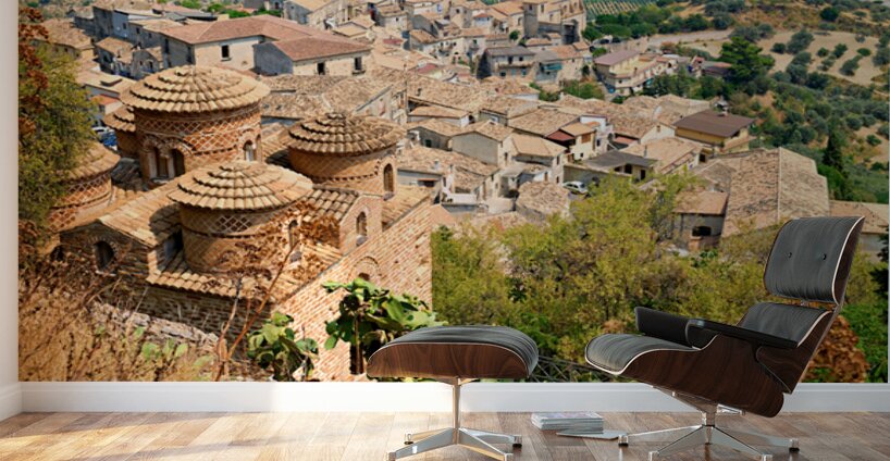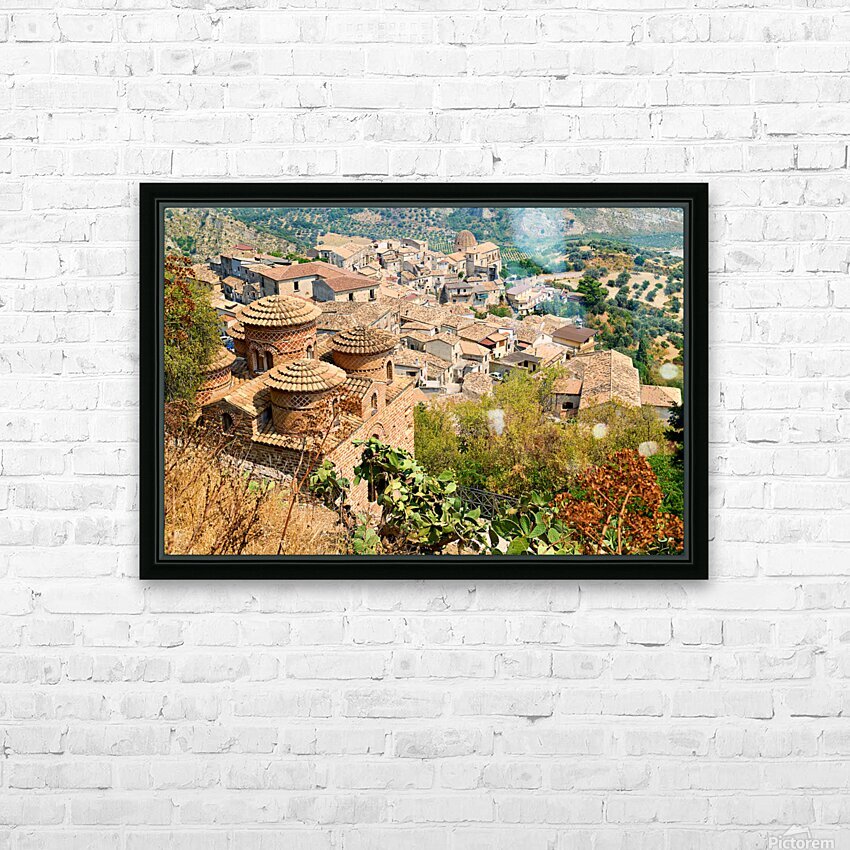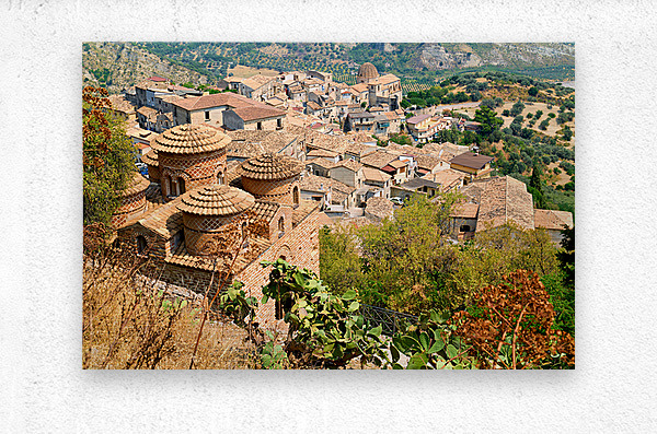"Cattolica di Stilo church and surrounding village in Calabria I" in a framed print.