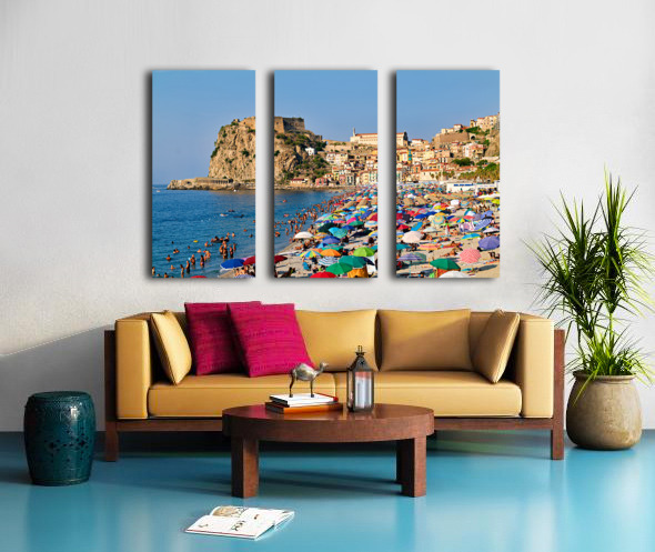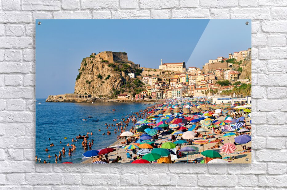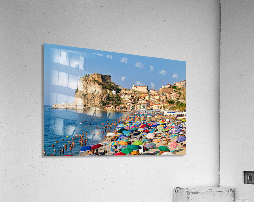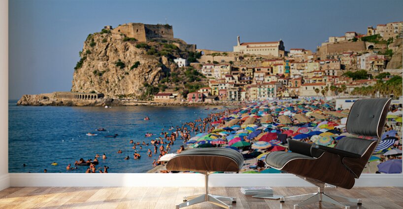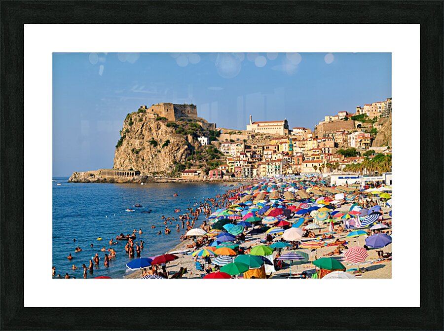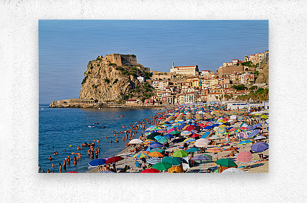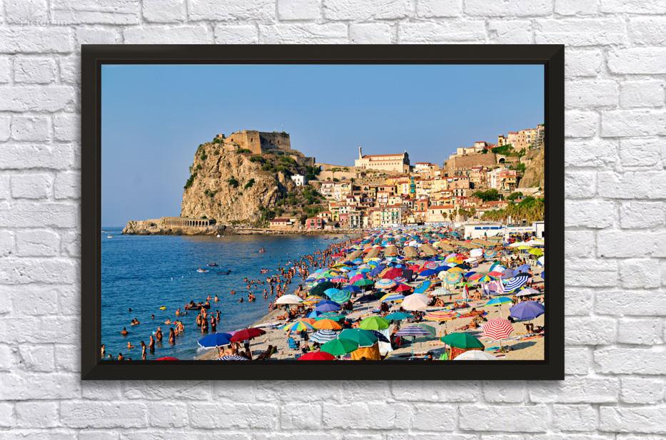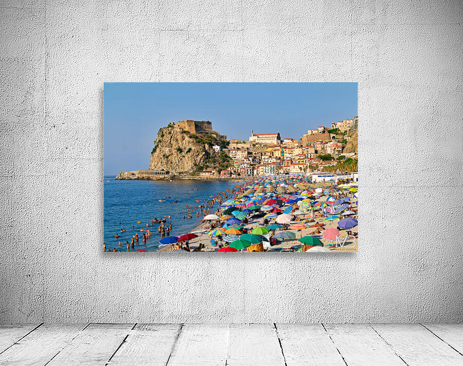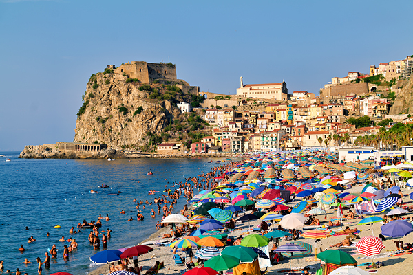 People enjoy a sunny day at Marina Grande beach in Scilla Calabria. The Ruffo Castle overlooks the beach and colorful umbrellas dot the shore.