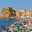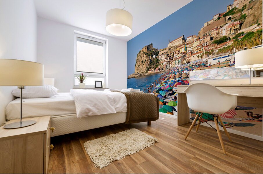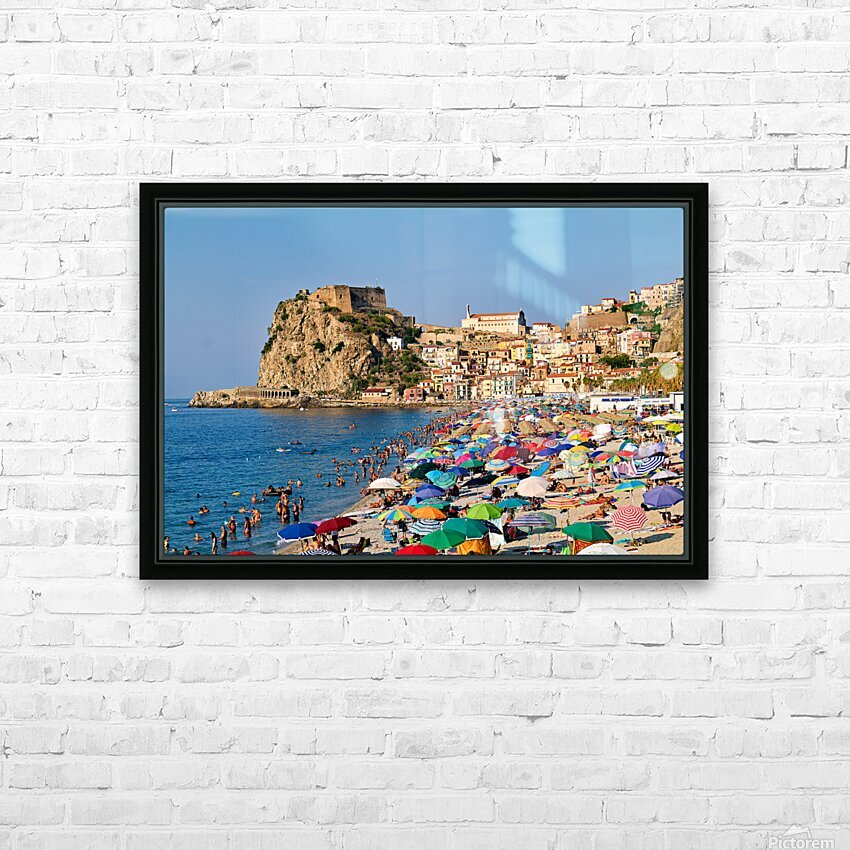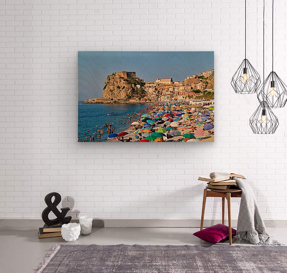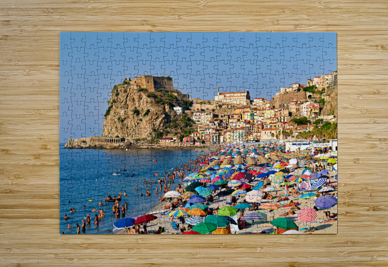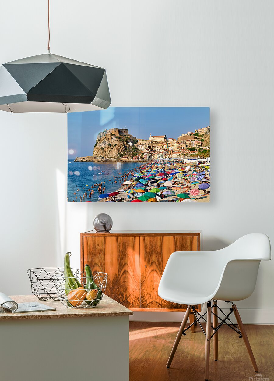 People enjoy a sunny day at Marina Grande beach in Scilla Calabria. The Ruffo Castle overlooks the beach and colorful umbrellas dot the shore.