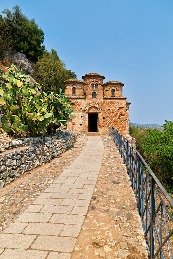 A stone pathway leads to the ancient Byzantine church in Cattolica di Stilo Calabria surrounded by trees and cacti under a clear sky.