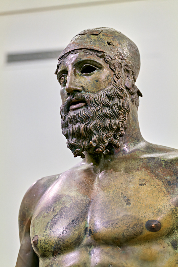 This statue known as Bronze B is displayed at the National Museum of Magna Grecia in Reggio Calabria Italy. It shows ancient craftsmanship.