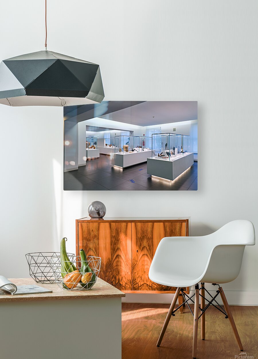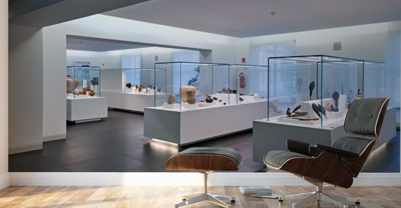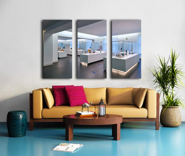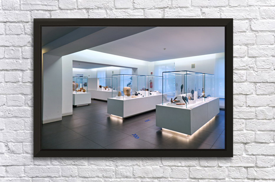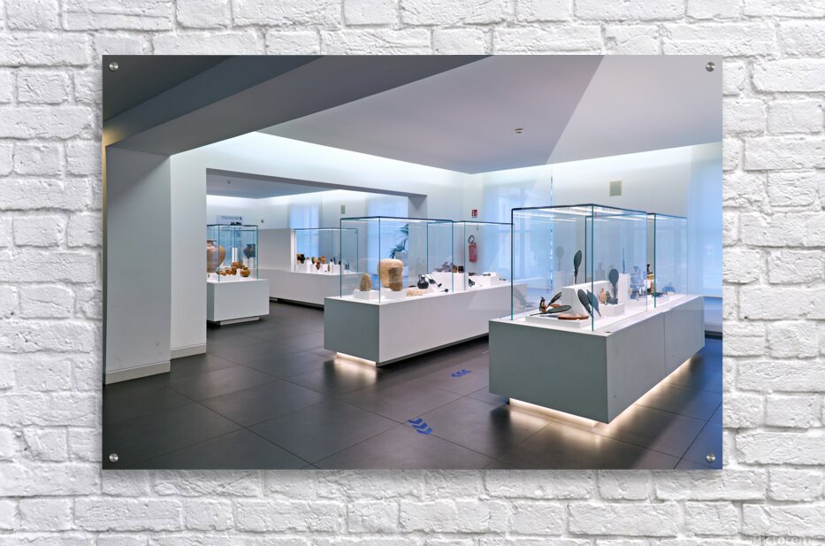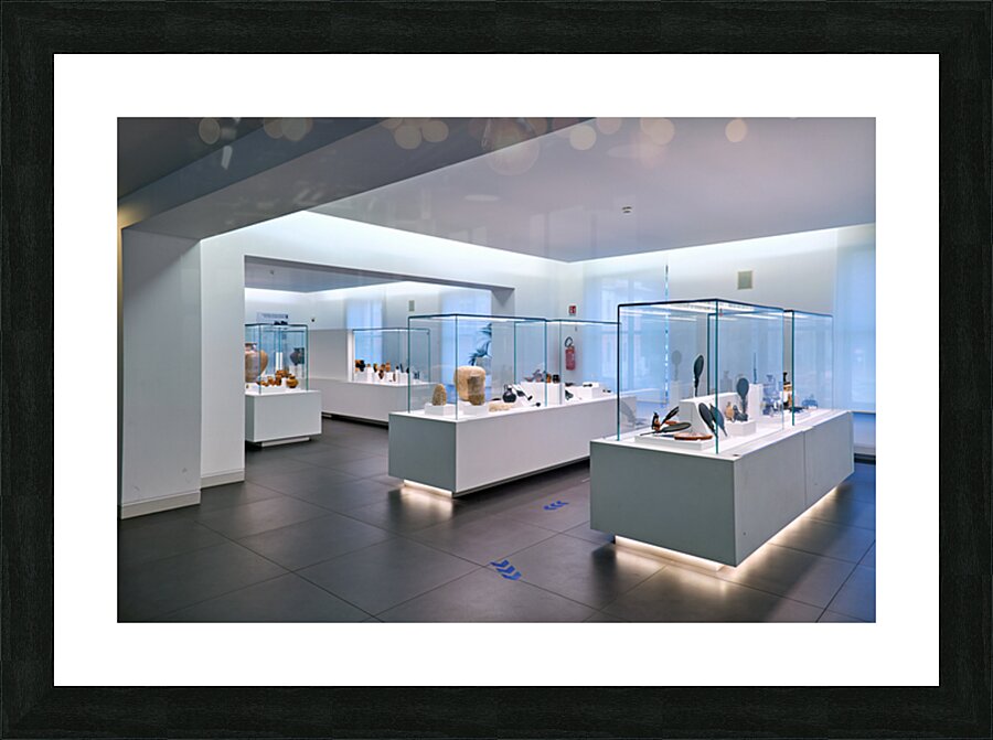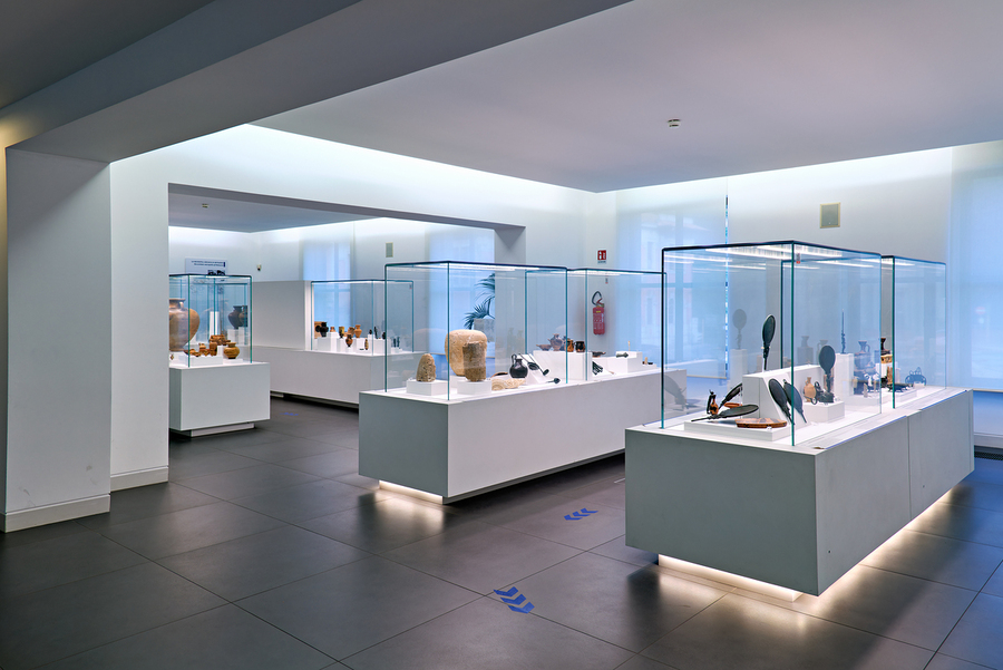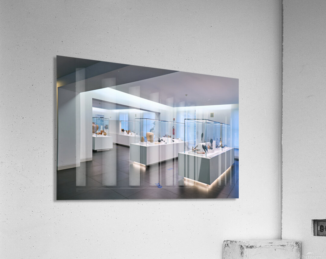 Visitors explore the exhibits at the National Museum of Magna Grecia in Reggio Calabria Italy. Various artifacts are displayed under bright lights.
