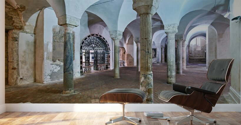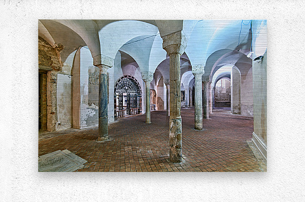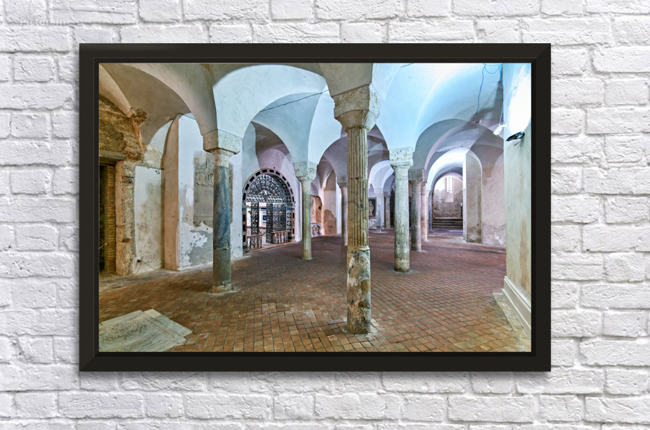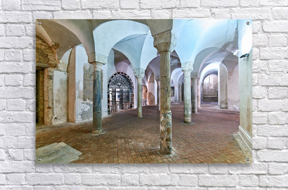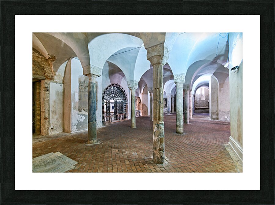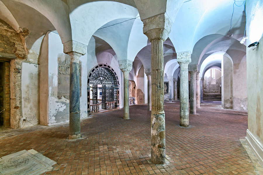 The inside of the crypt in the Norman Cathedral. Stone pillars support the arches in a historic setting in Gerace Calabria.