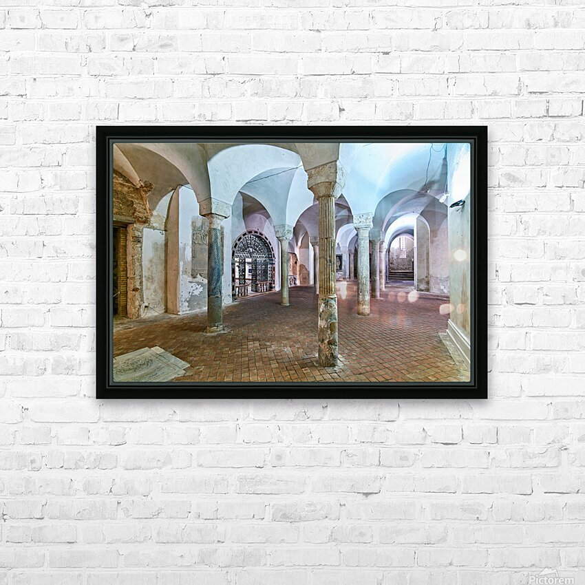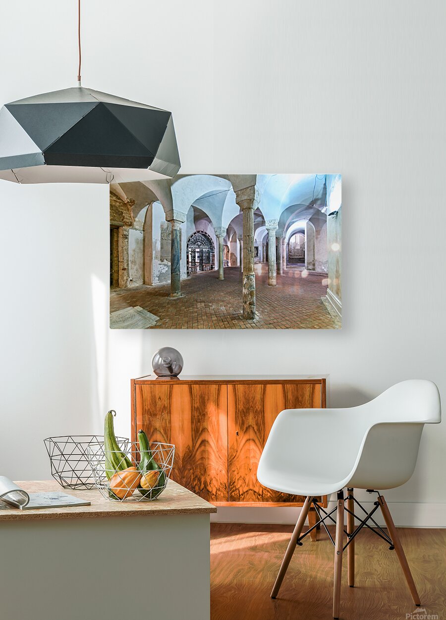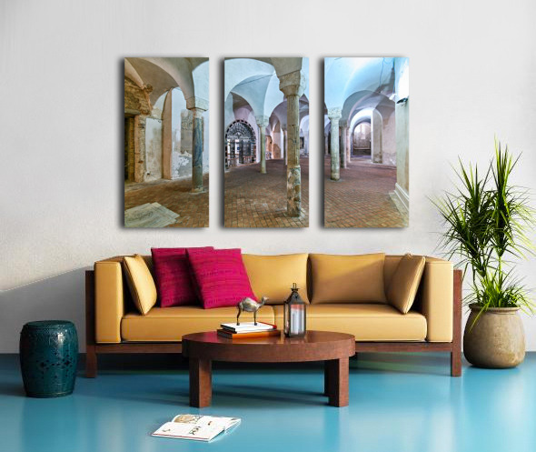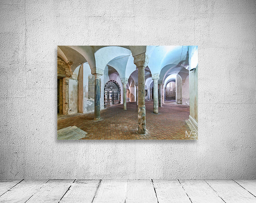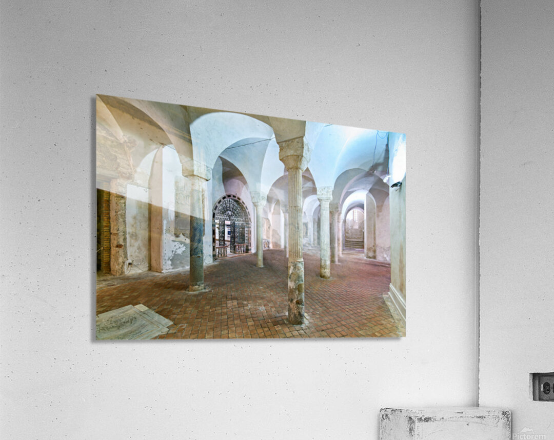 The inside of the crypt in the Norman Cathedral. Stone pillars support the arches in a historic setting in Gerace Calabria.