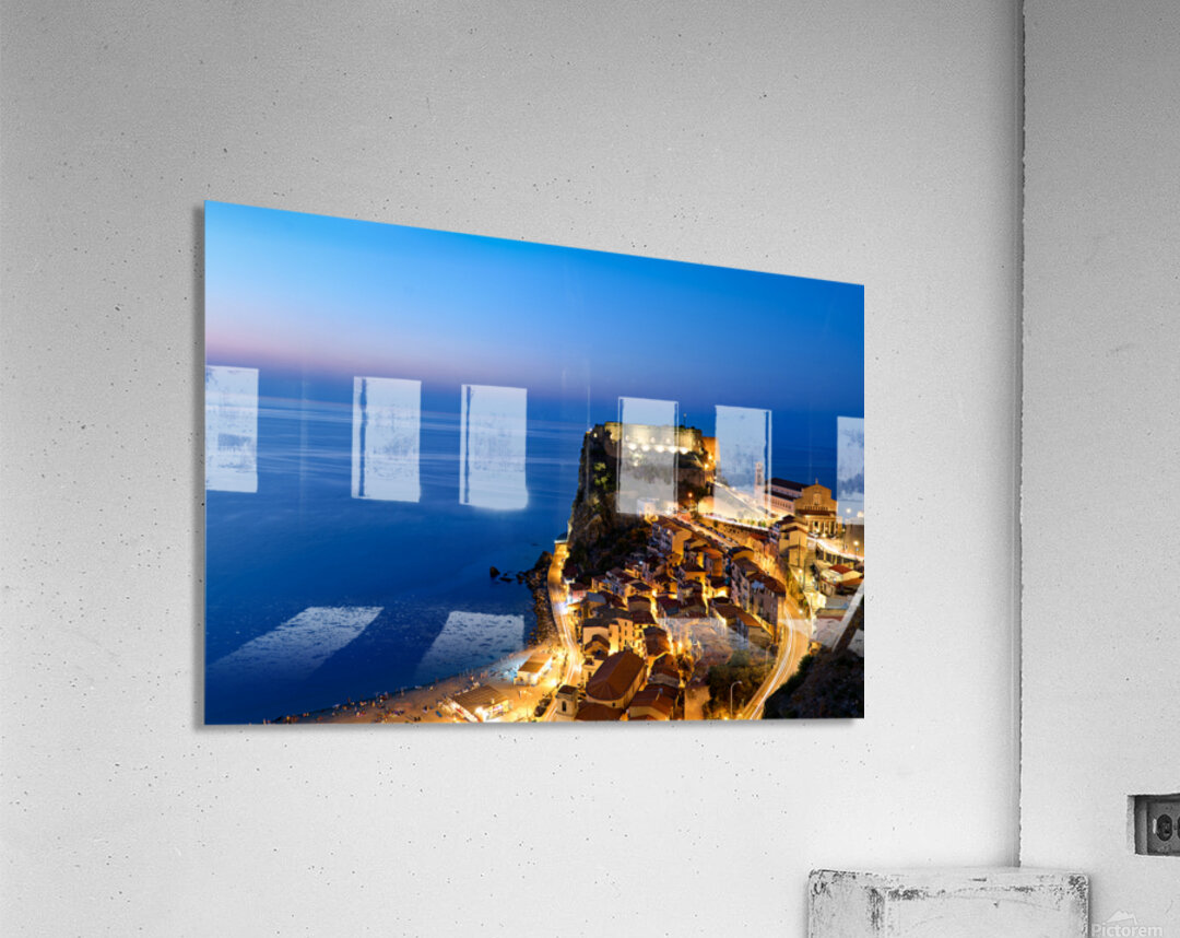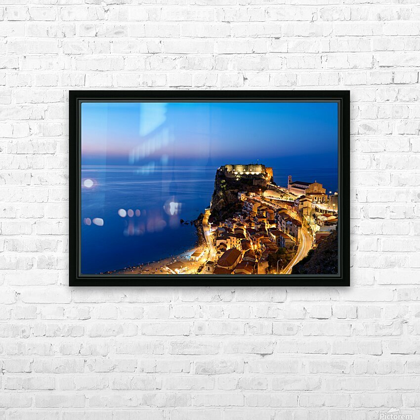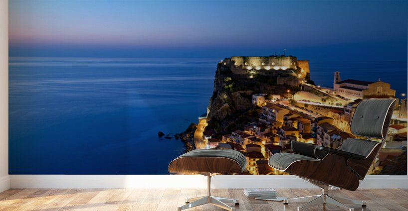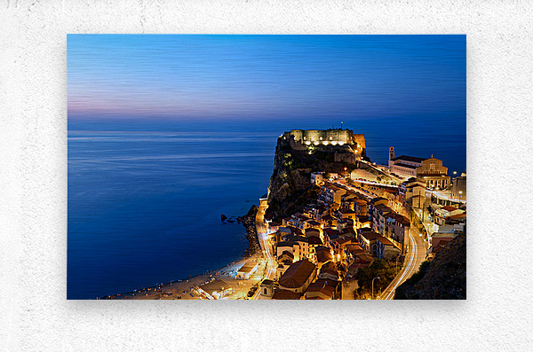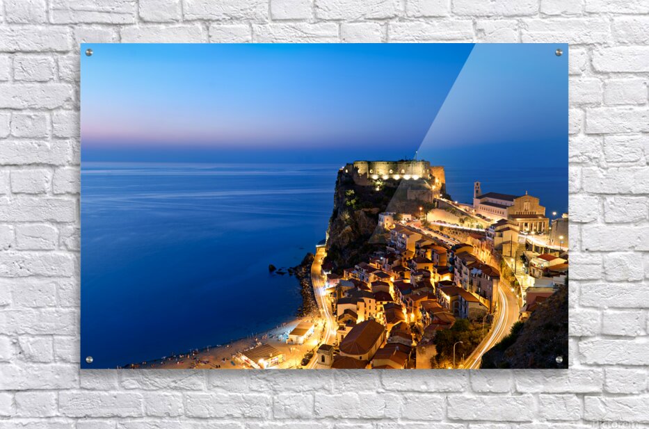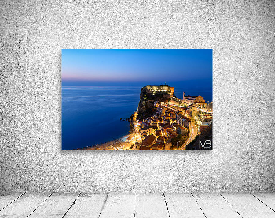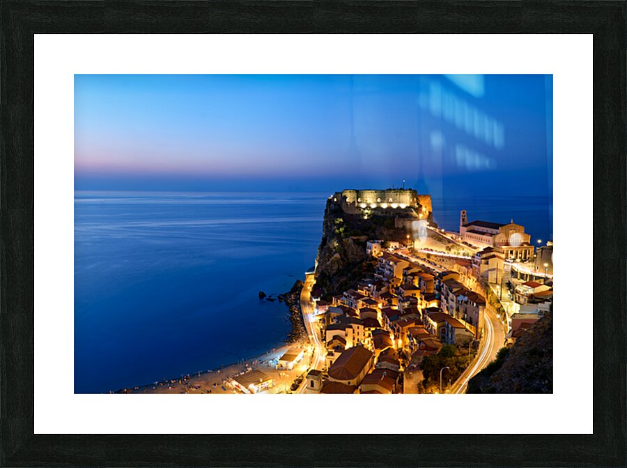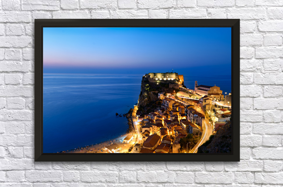"Illuminated Ruffo castle in Scilla Calabria at sunset over the s" in a framed print.