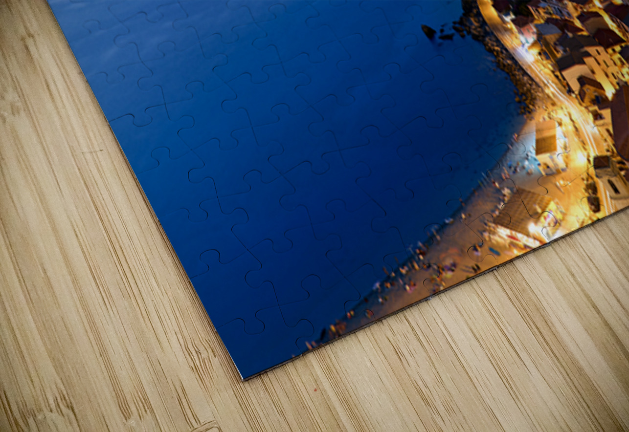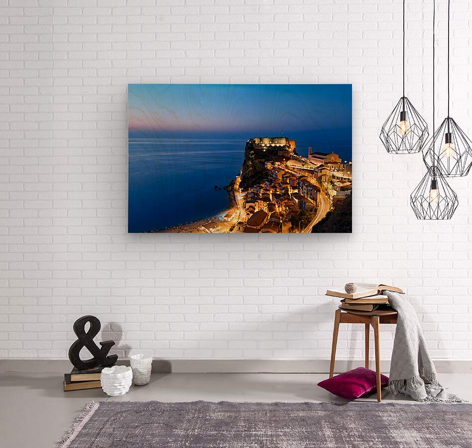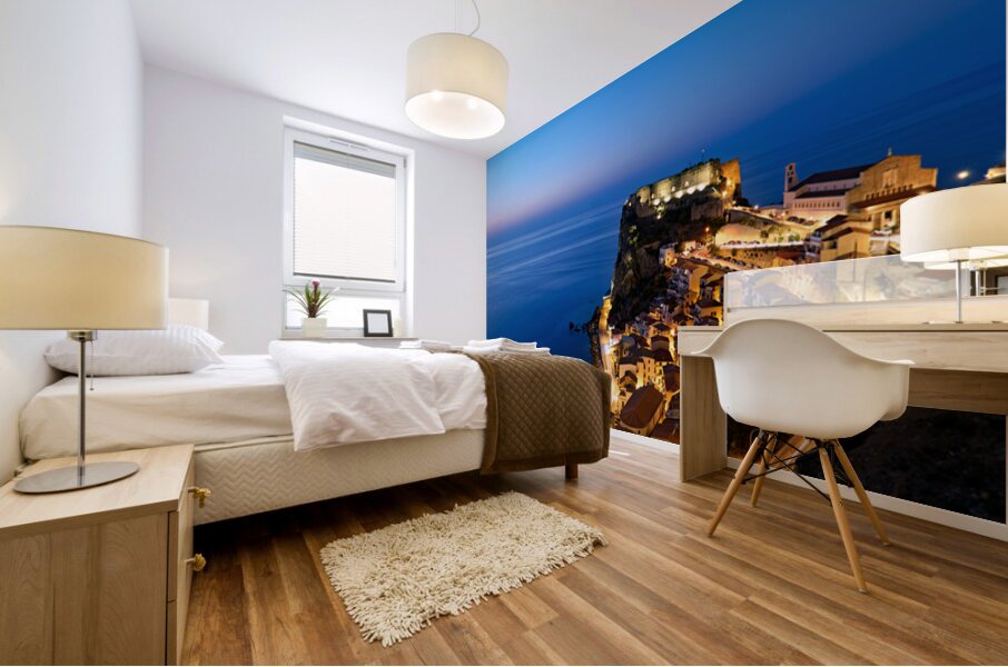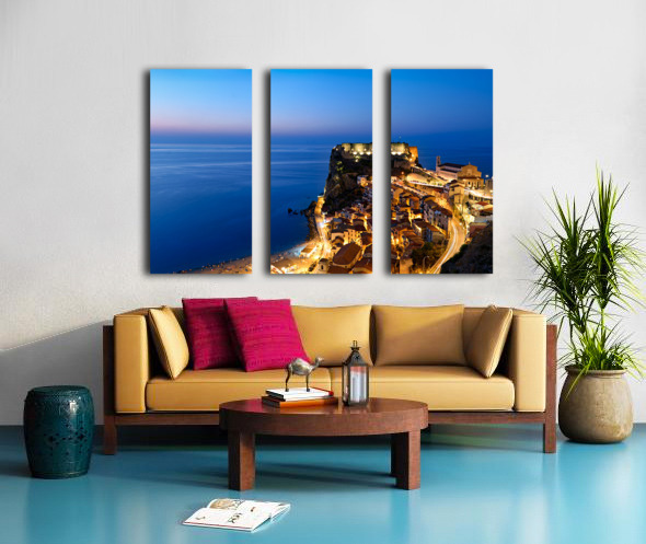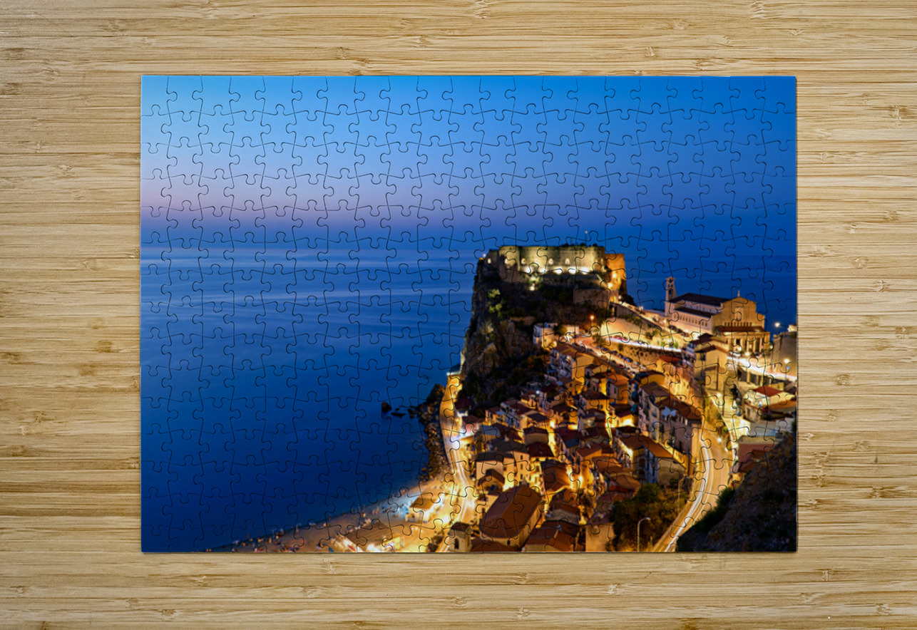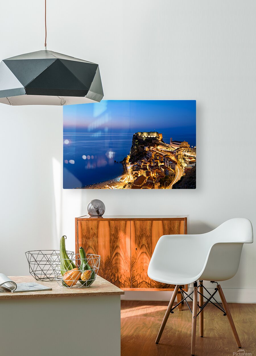 "Illuminated Ruffo castle in Scilla Calabria at sunset over the s" in a framed print.
