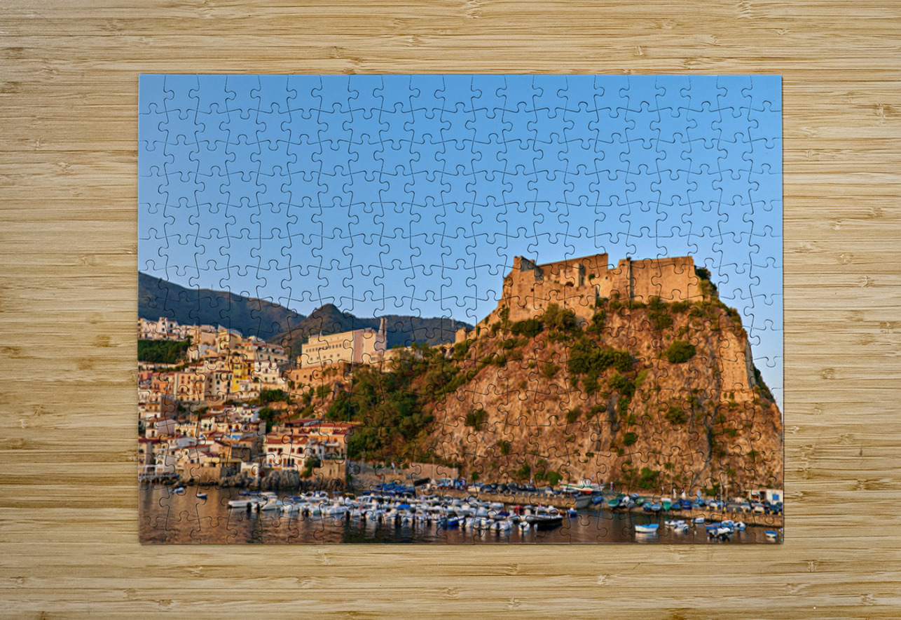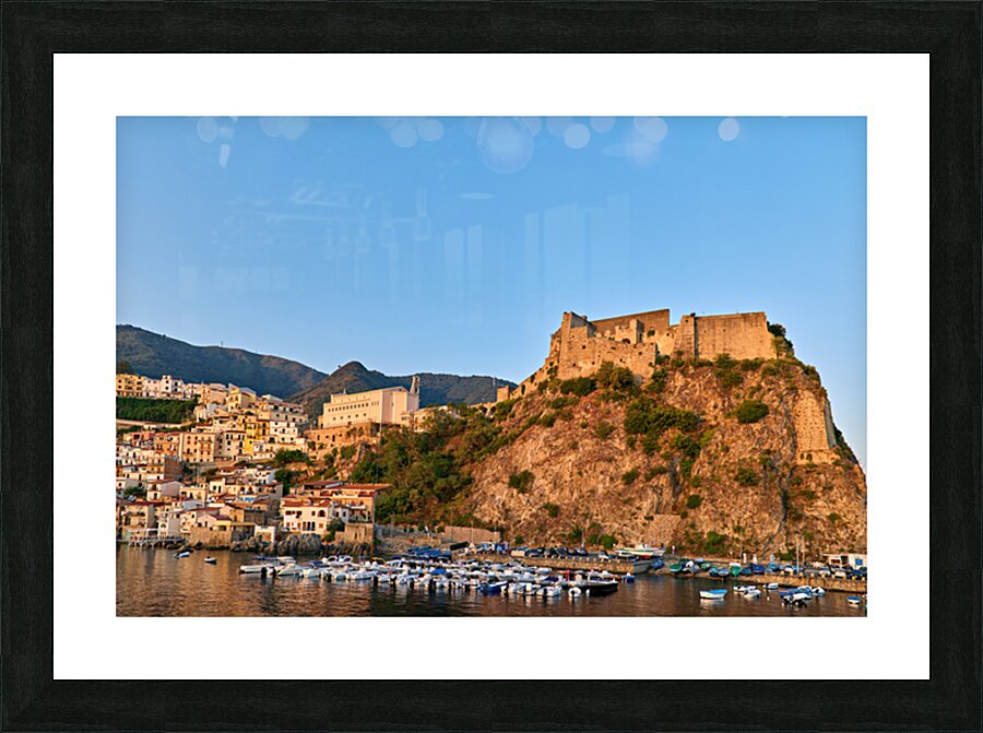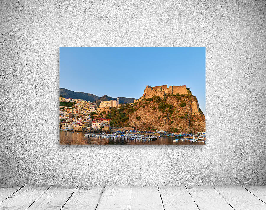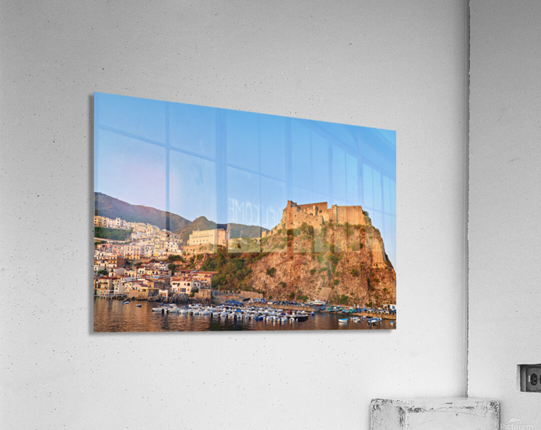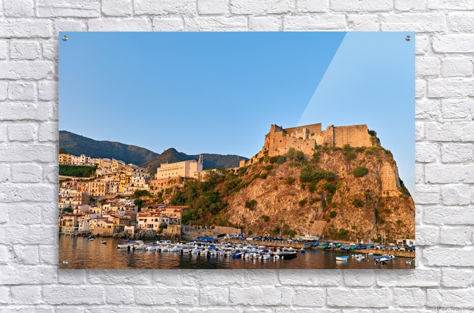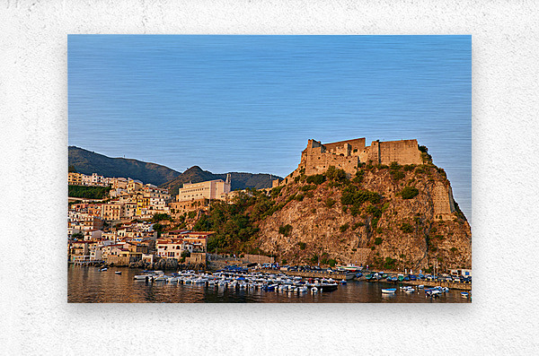 Chianalea village in Calabria shows boats at sunrise with Ruffo castle on the cliff. The village is quiet as the day begins.
