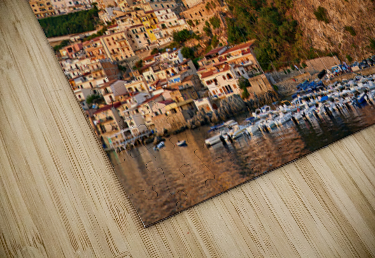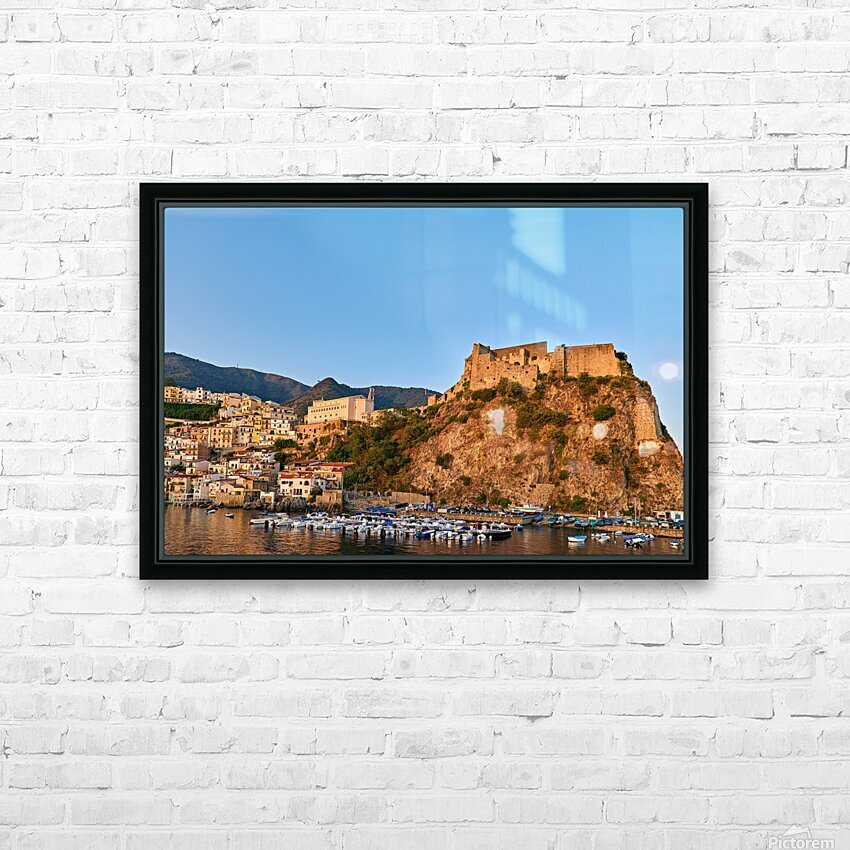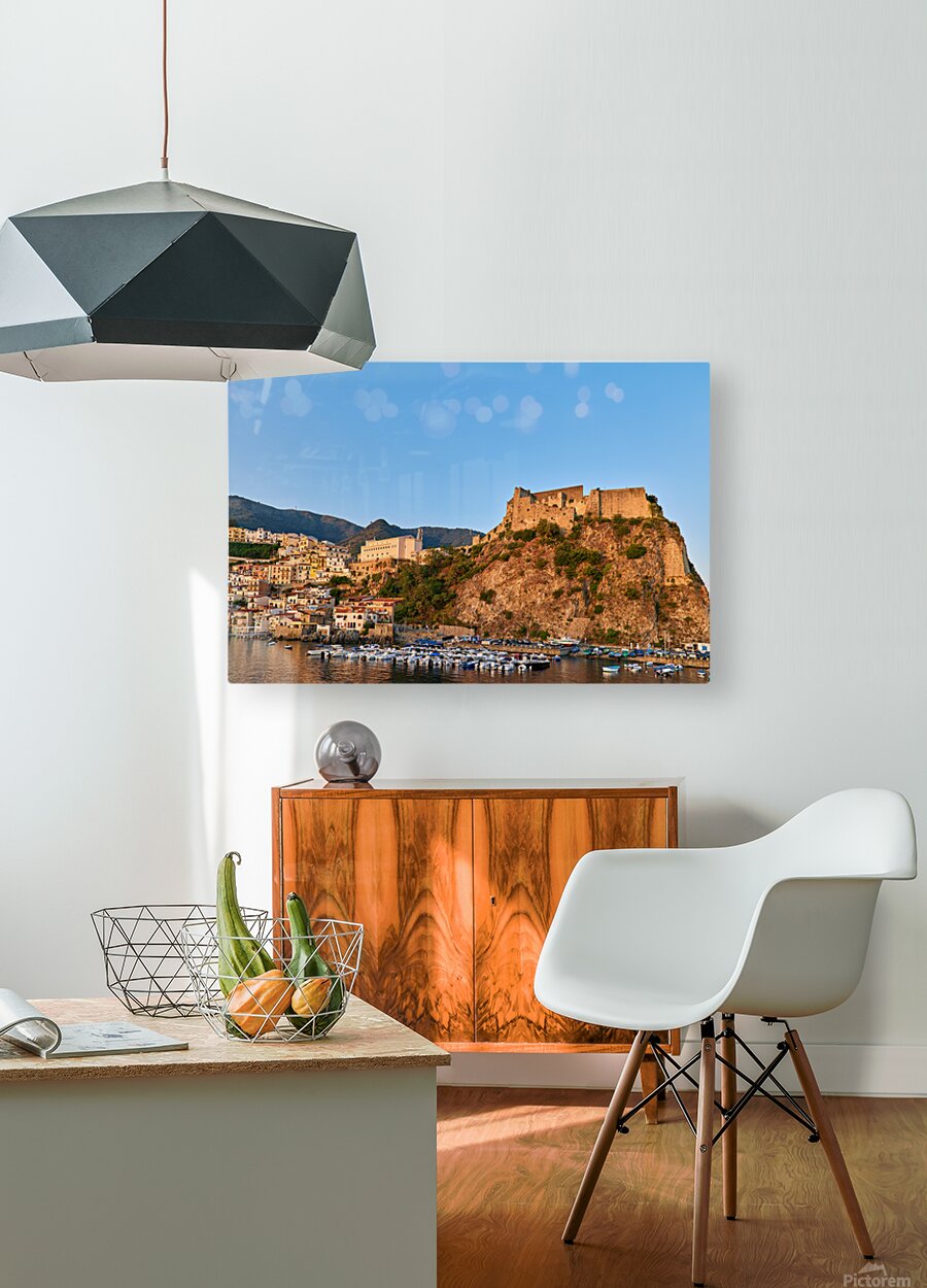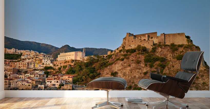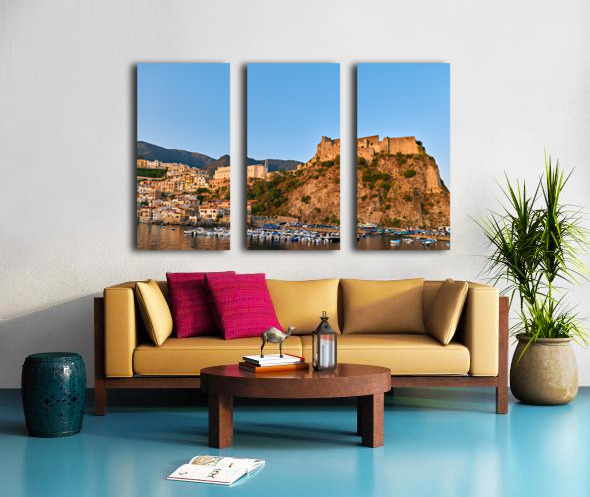 Chianalea village in Calabria shows boats at sunrise with Ruffo castle on the cliff. The village is quiet as the day begins.