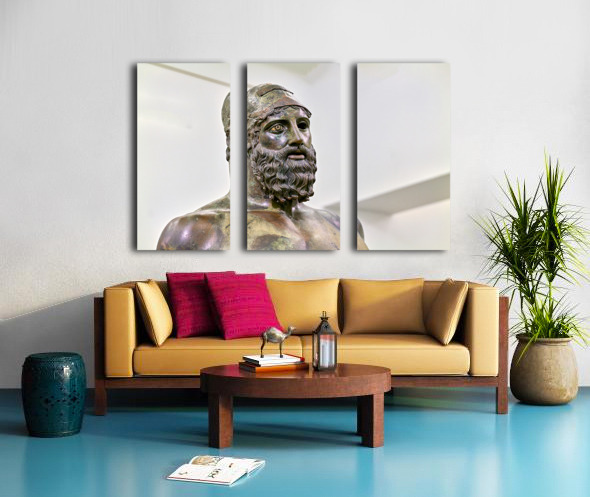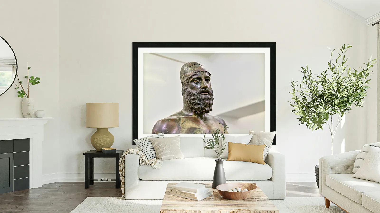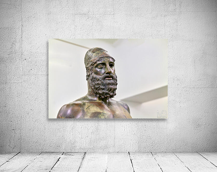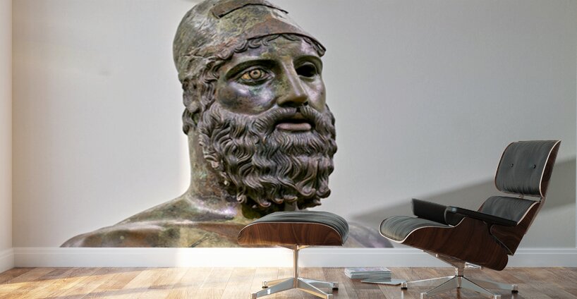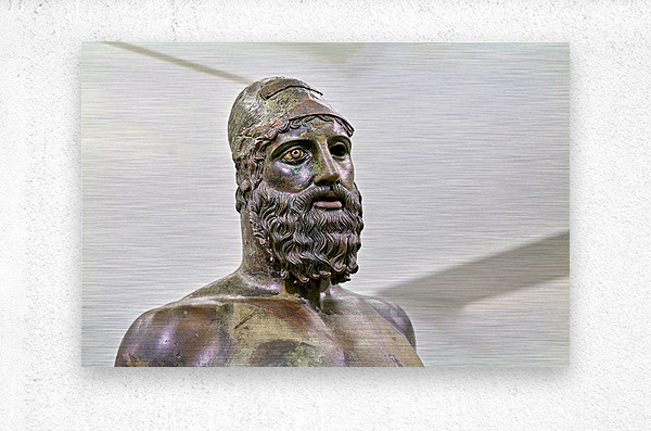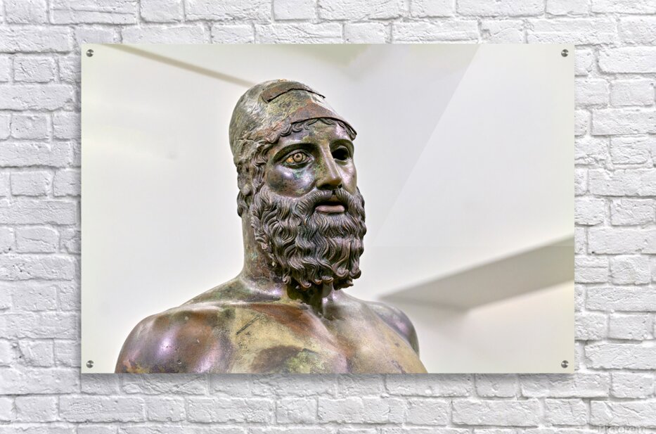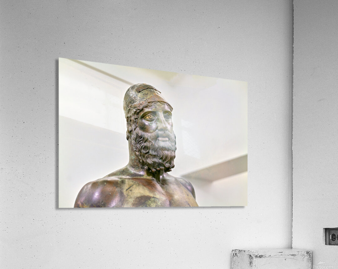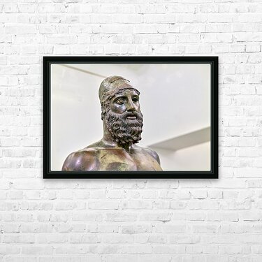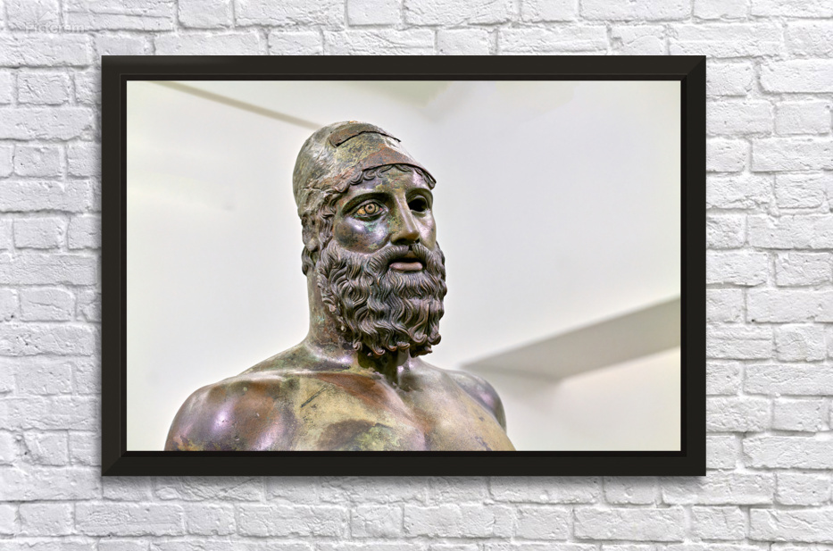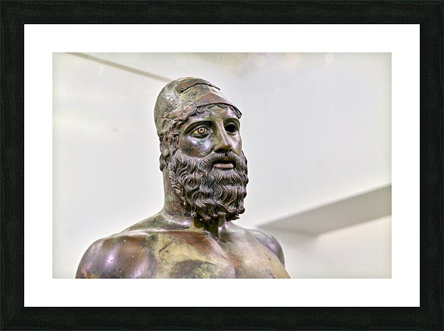 Visitors observe the detailed features of Statue B from the Riace Bronzes. This bronze statue is housed in the National Museum of Magna Grecia.