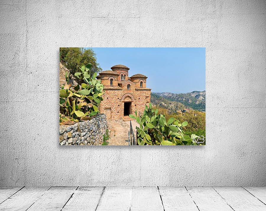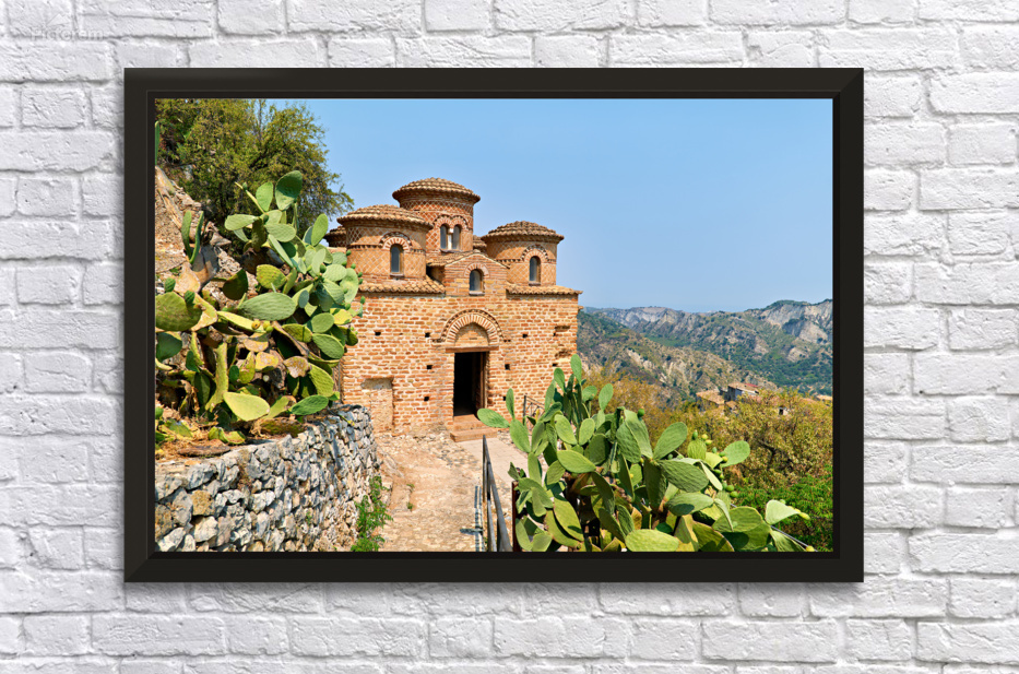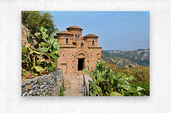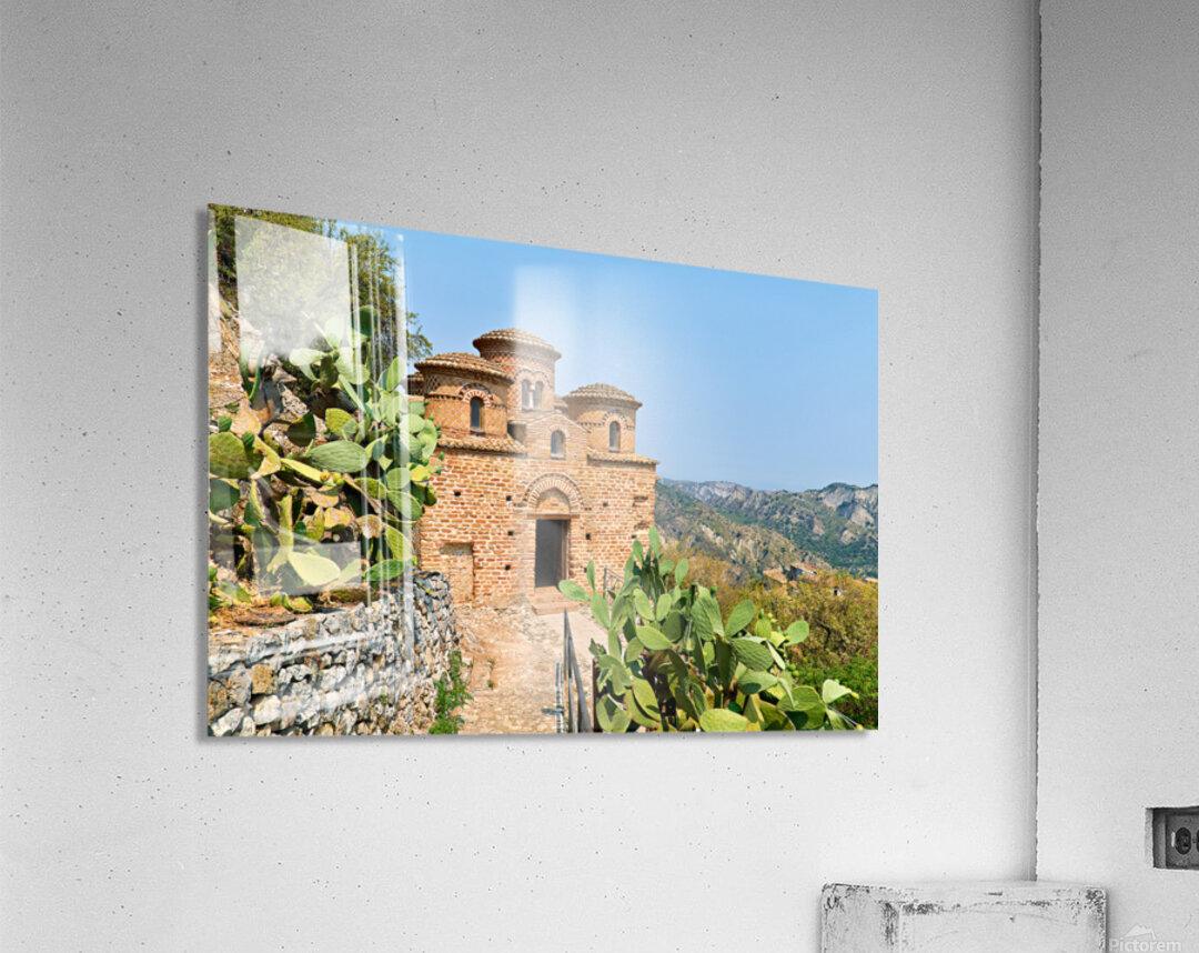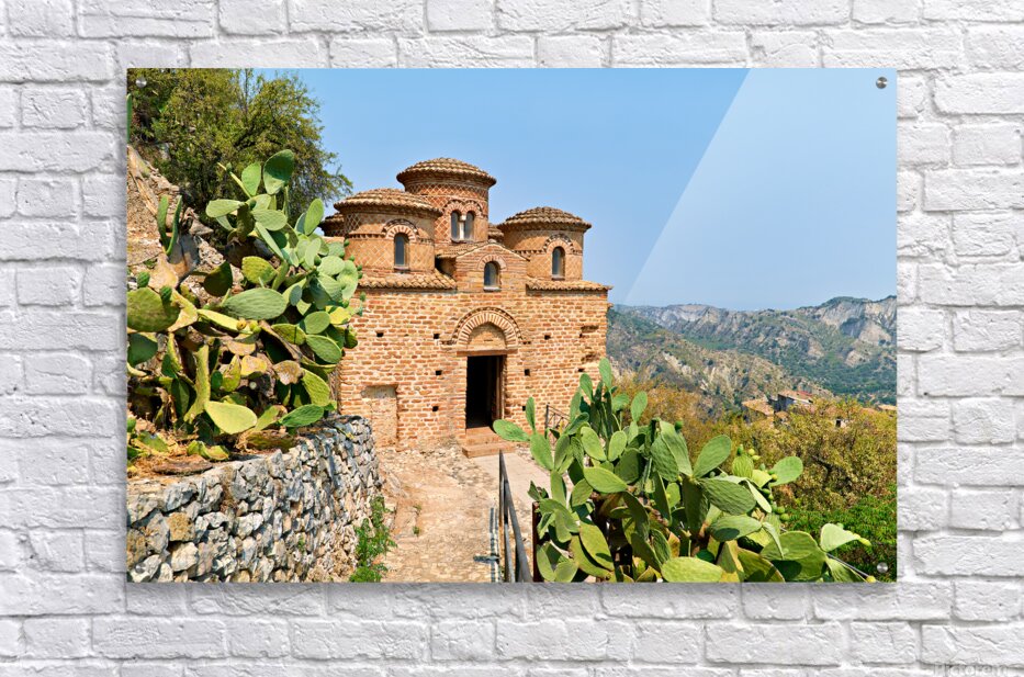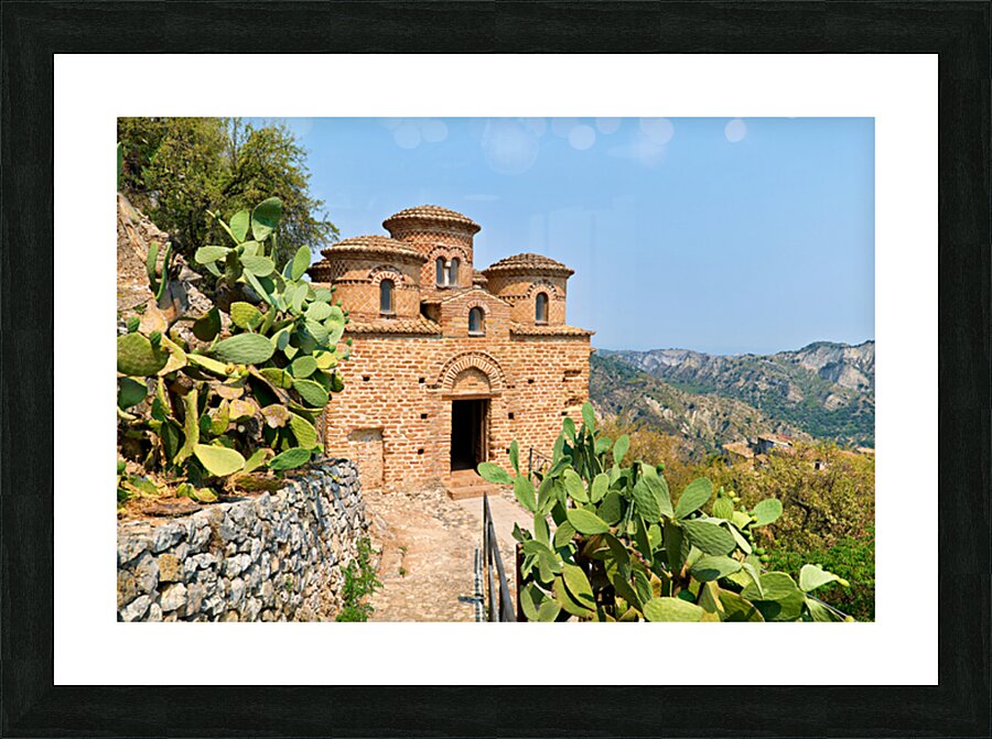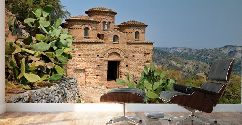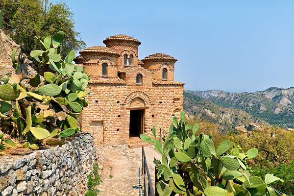 Cattolica di Stilo stands on a hillside showcasing its unique architecture under the blue sky amidst the surrounding landscape.