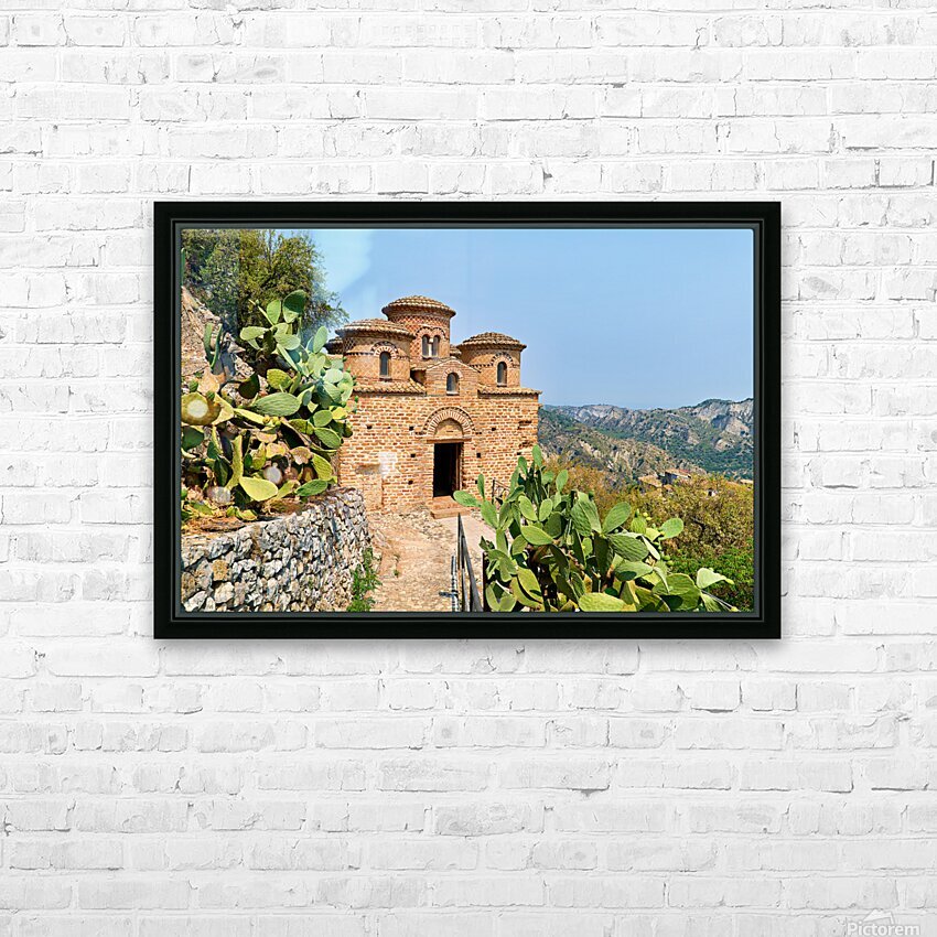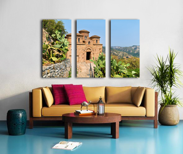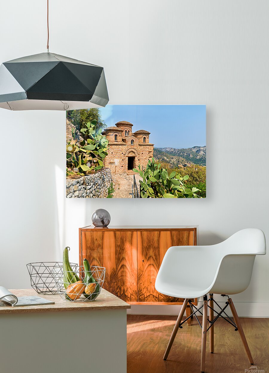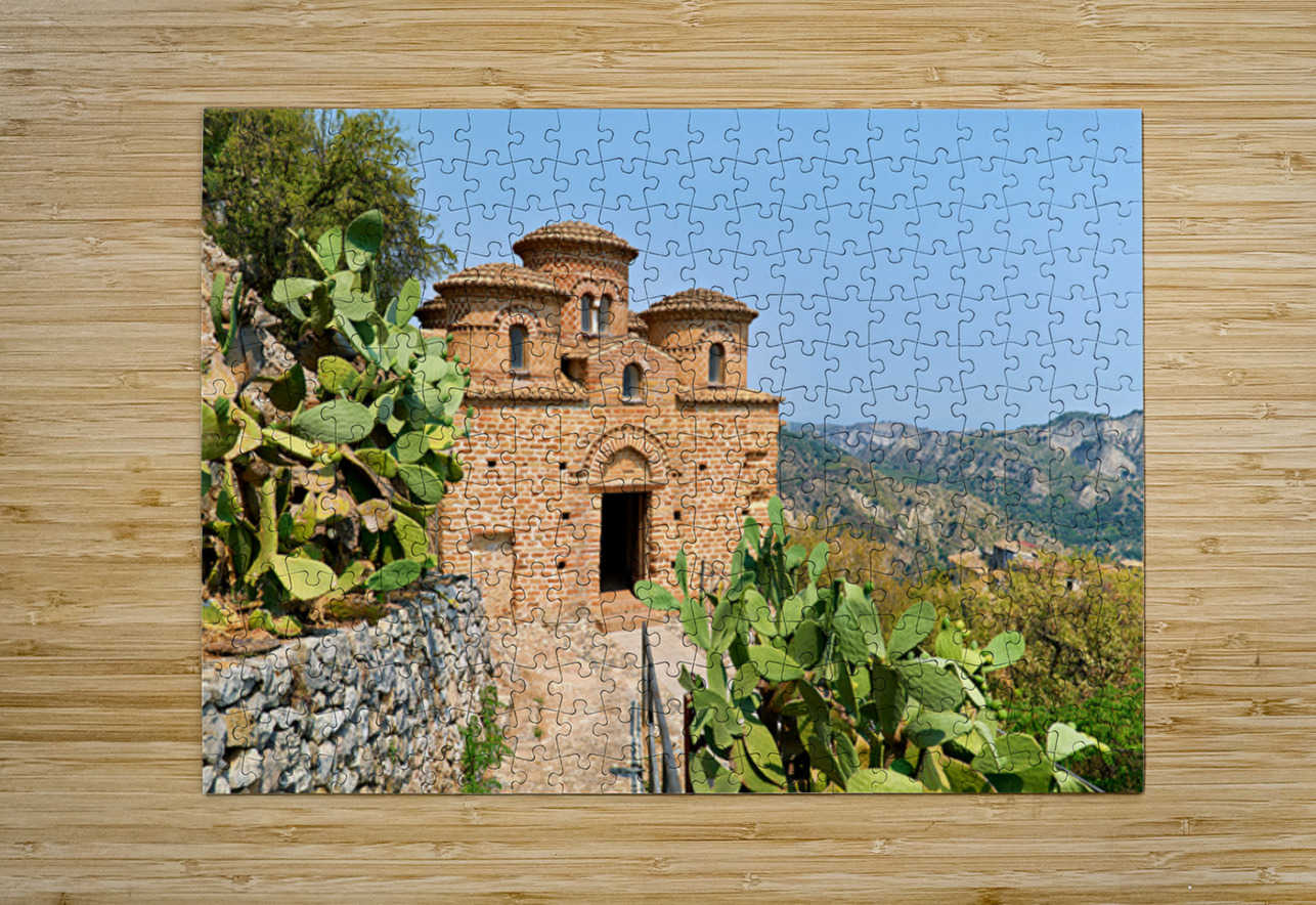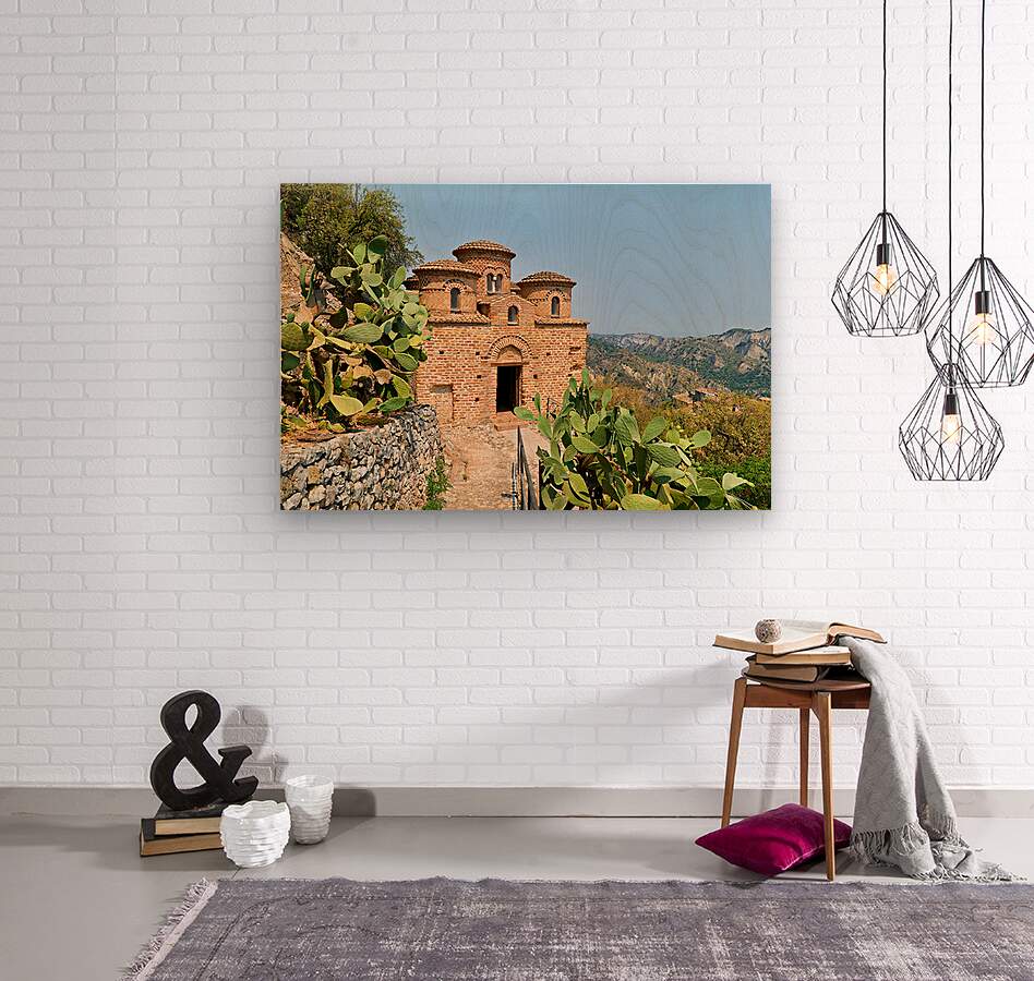 Cattolica di Stilo stands on a hillside showcasing its unique architecture under the blue sky amidst the surrounding landscape.