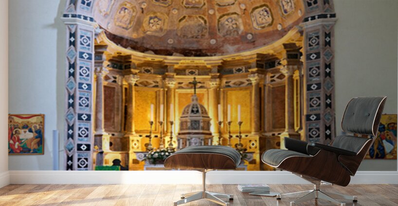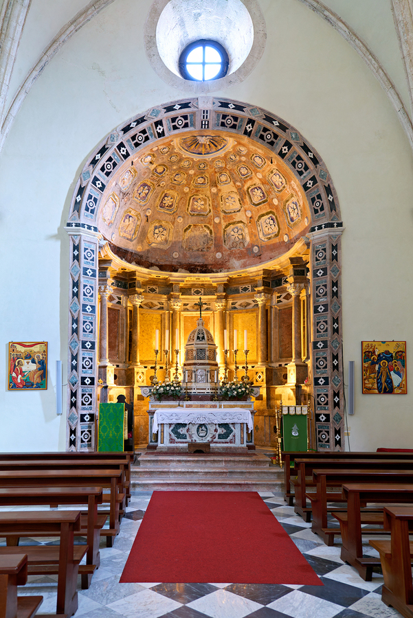 Visitors can see the detailed architecture of the Norman Cathedral in Gerace. The altar is central with wooden benches and colorful art.