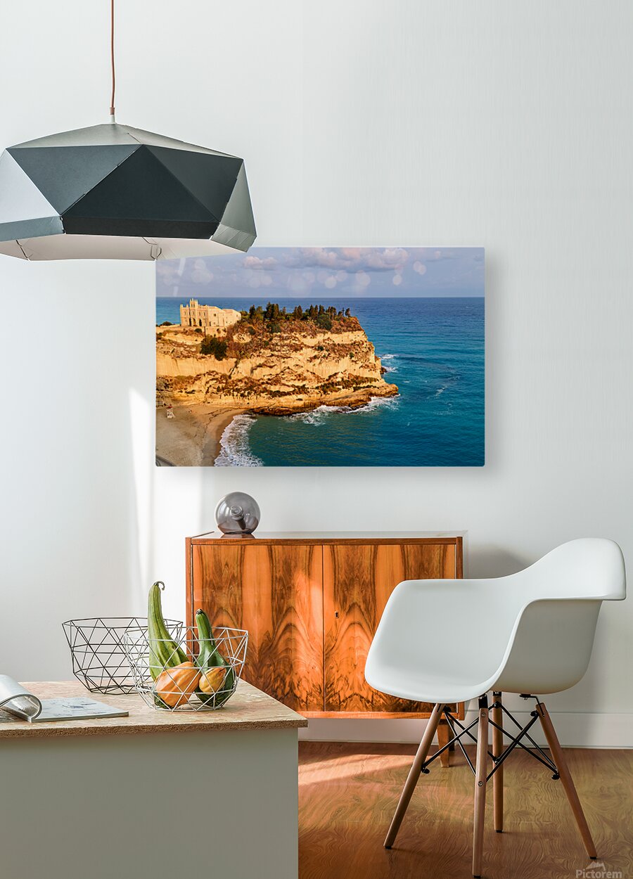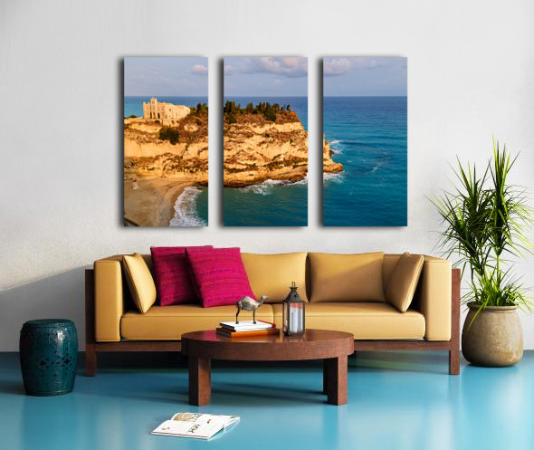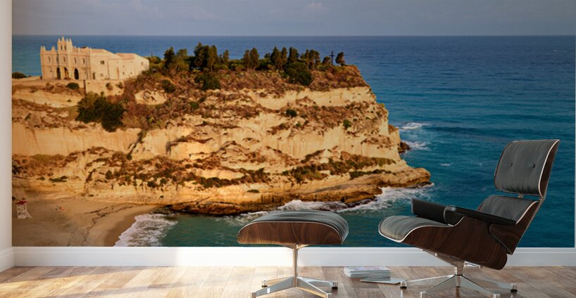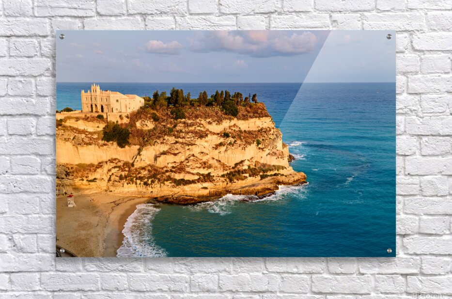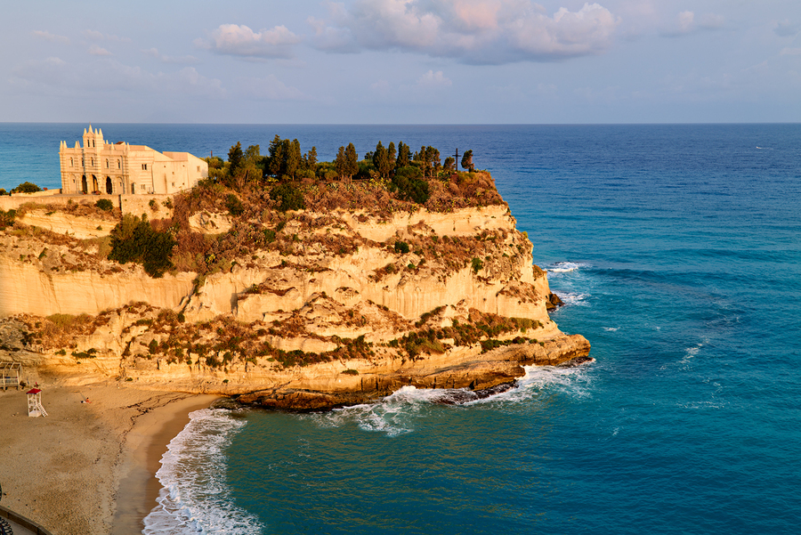At sunrise Santa Maria dellIsola Monastery stands on a cliff in Tropea Calabria surrounded by the waves of the sea and rocky shores.