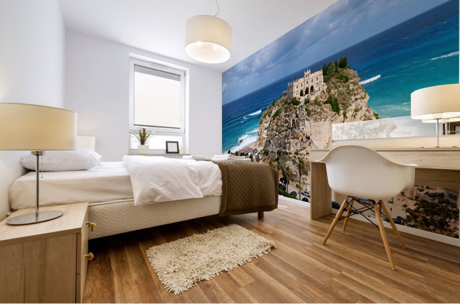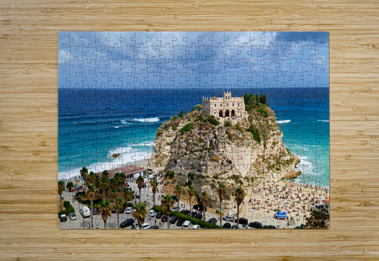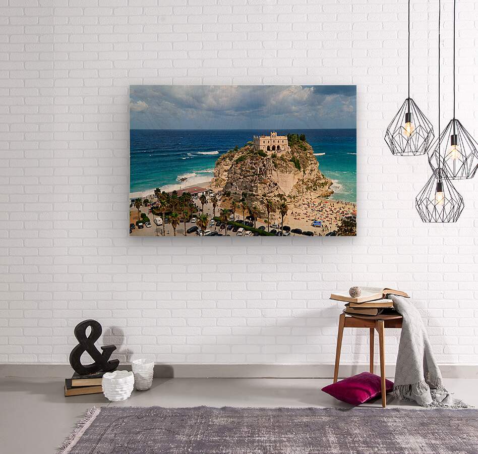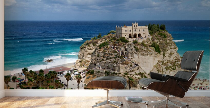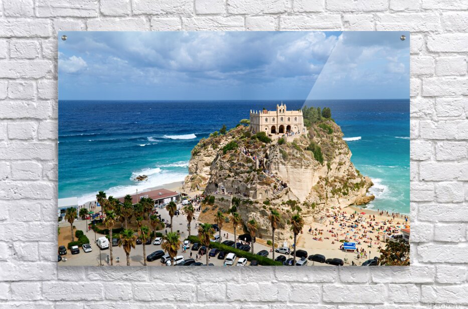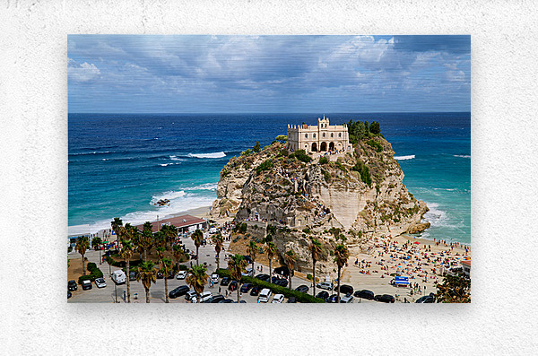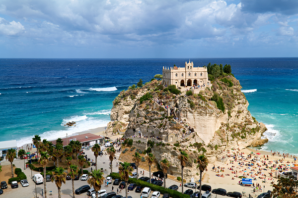 Santa Maria dellIsola Monastery stands on a cliff in Tropea overlooking the sea. People enjoy the beach below while clouds fill the sky.