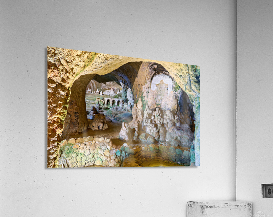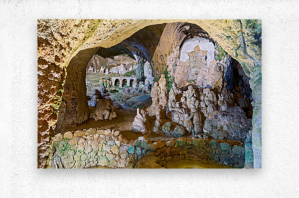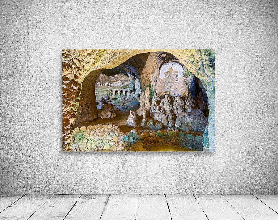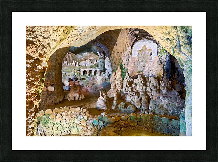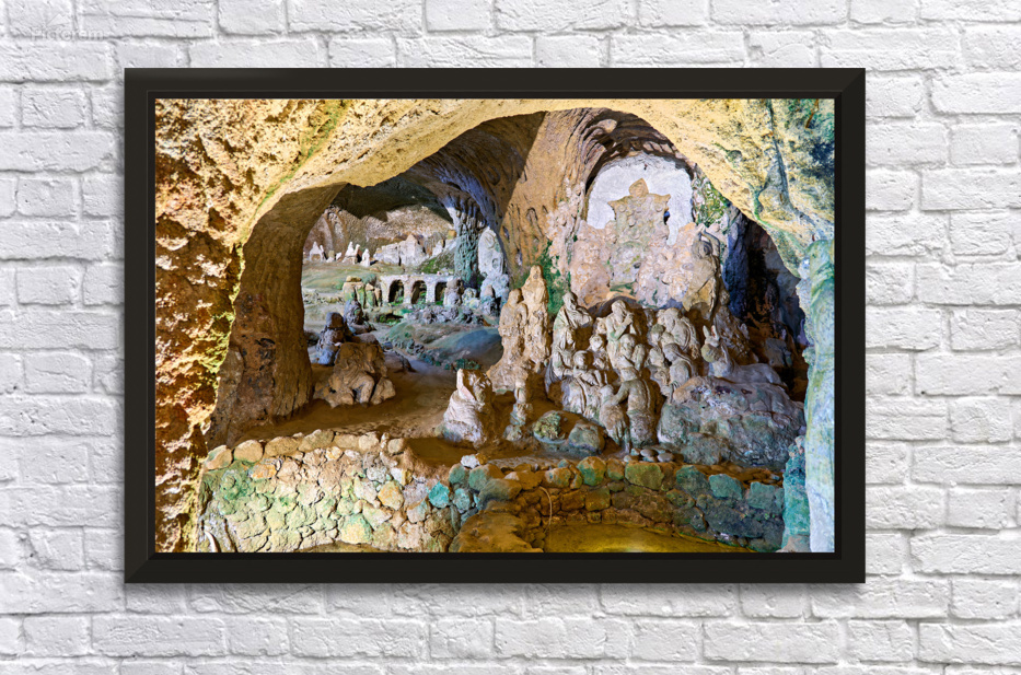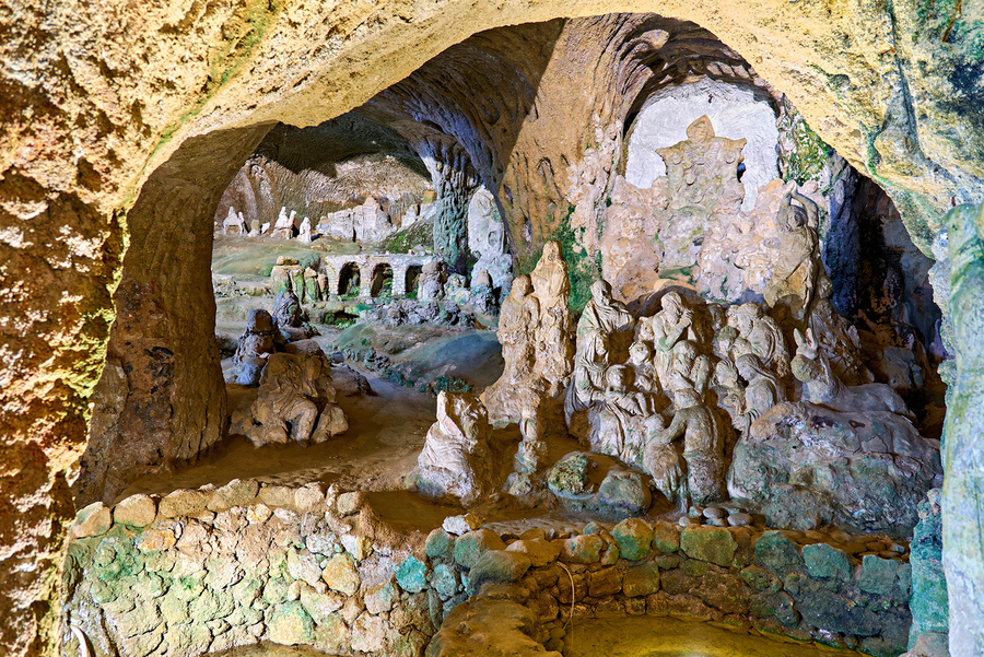 The cave church of Piedigrotta in Pizzo Calabro features unique rock formations and sculptures. Visitors explore this historical site.