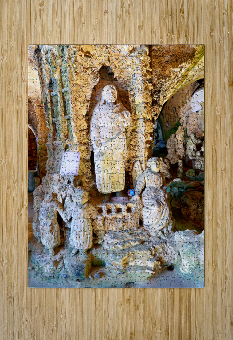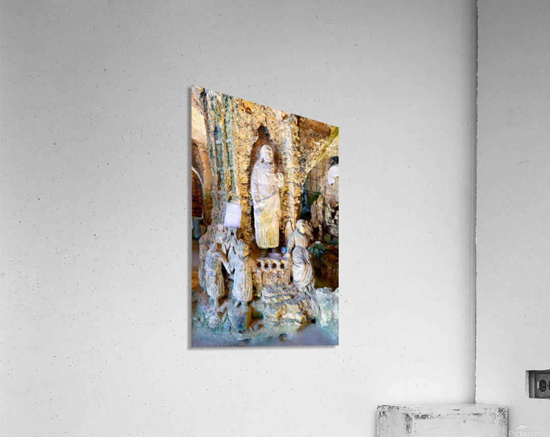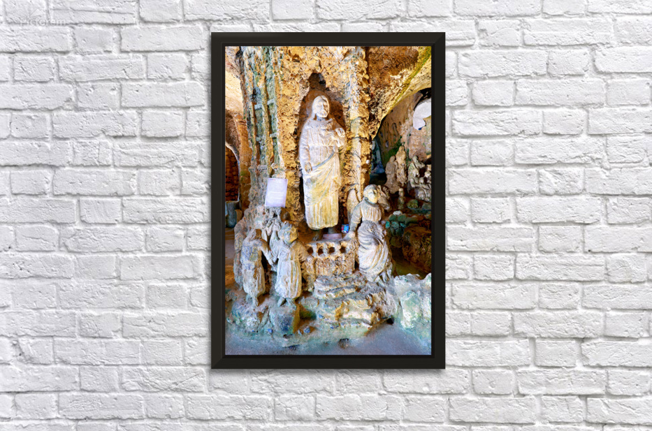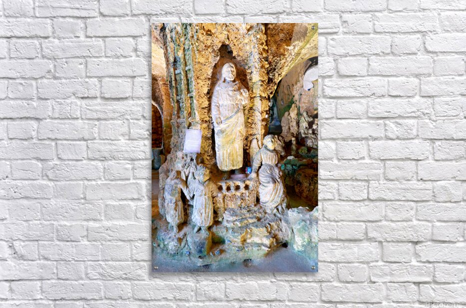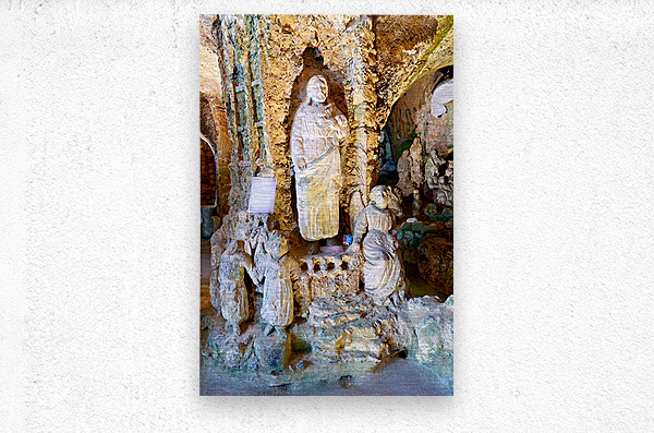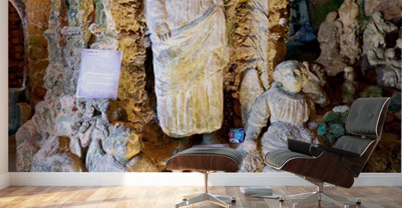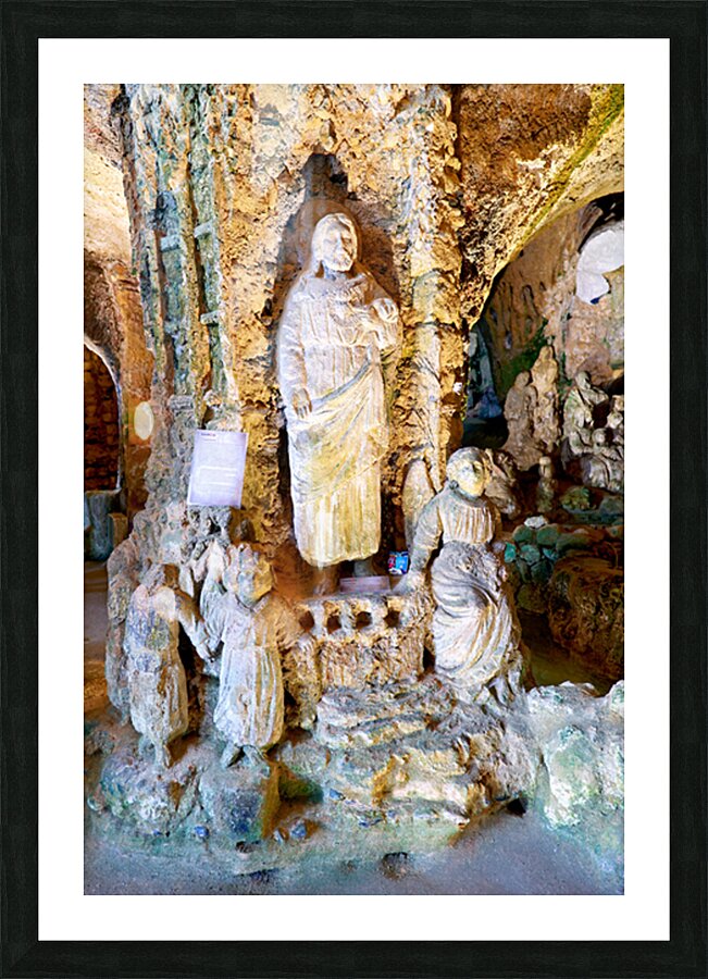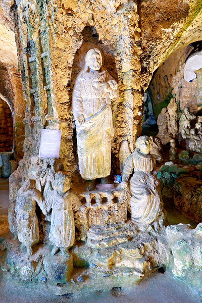 Visitors admire stone statues in the cave church of Piedigrotta Pizzo Calabro Calabria. The church showcases intricate sculptures and religious art.
