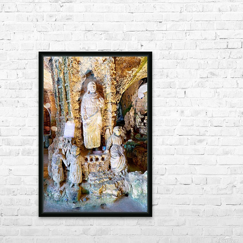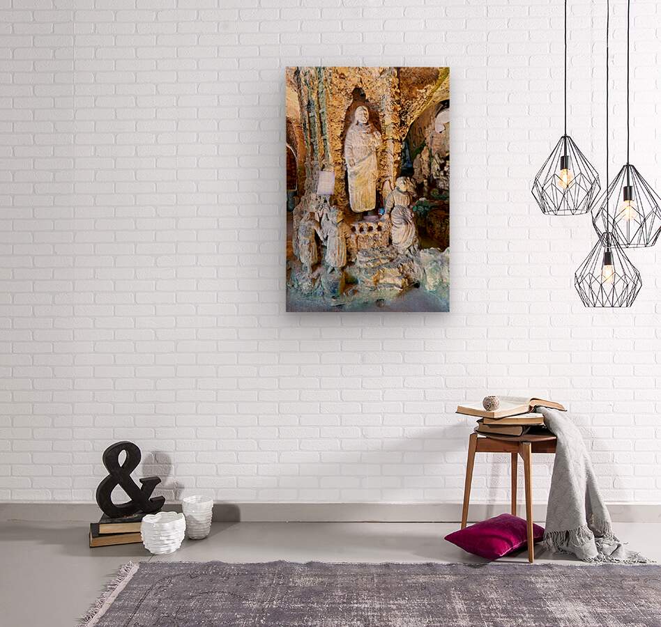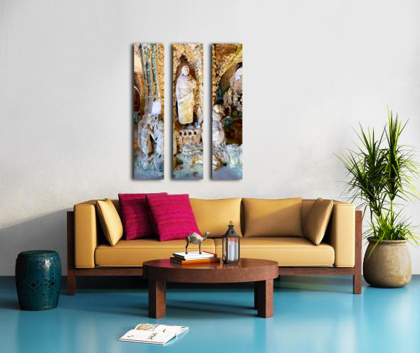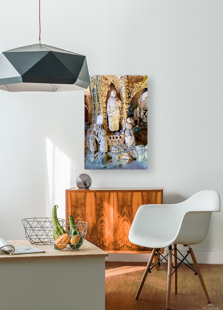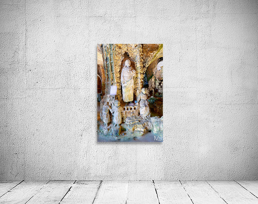 Visitors admire stone statues in the cave church of Piedigrotta Pizzo Calabro Calabria. The church showcases intricate sculptures and religious art.