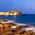 Sunset reveals Aragon castle at Le Castella in Calabria Italy. Waves crash on rocks by the seaside as the castle lights up.