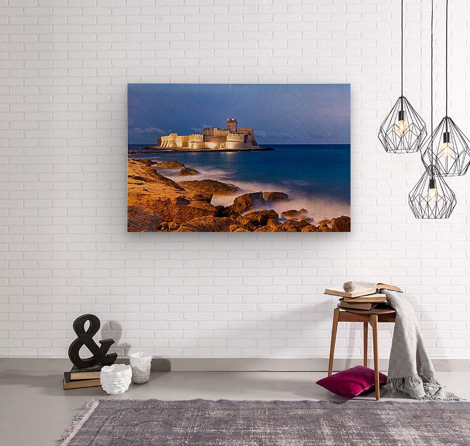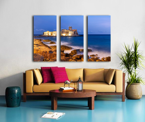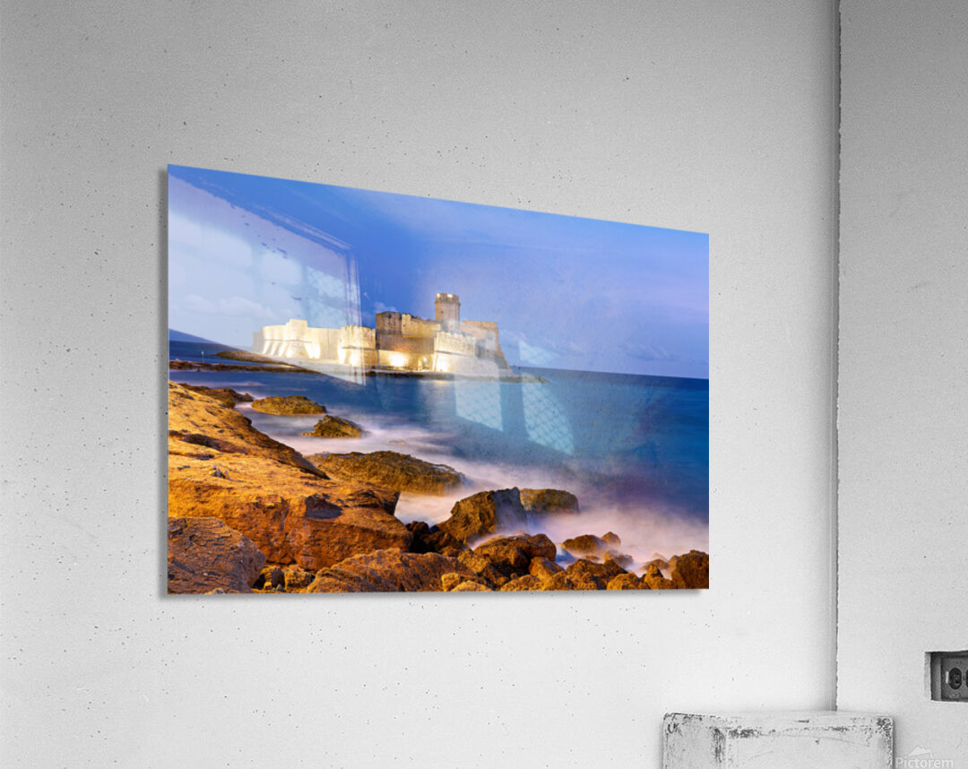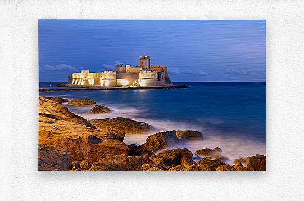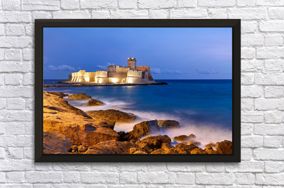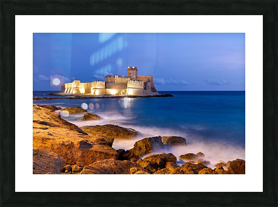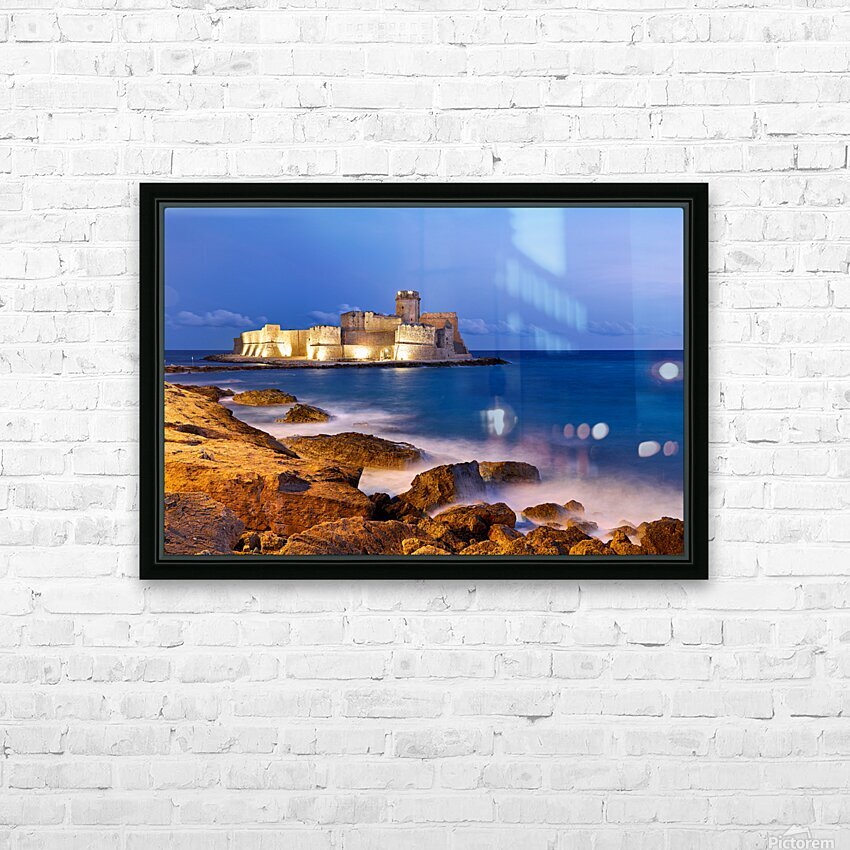 "Sunset reveals Aragon castle at Le Castella in Calabria Italy" in a framed print.