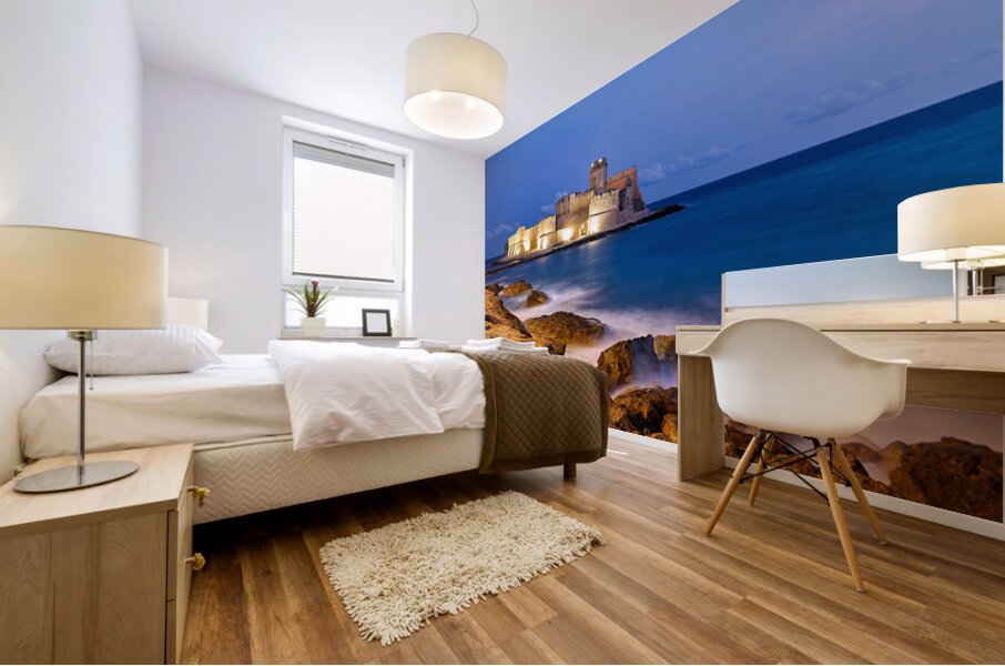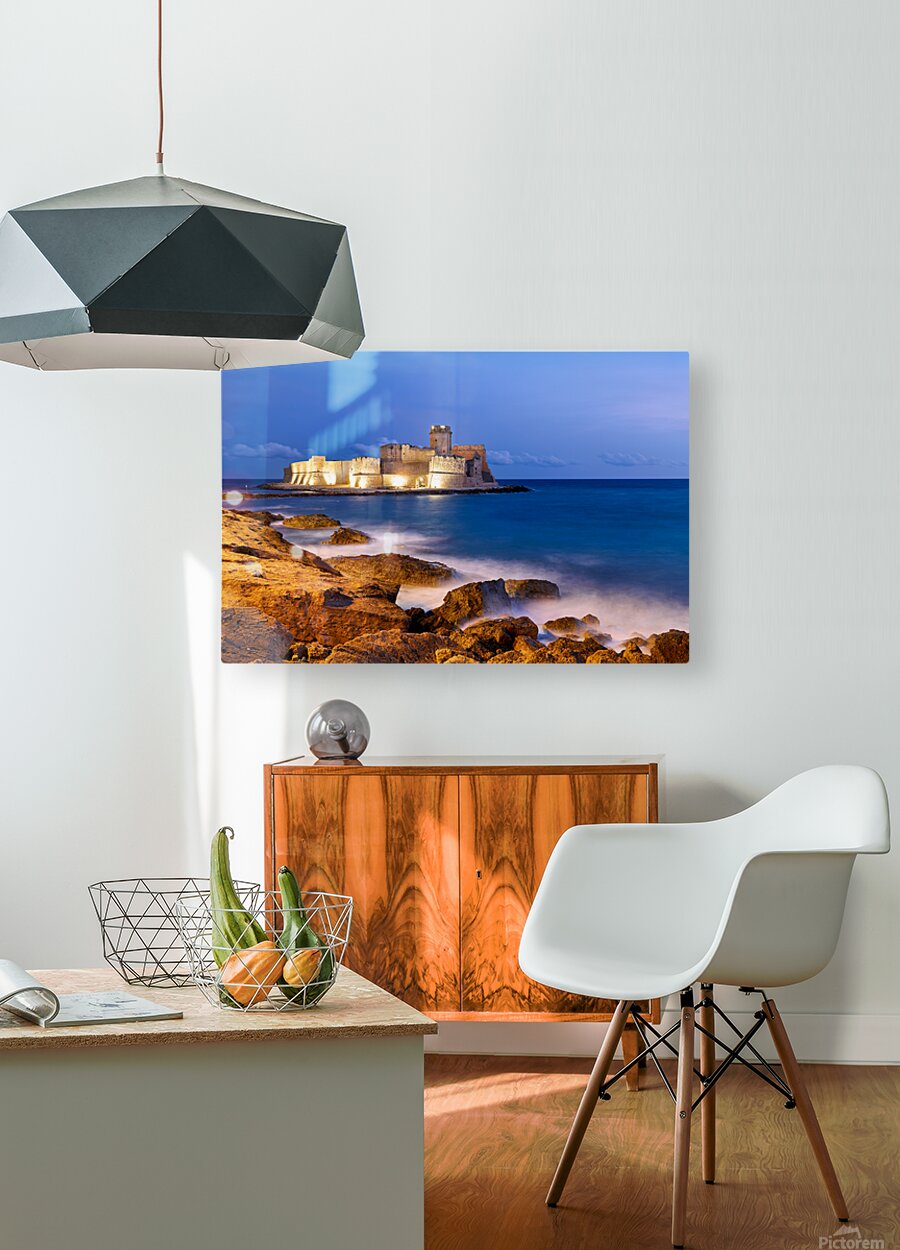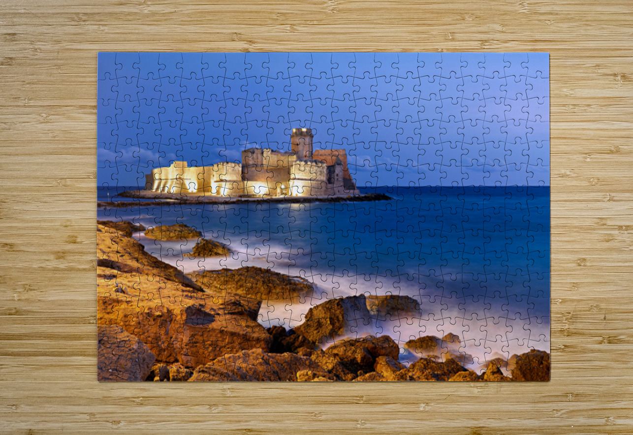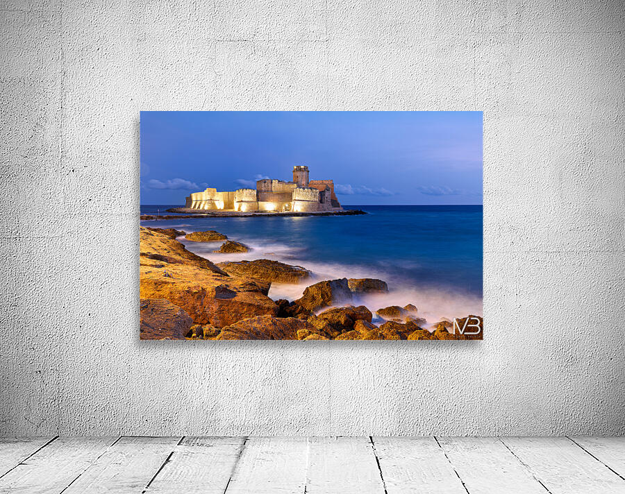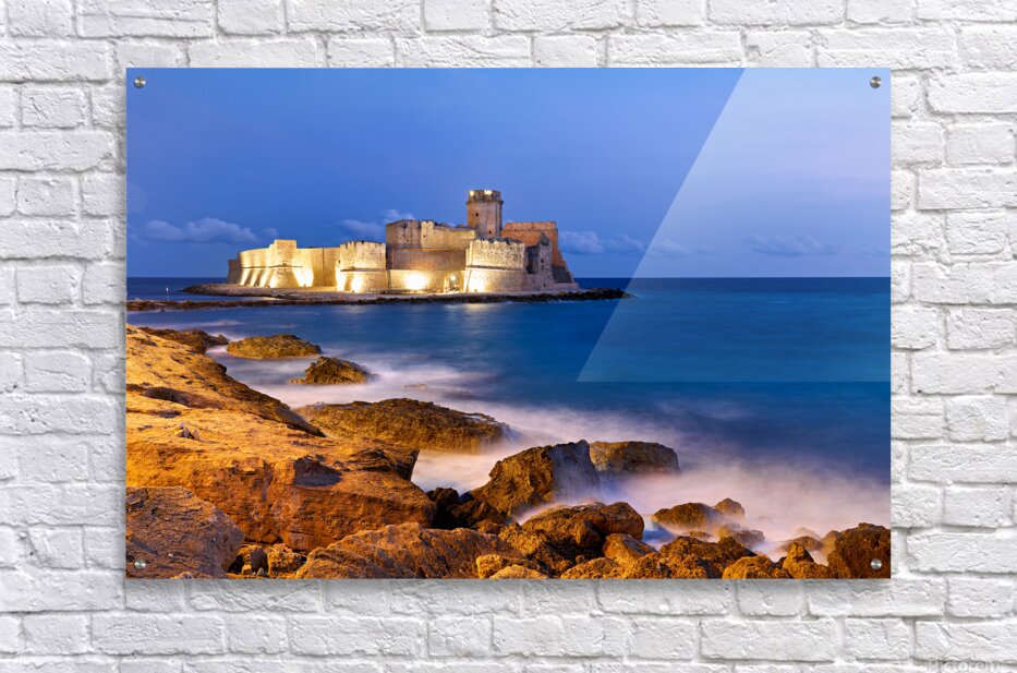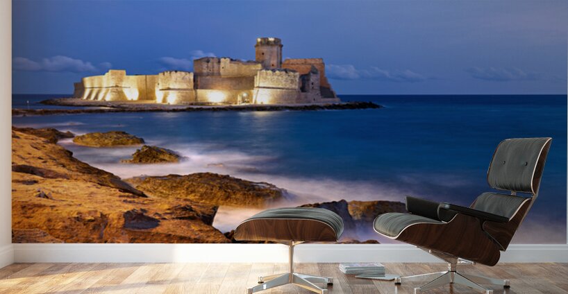 "Sunset reveals Aragon castle at Le Castella in Calabria Italy" in a framed print.