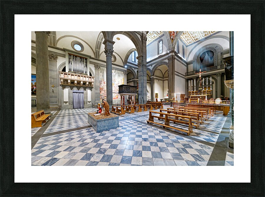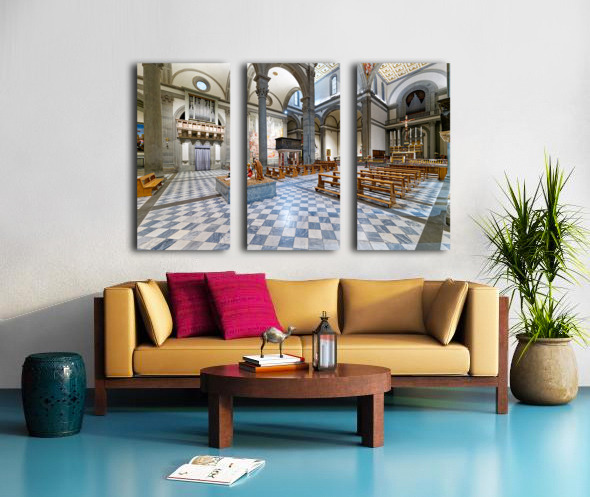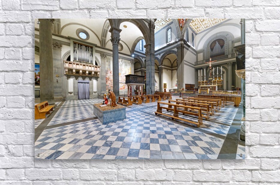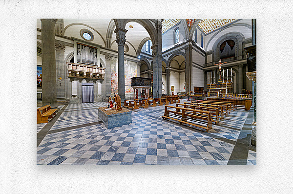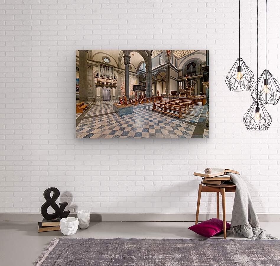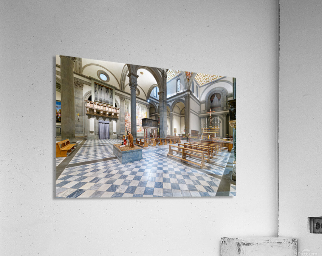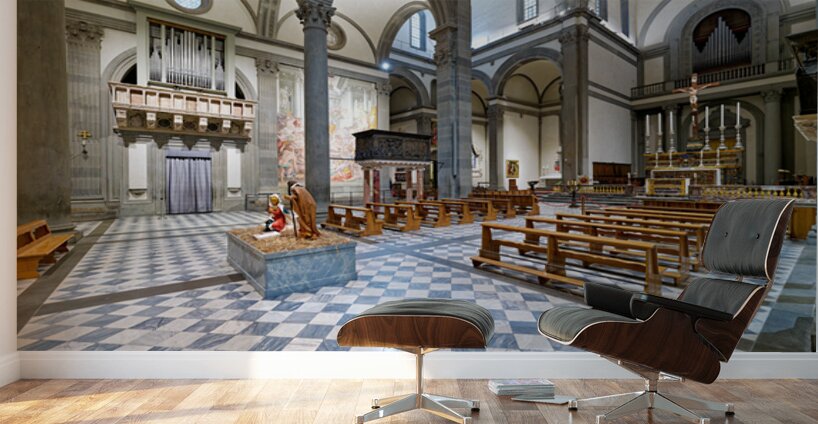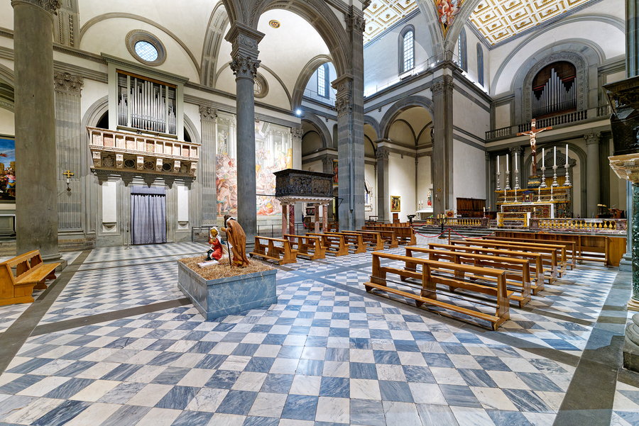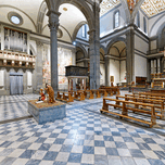 People explore the Basilica of San Lorenzo in Florence Tuscany. They admire the architecture and the art inside the church.