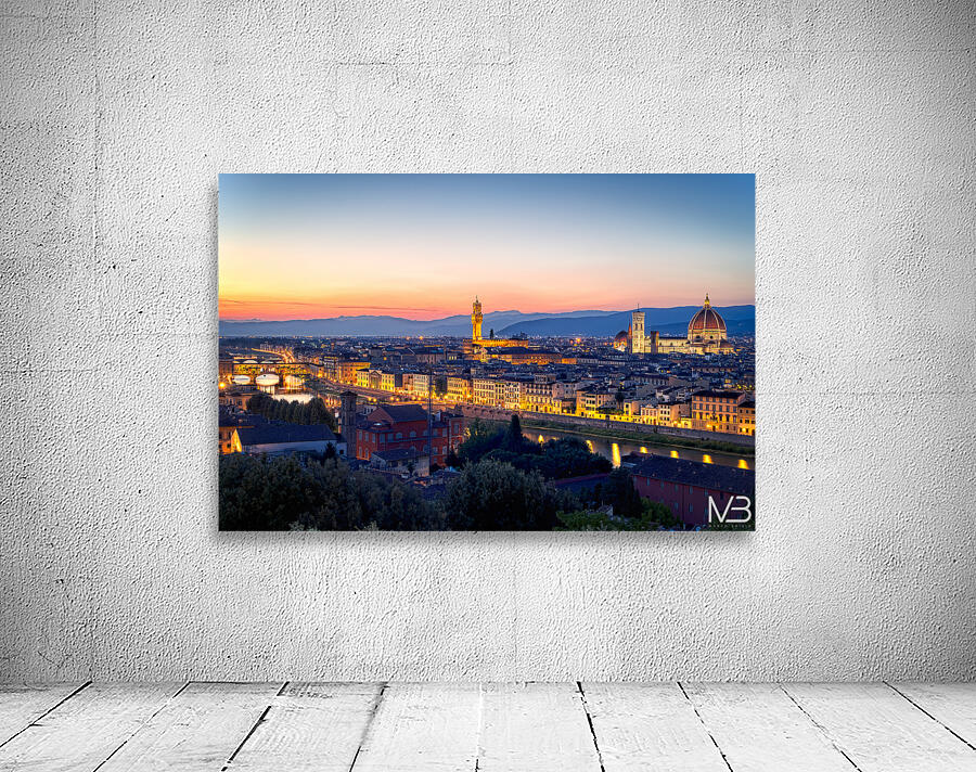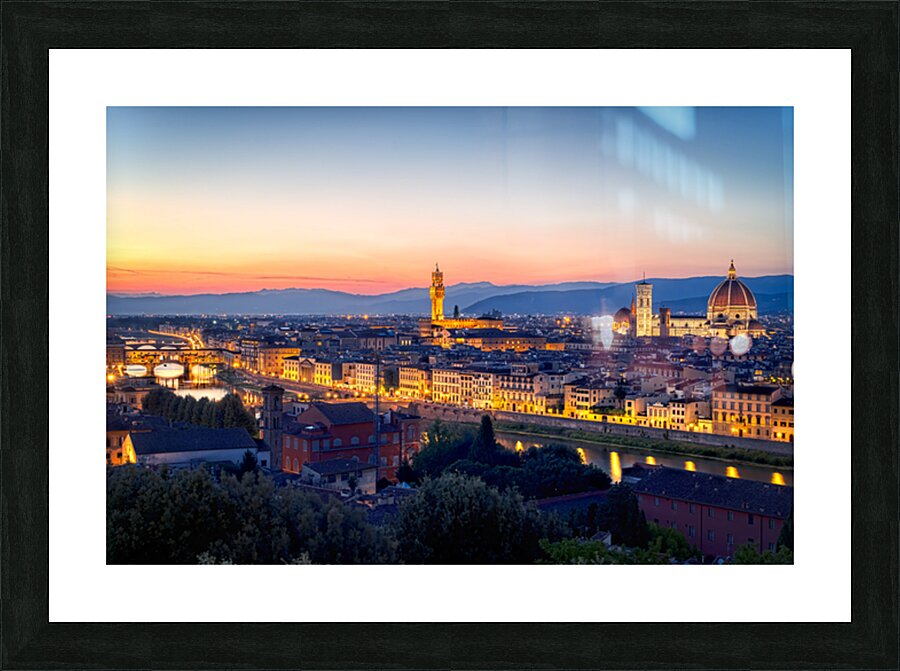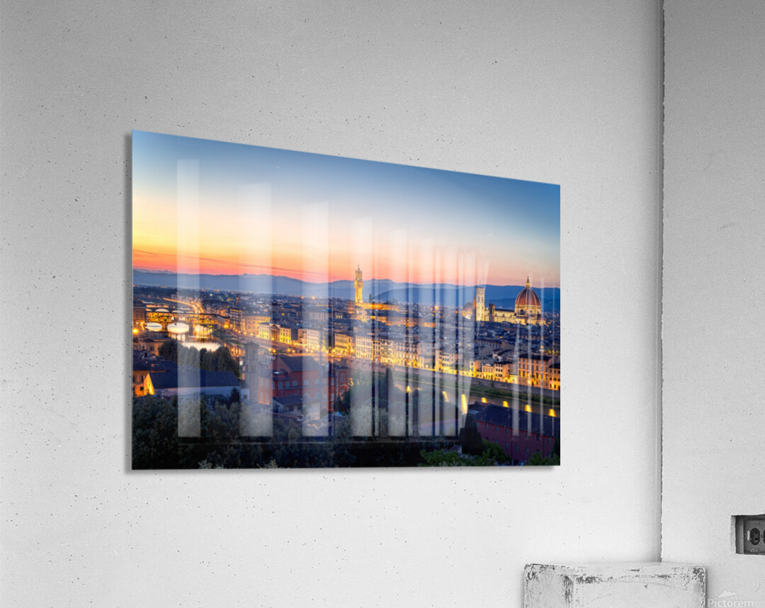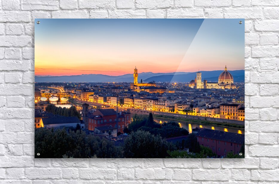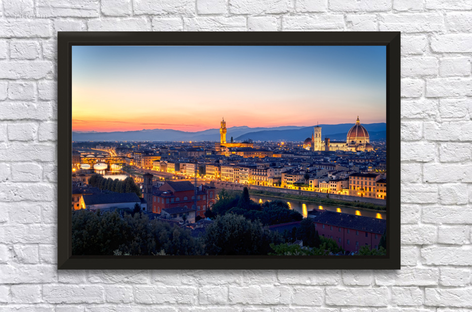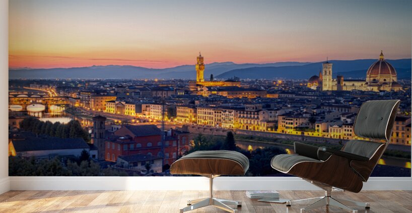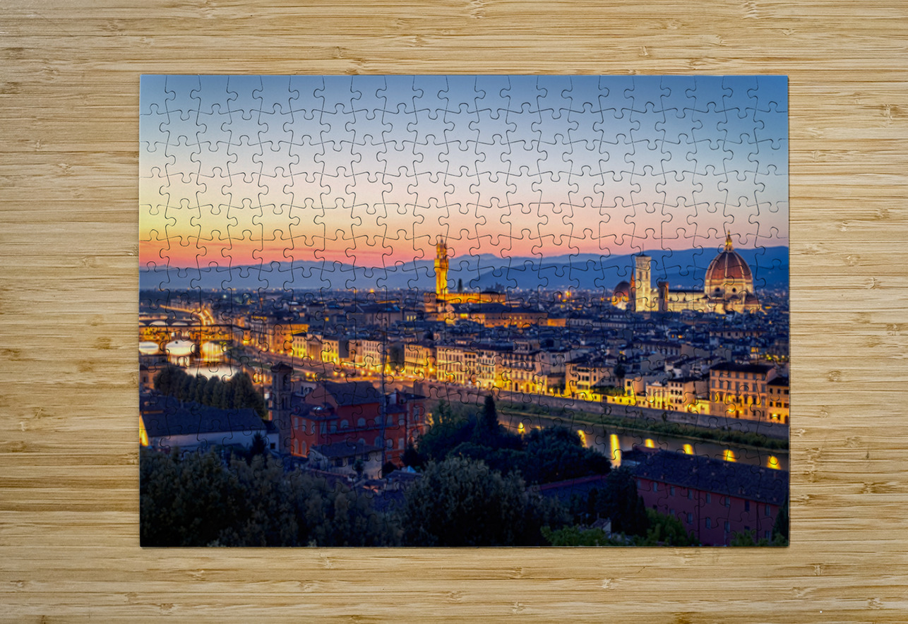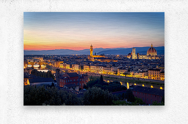 The city of Florence shows its buildings and lights as dusk falls over the skyline and hills capturing the essence of a vibrant evening.