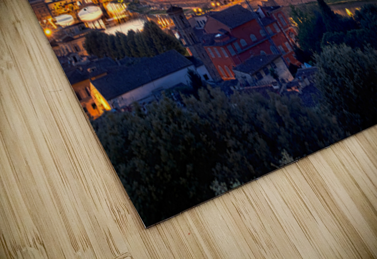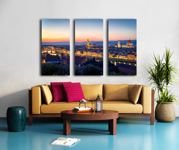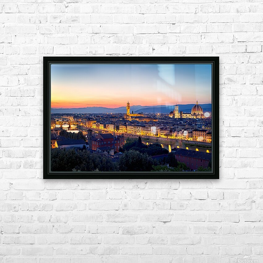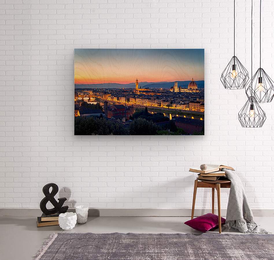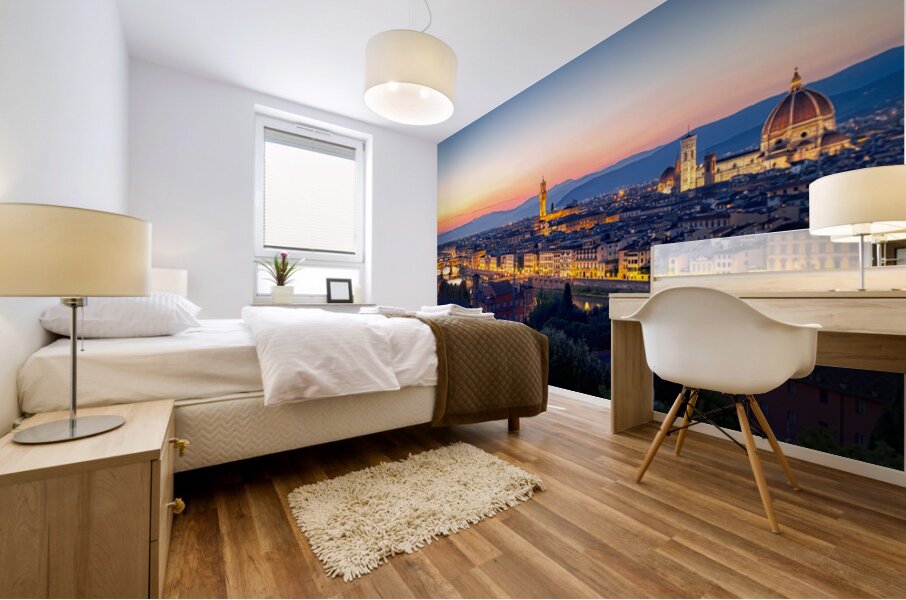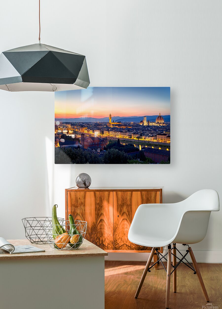 The city of Florence shows its buildings and lights as dusk falls over the skyline and hills capturing the essence of a vibrant evening.