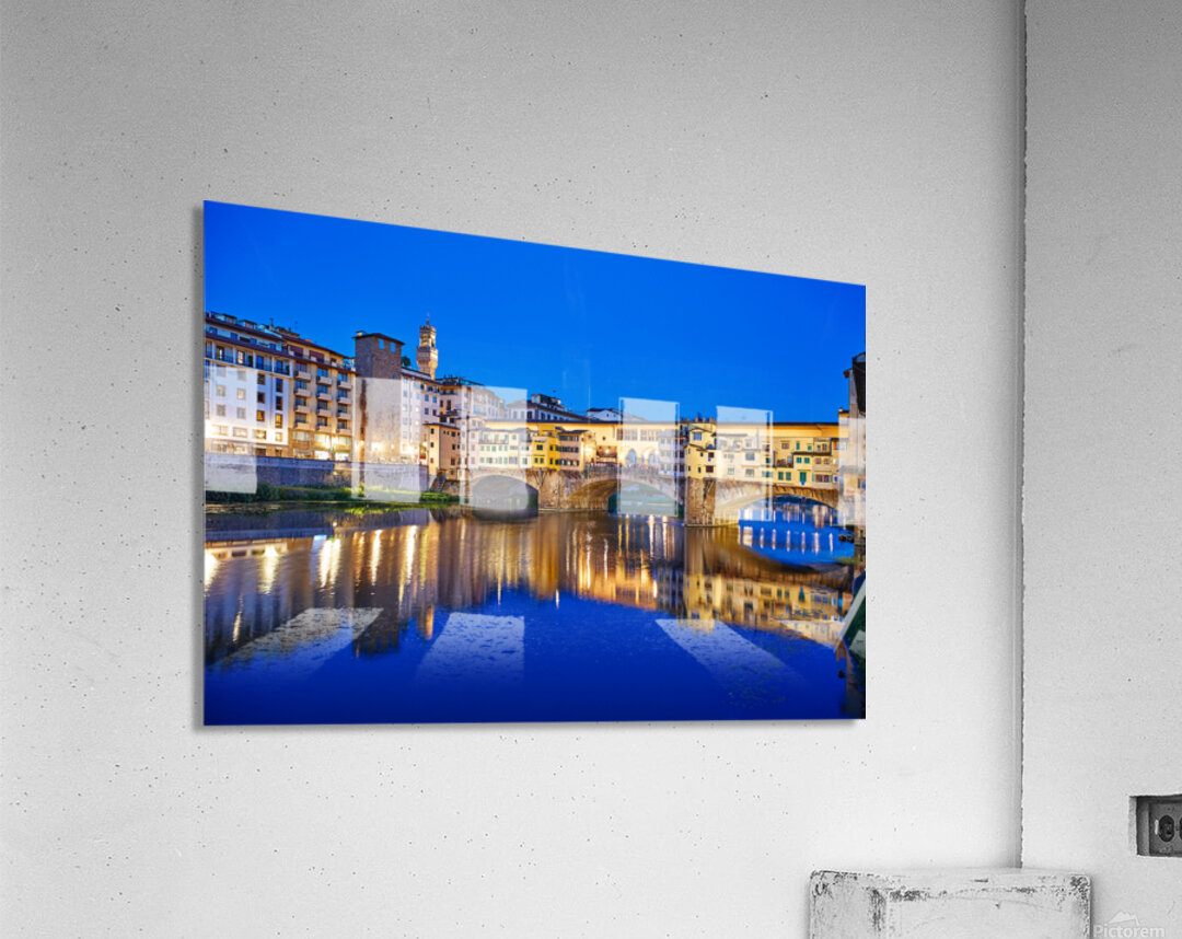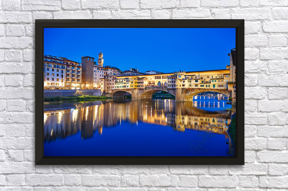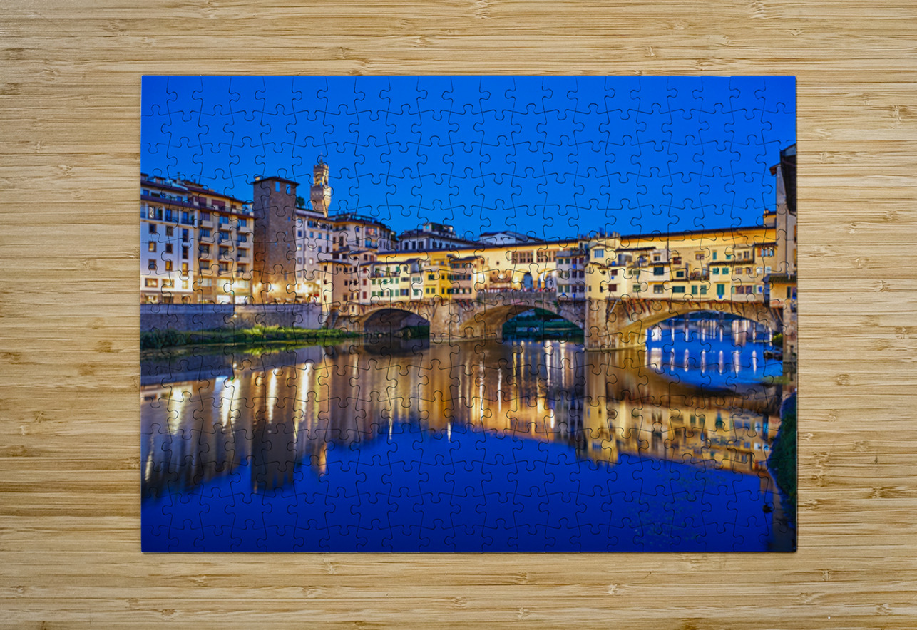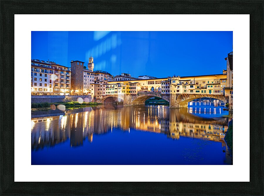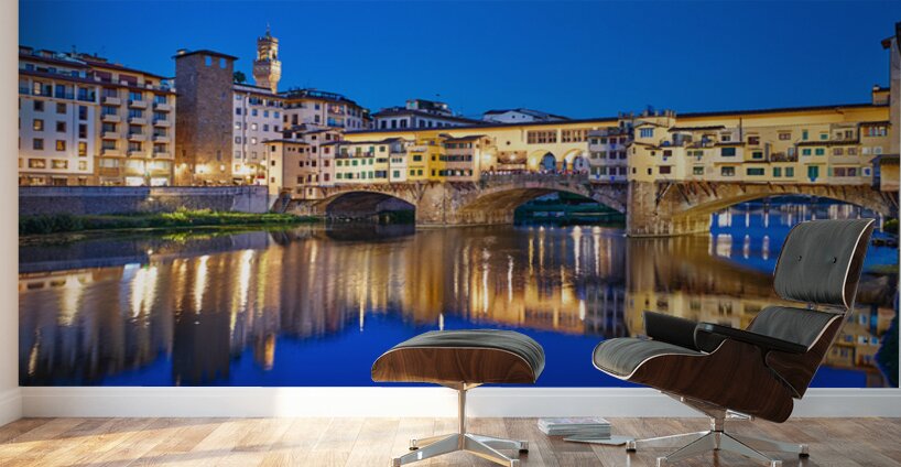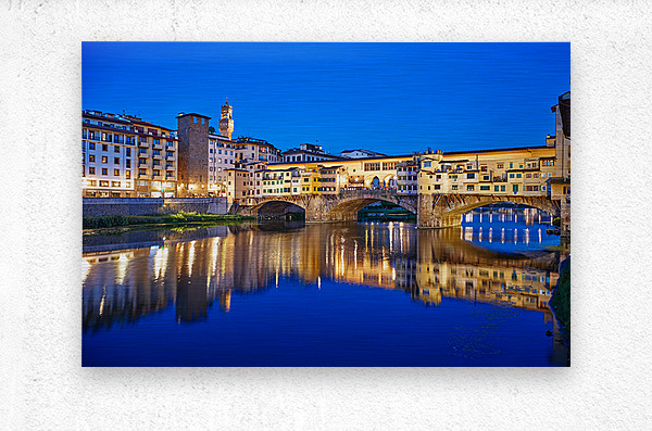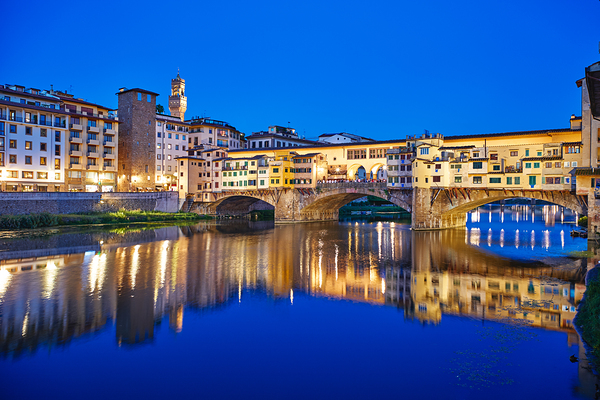 Ponte Vecchio stands over the Arno river as the sun sets in Florence. Buildings reflect in the waters surface creating a beautiful scene.