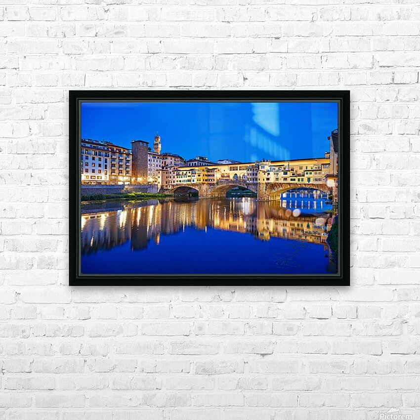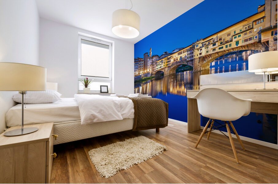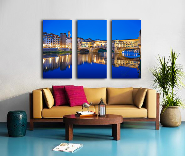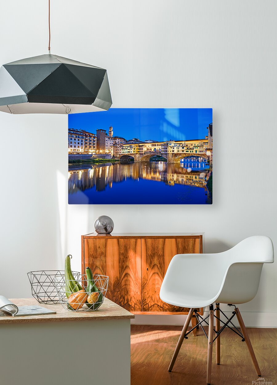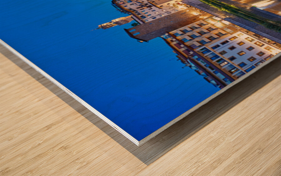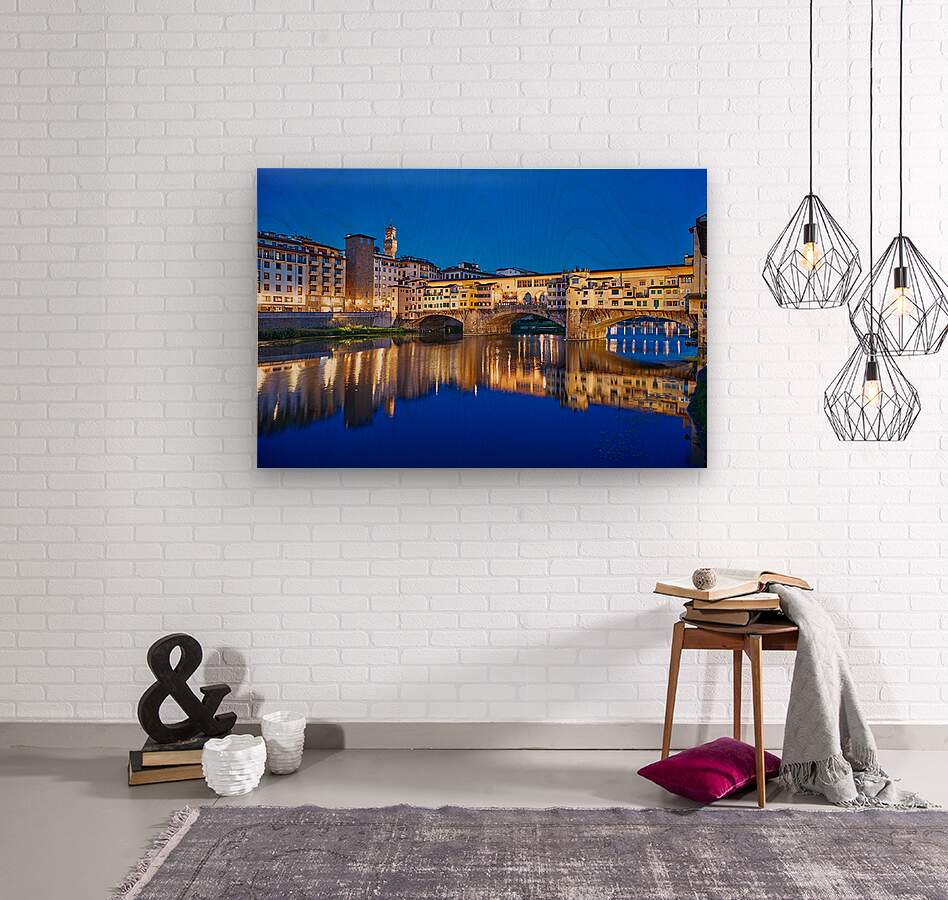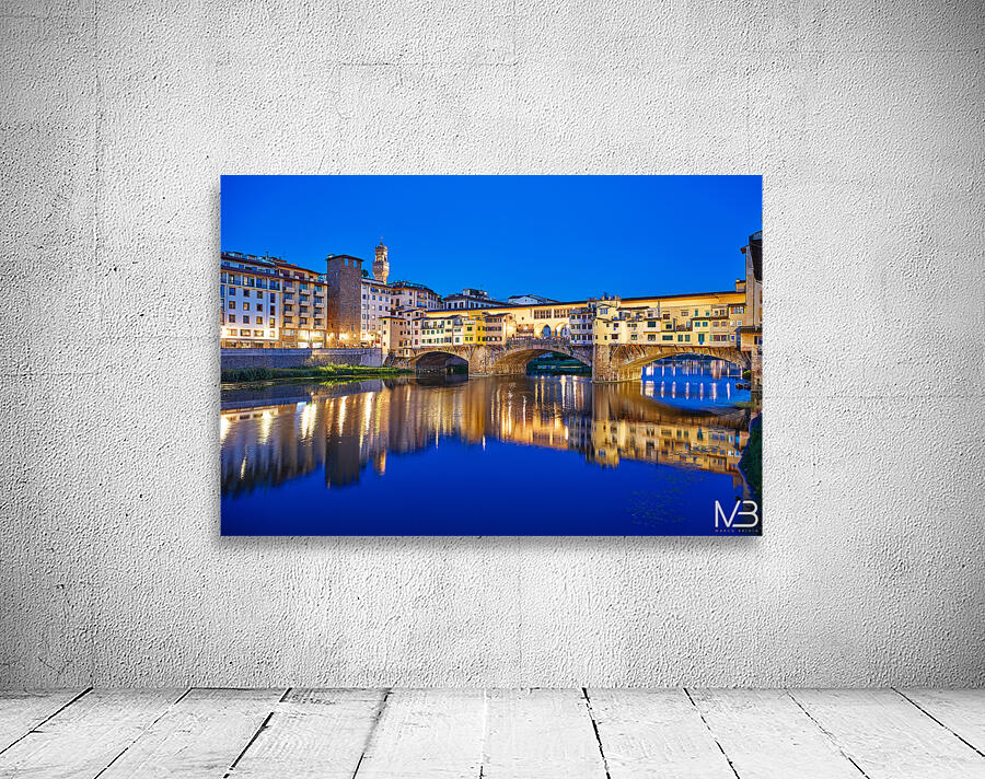 Ponte Vecchio stands over the Arno river as the sun sets in Florence. Buildings reflect in the waters surface creating a beautiful scene.