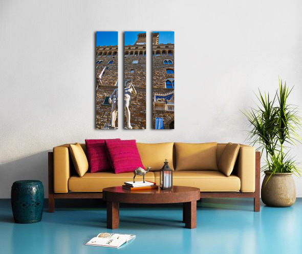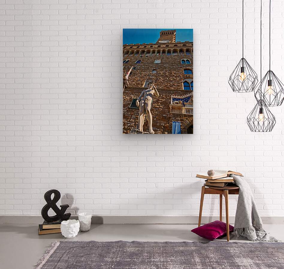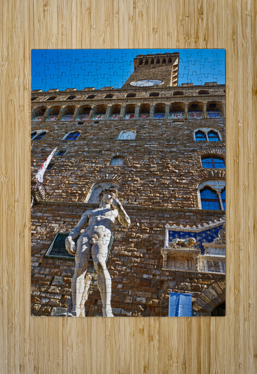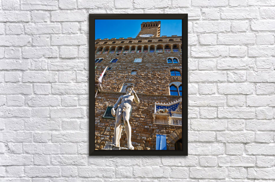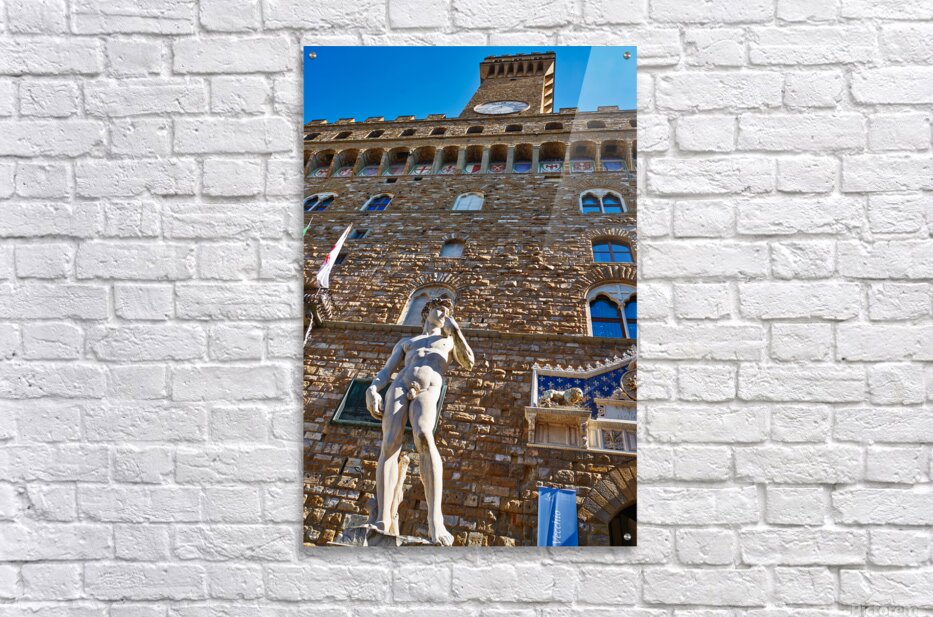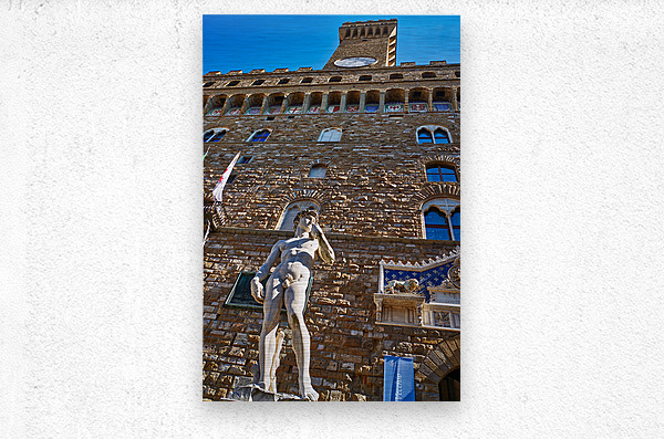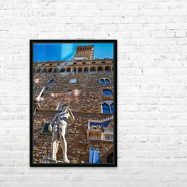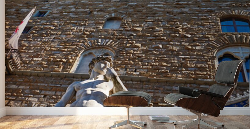 The statue of David stands in front of Palazzo Vecchio in Florence. People visit to admire the famous work of art every day.