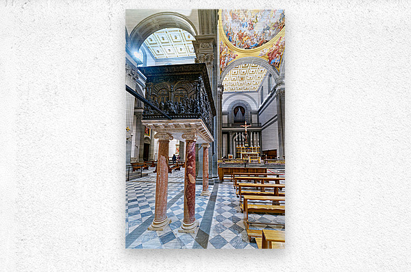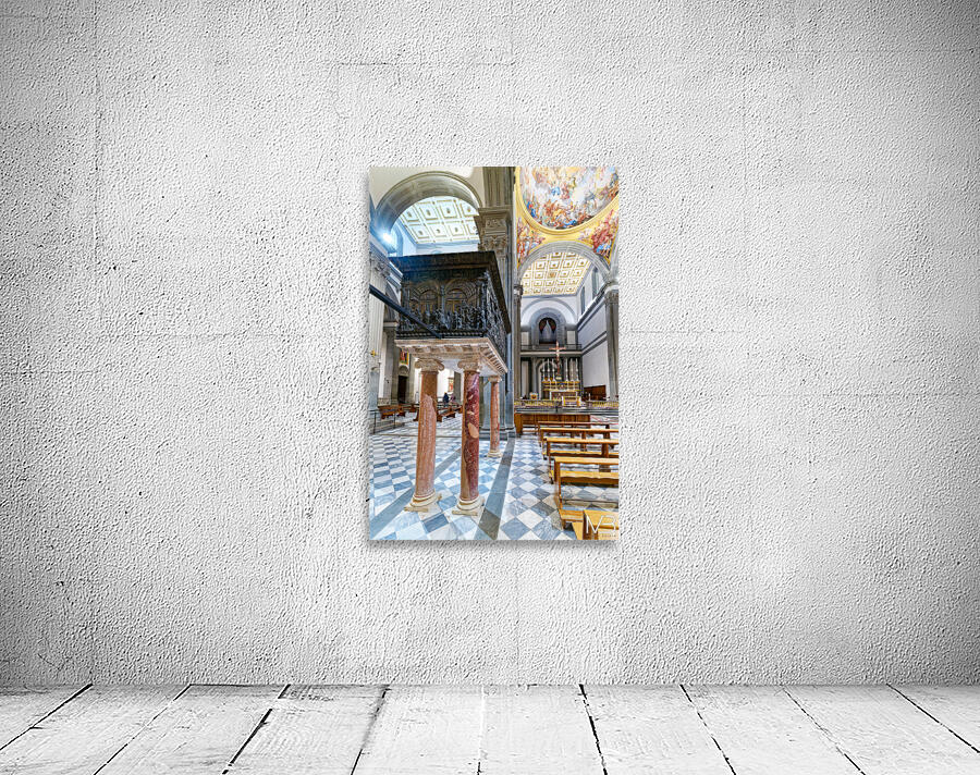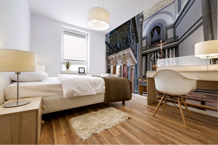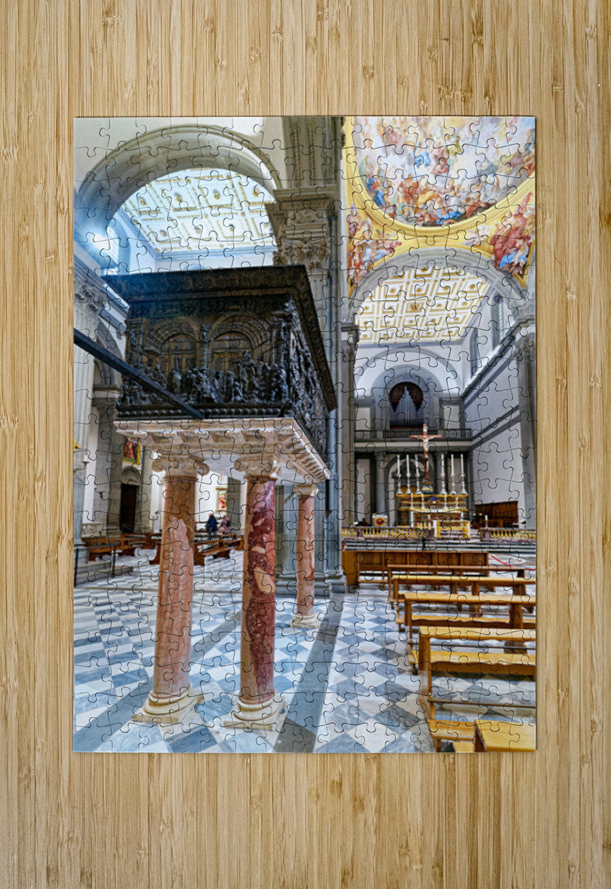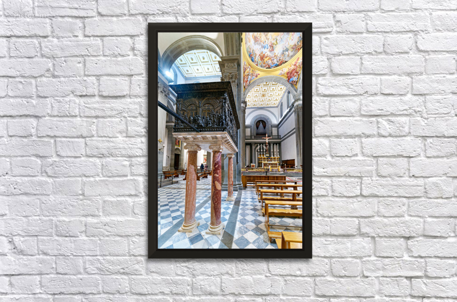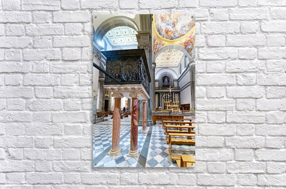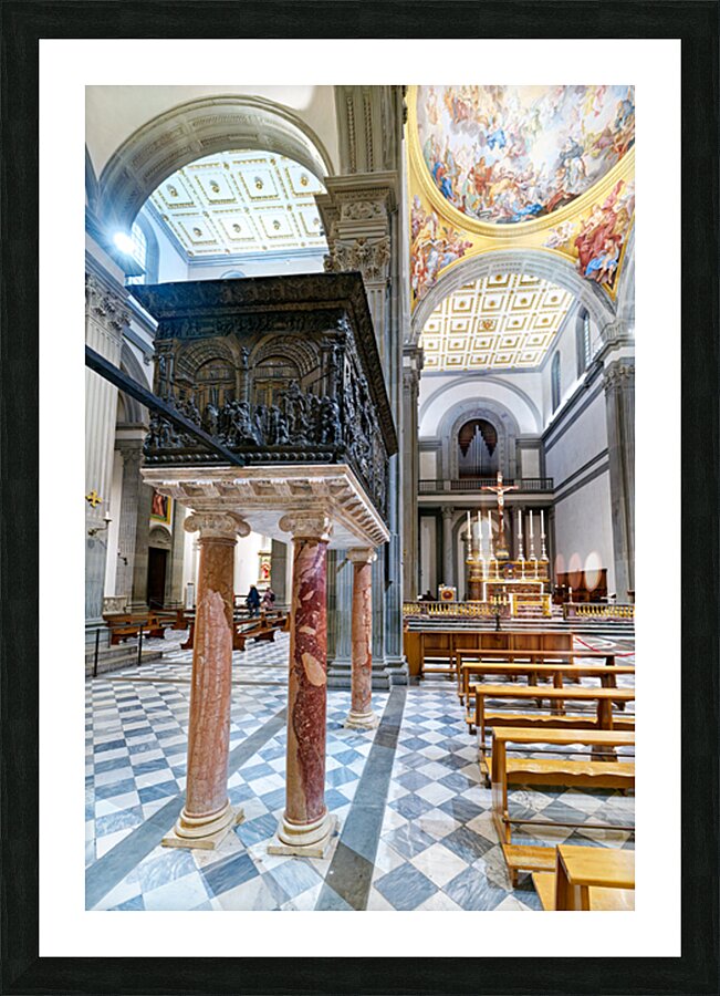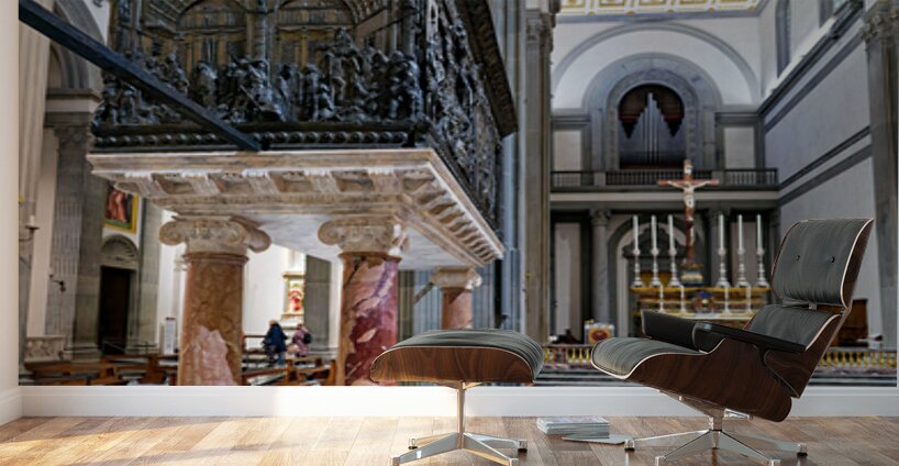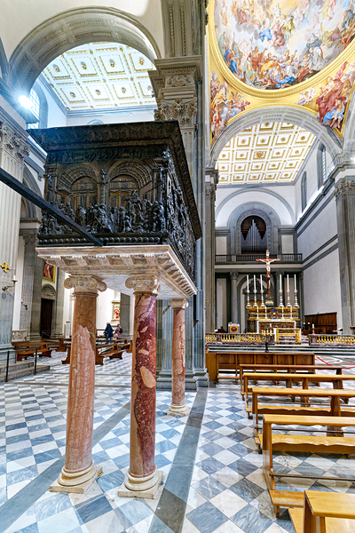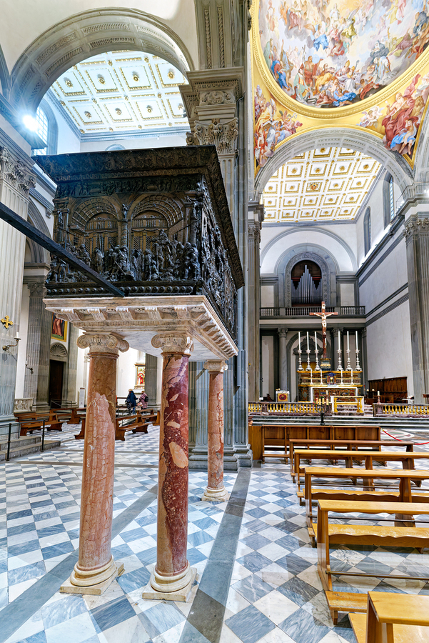 The pulpit sits on columns in the Basilica of San Lorenzo. People visit the church and admire the details on the pulpit and the architecture.