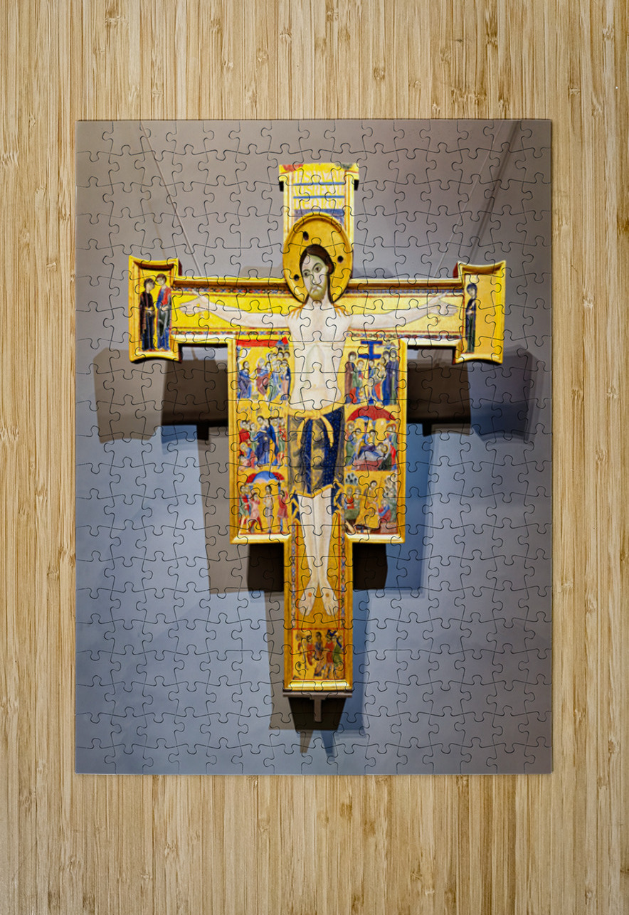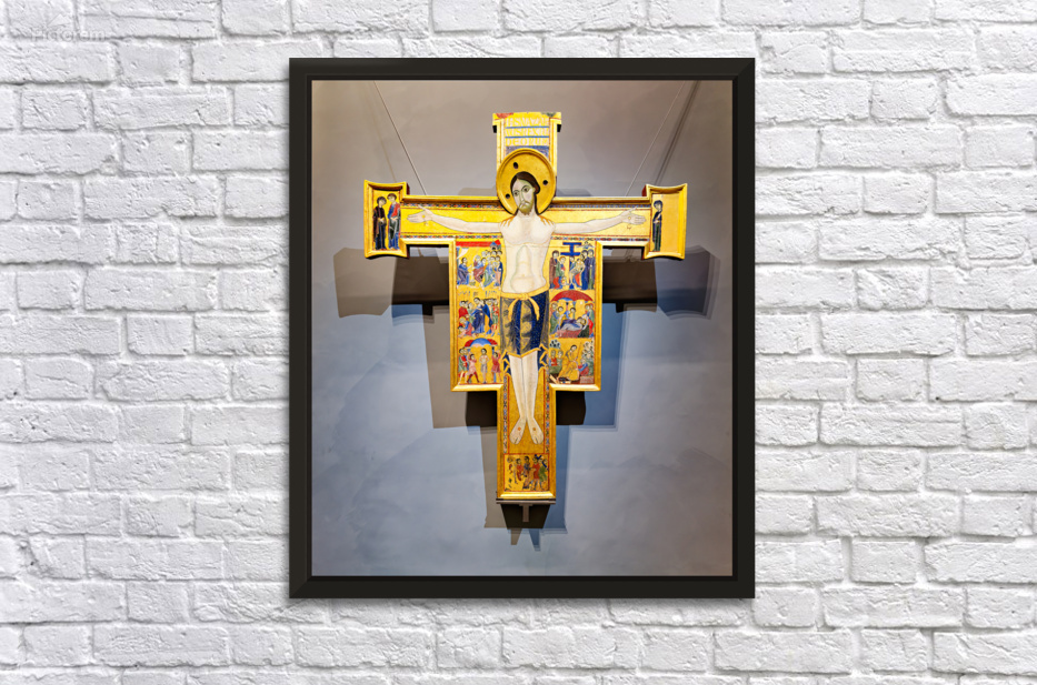 Visitors observe the Crucifix with scenes from the life of Christ created by Maestro della Croce at the Uffizi Gallery in Florence Italy.
