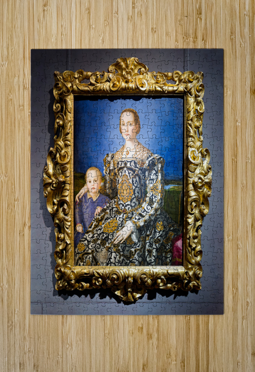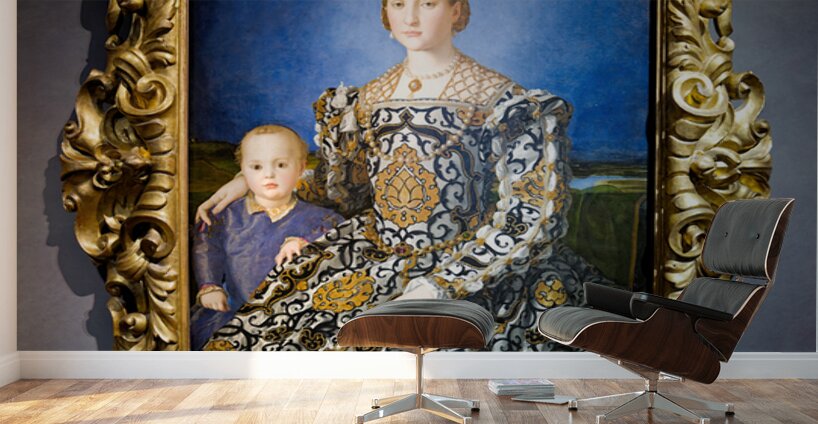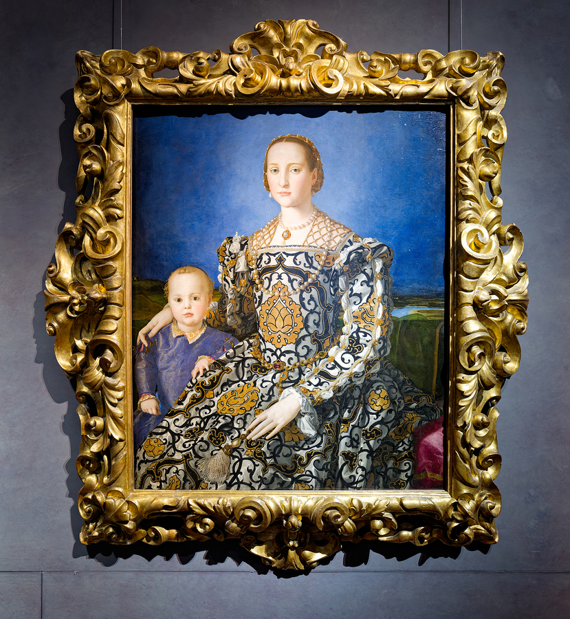 Eleonora of Toledo seated with her son Giovanni in the Uffizi Gallery in Florence Italy. The scene captures royal elegance.
