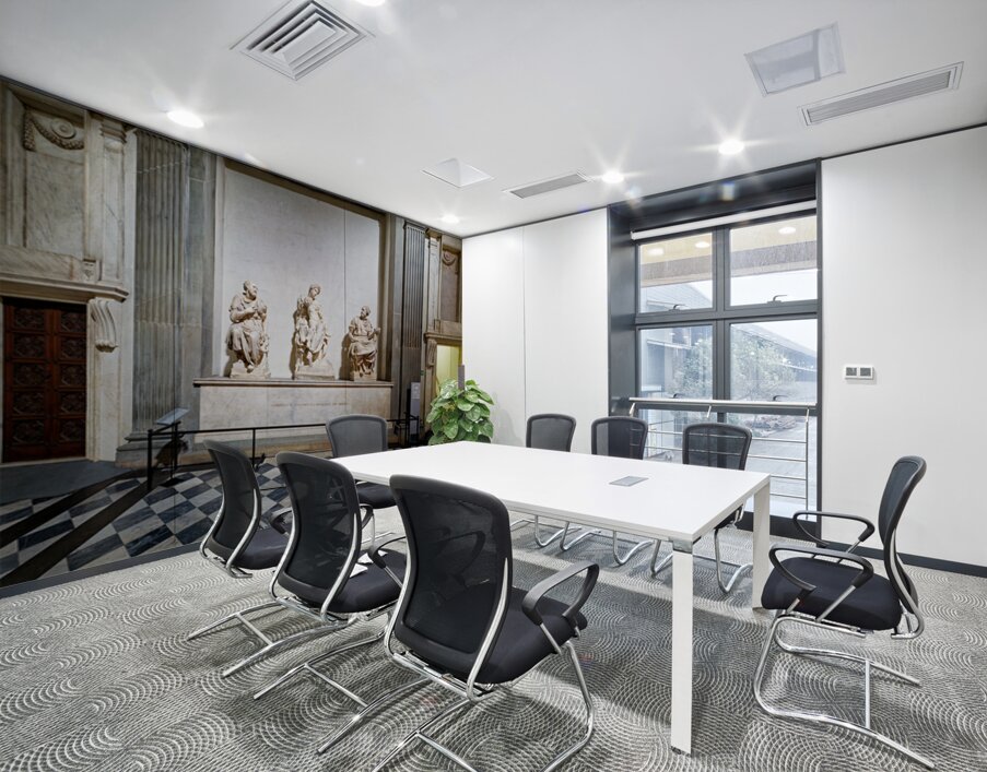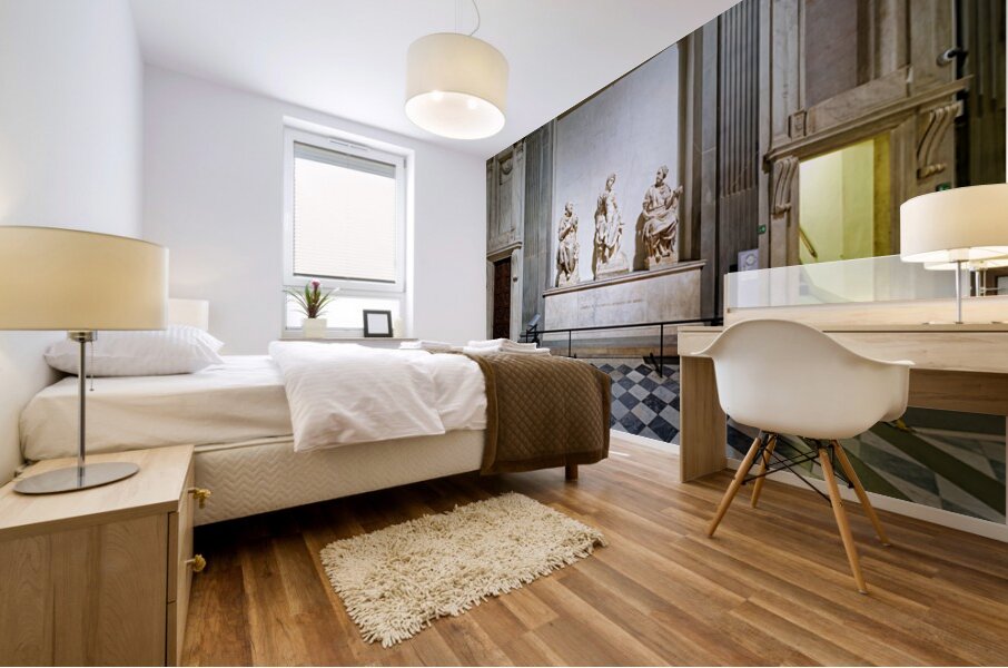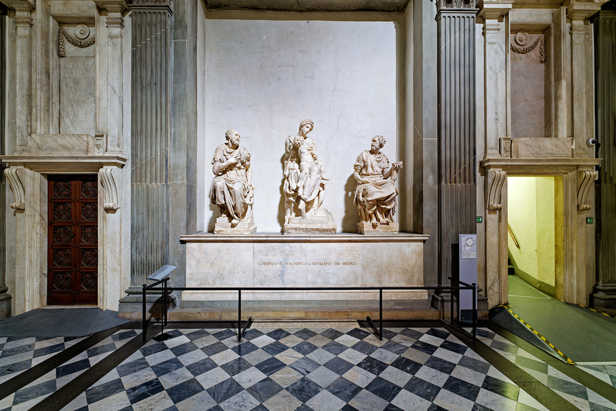 Visitors admire Michelangelos Madonna and Child sculpture in the New Sacristy of the Medici Chapels in Florence Italy.