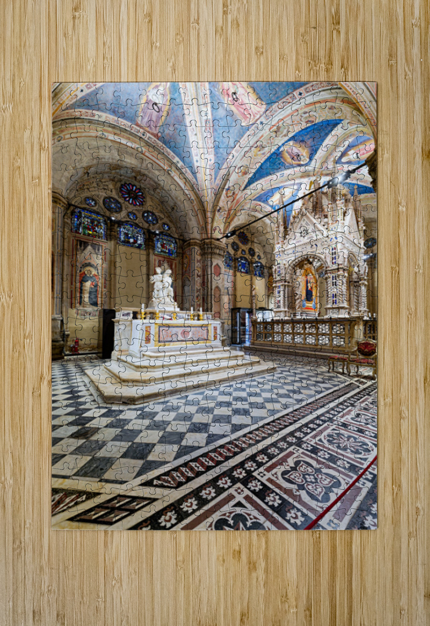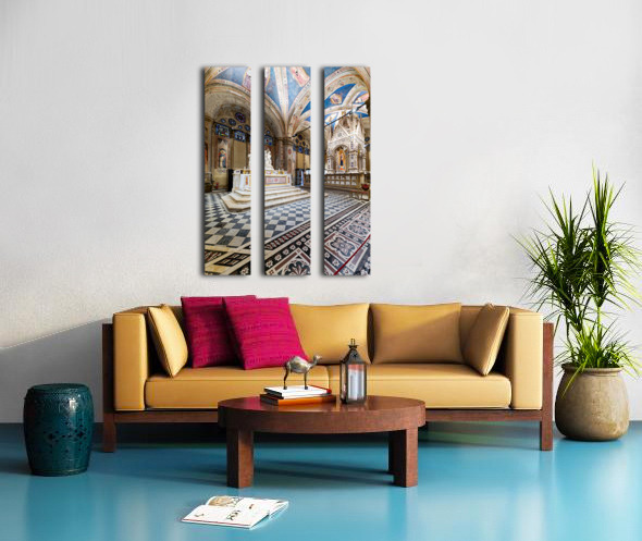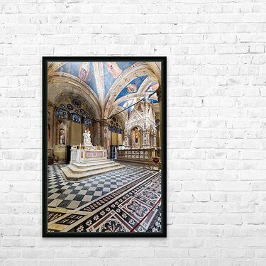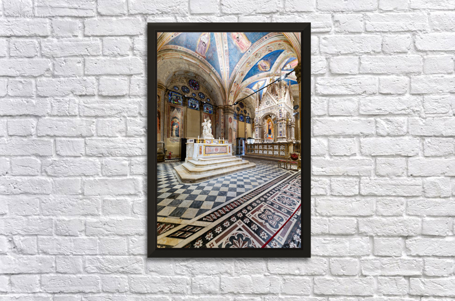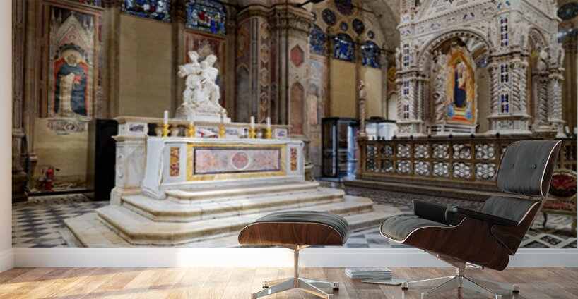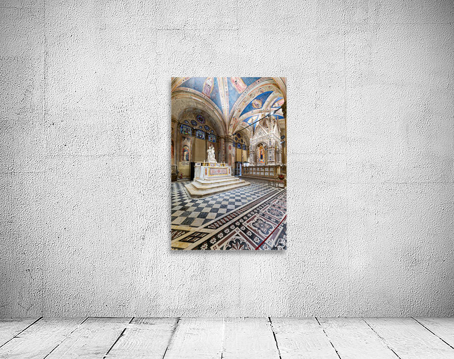 Visitors explore the interior of Orsanmichele church in Florence. The tabernacle stands along with beautiful wall paintings and detailed floors.