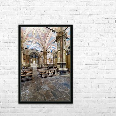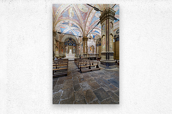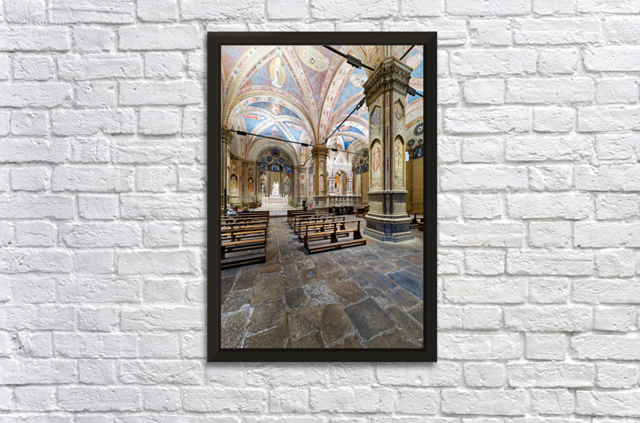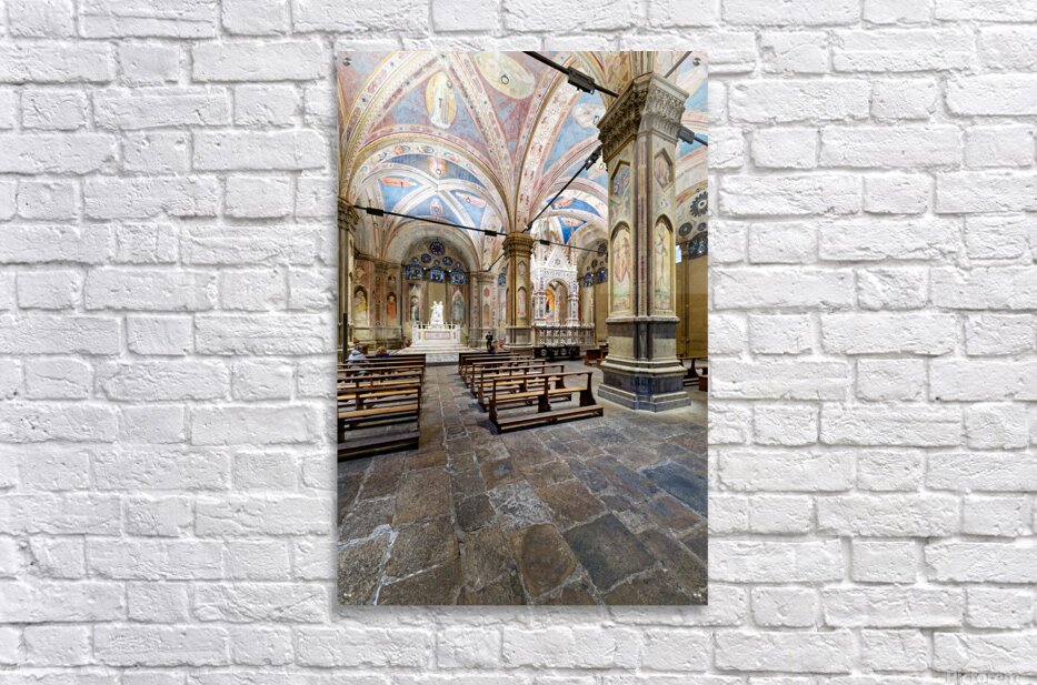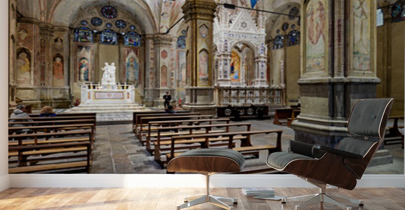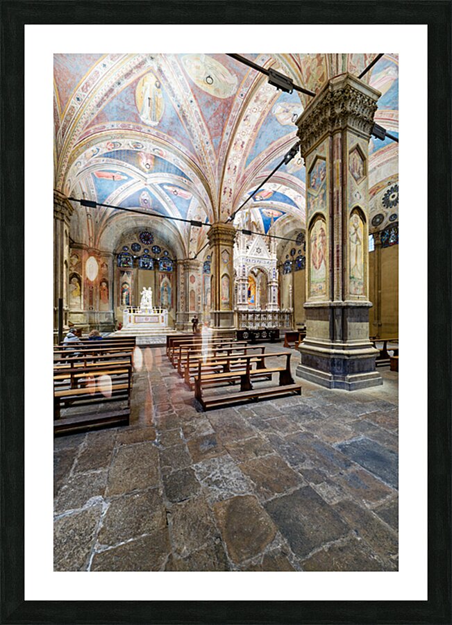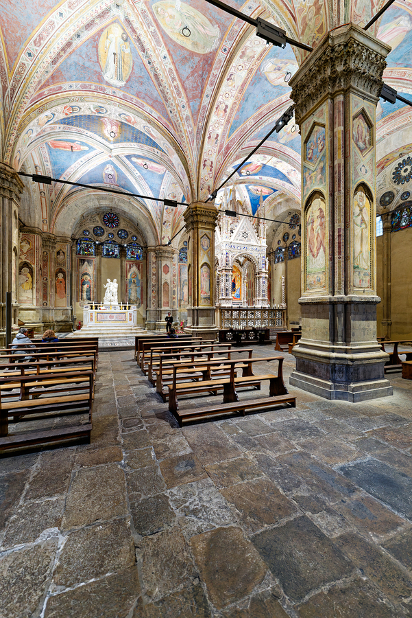 People explore the interior of Orsanmichele church in Florence. The architecture and paintings attract visitors in the sunlight.