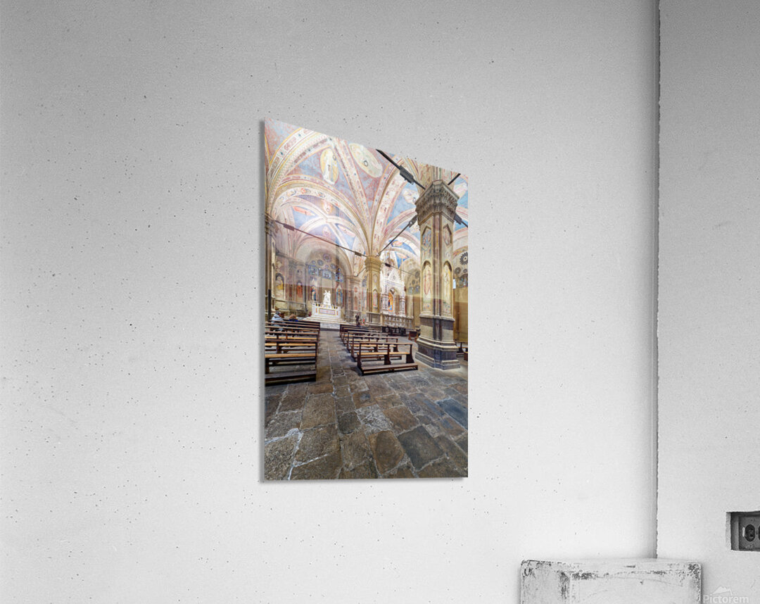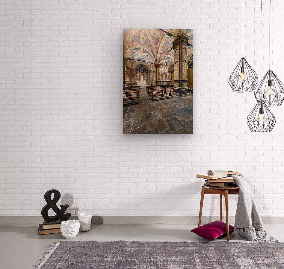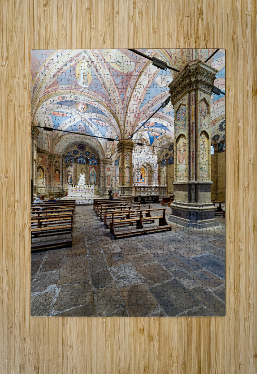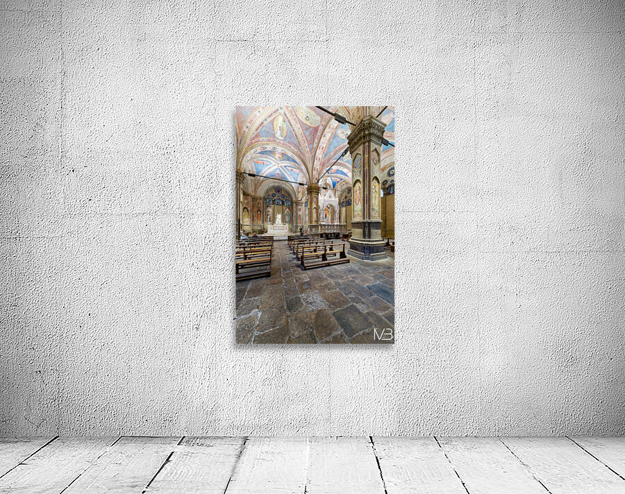 People explore the interior of Orsanmichele church in Florence. The architecture and paintings attract visitors in the sunlight.