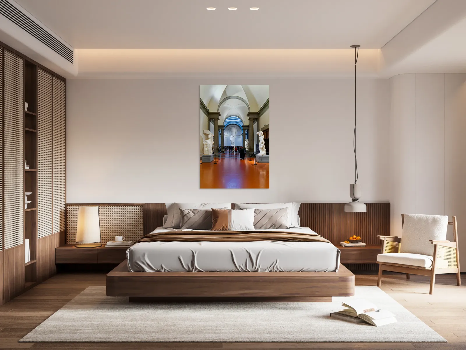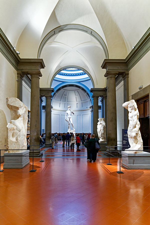Visitors explore the Gallery of the Academy in Florence admiring Michelangelos David and surrounding sculptures. The space has large high ceilings.
