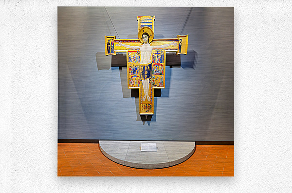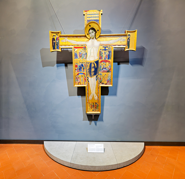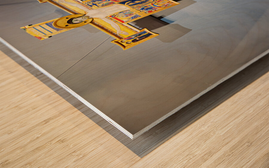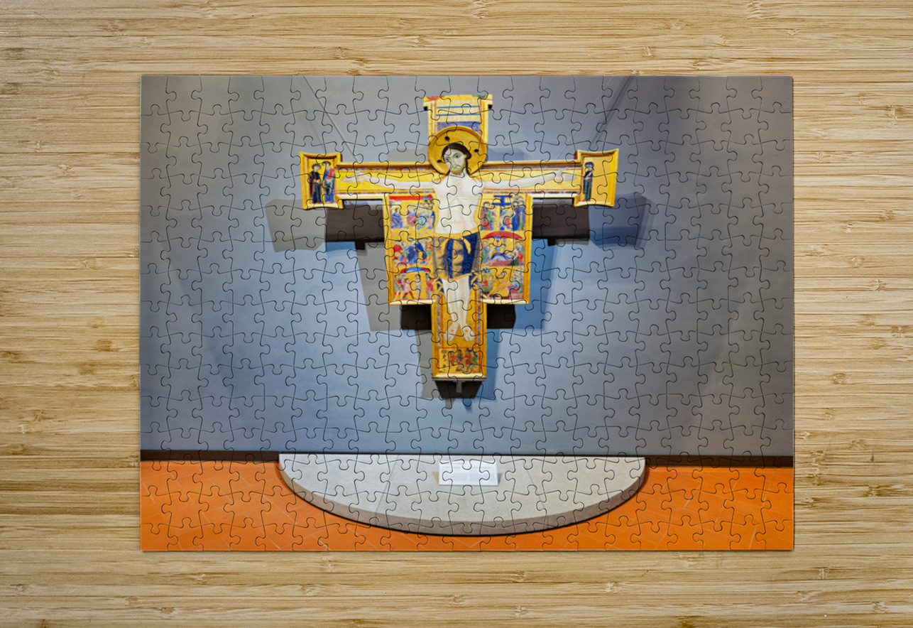 The artwork shows a crucifix with scenes from the life of Christ. It is located in the Uffizi Gallery in Florence Tuscany Italy.