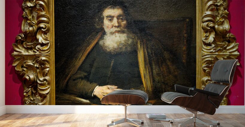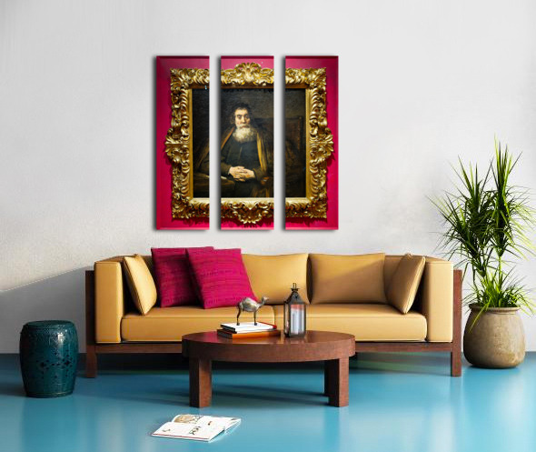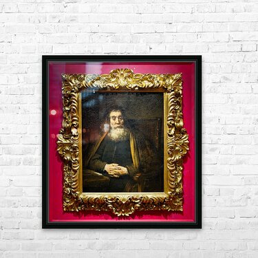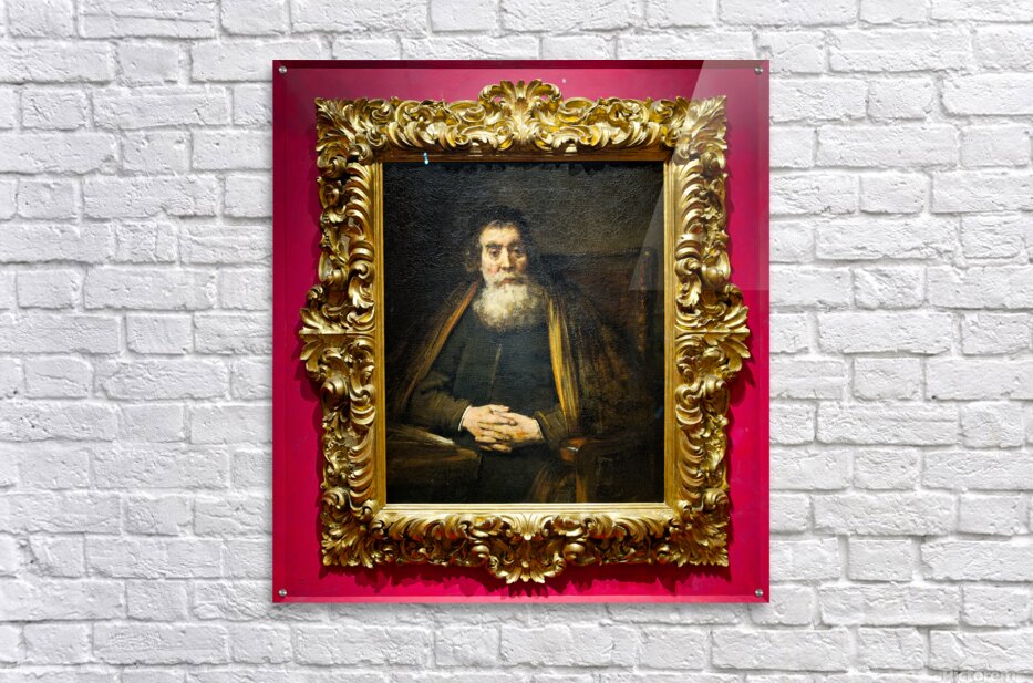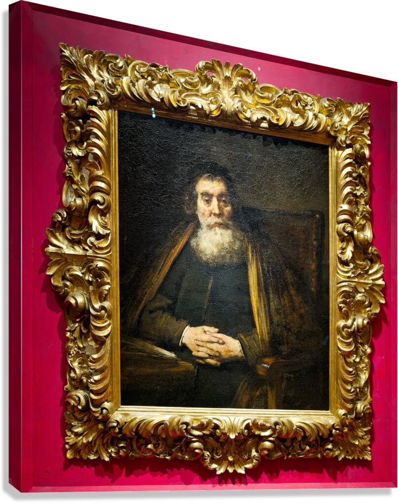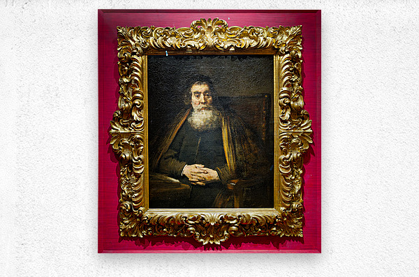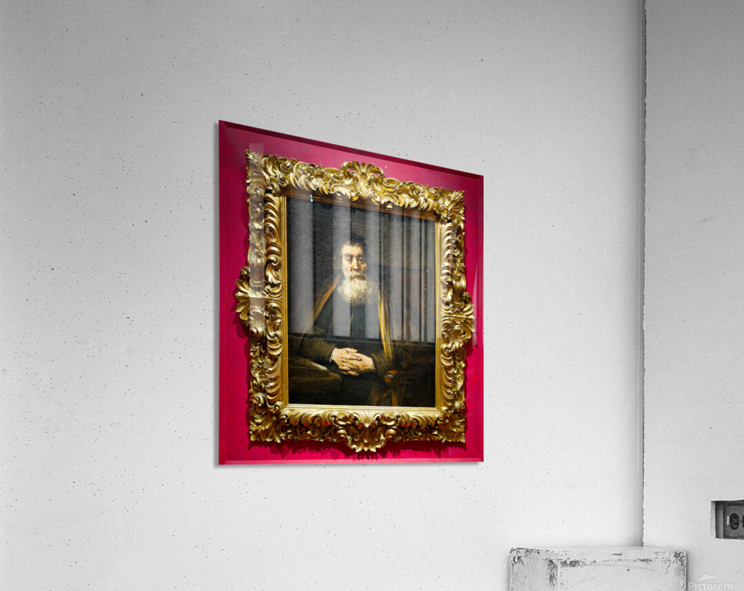 A rabbi sits calmly in a chair with hands together. The painting is framed and hangs in Uffizi Gallery Florence Italy.
