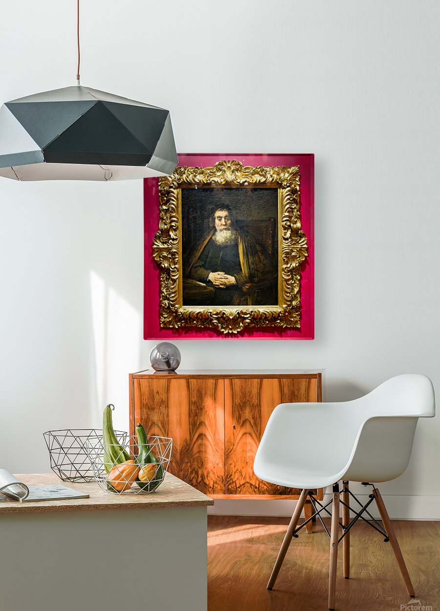 A rabbi sits calmly in a chair with hands together  Wood print