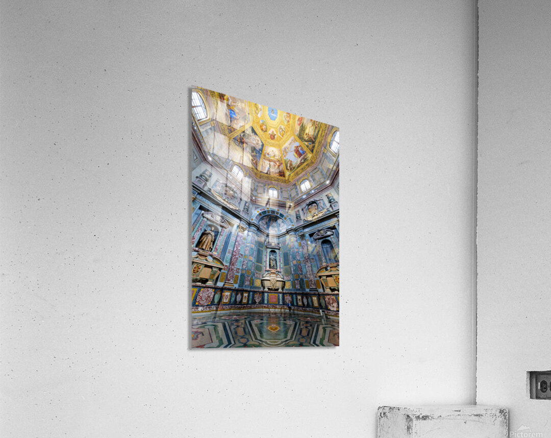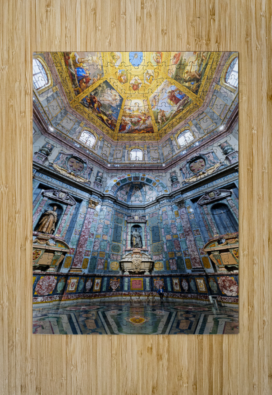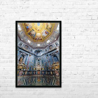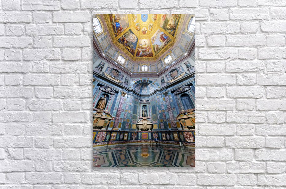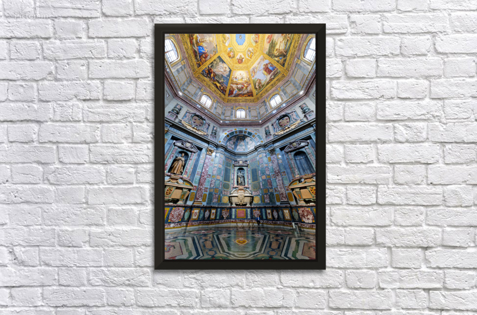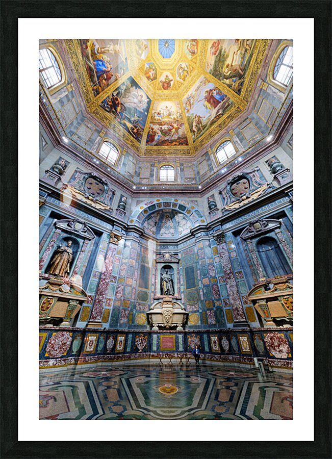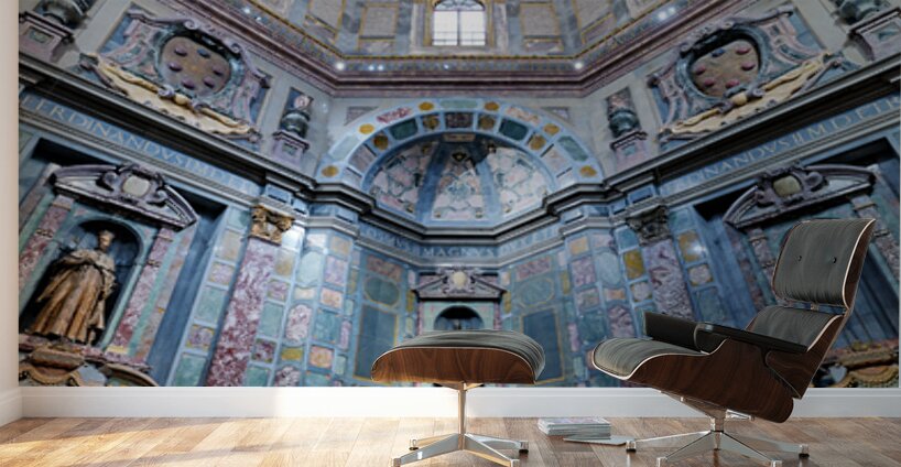 Tourists walk in the Medici Chapels of Florence Tuscany. The space features ornate decorations and historical statues.