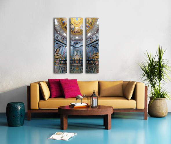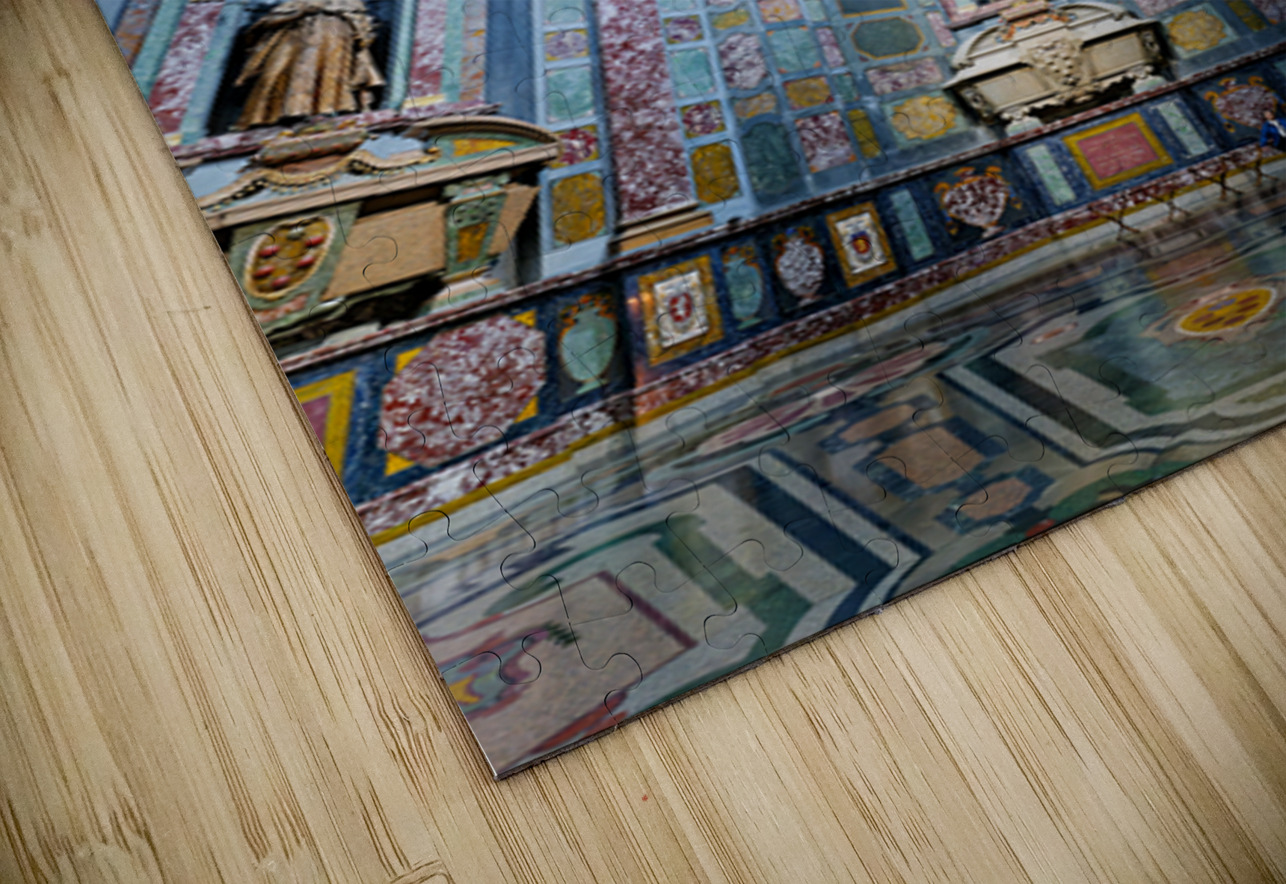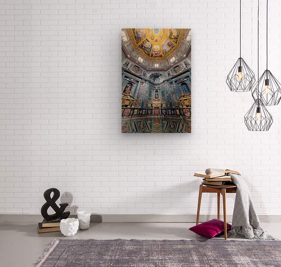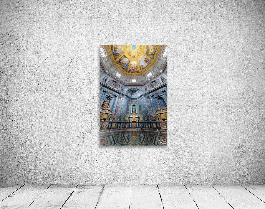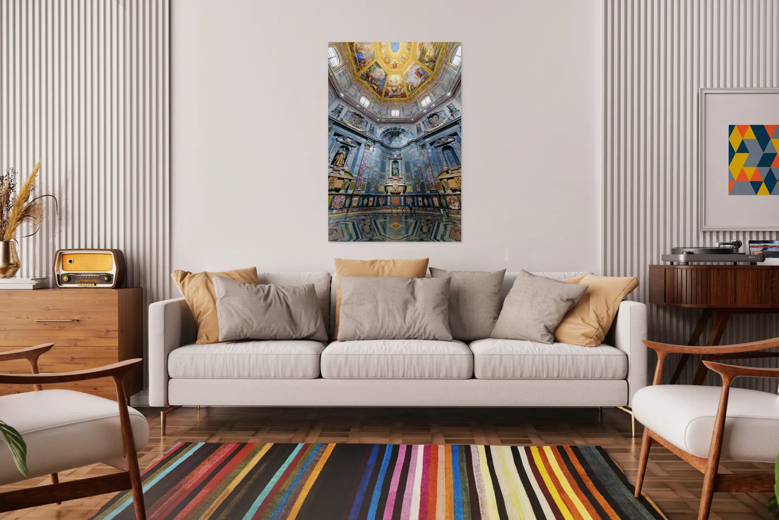 Tourists walk in the Medici Chapels of Florence Tuscany. The space features ornate decorations and historical statues.