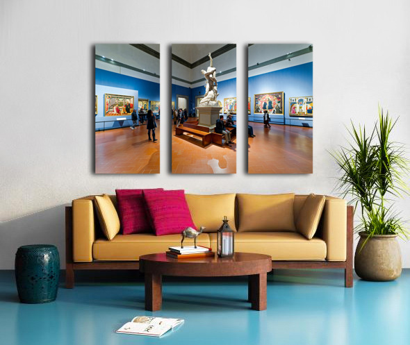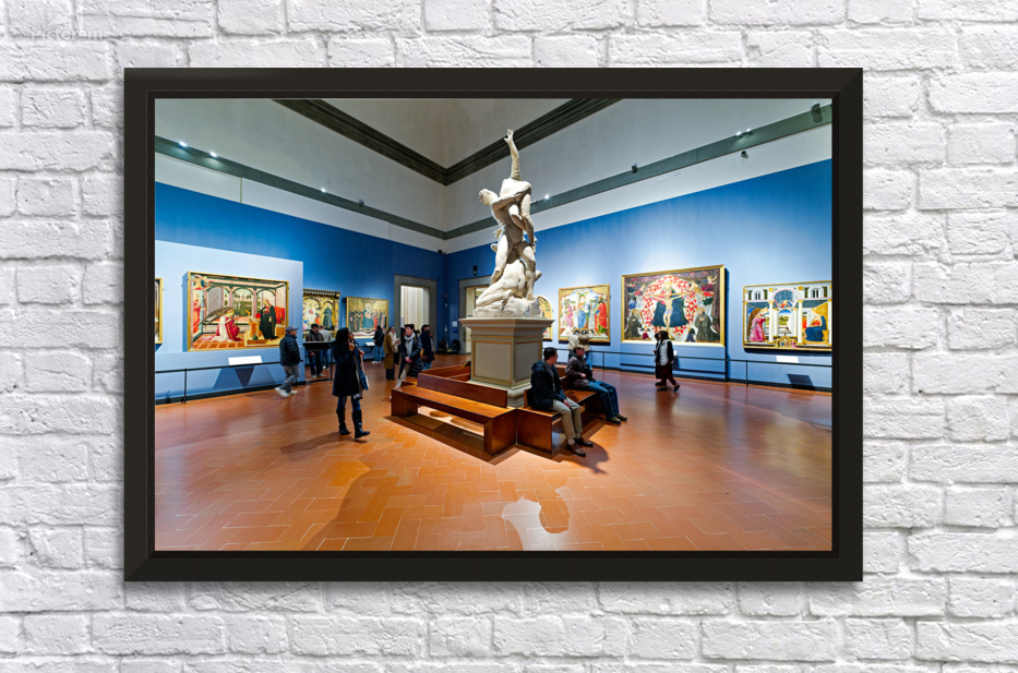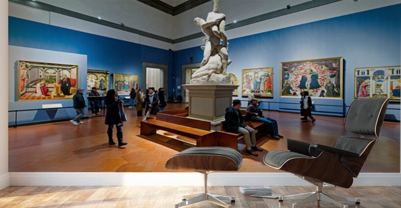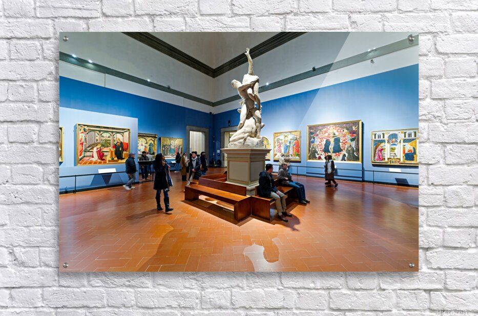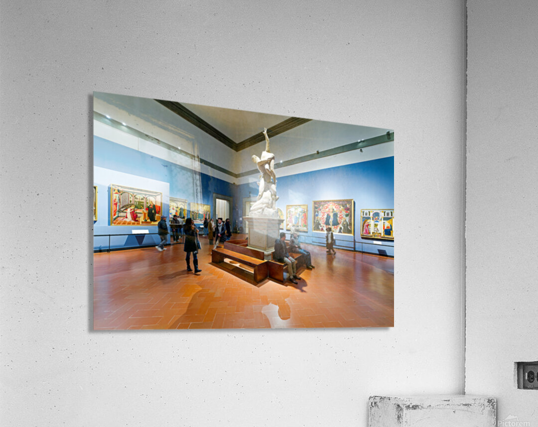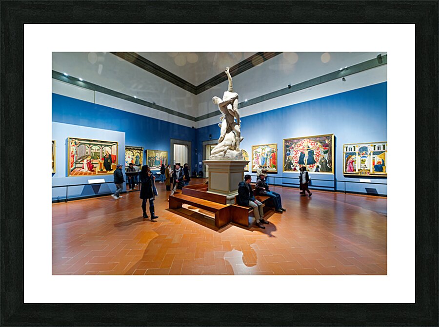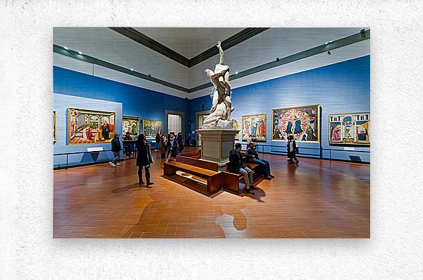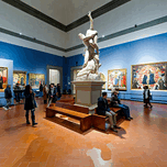 Visitors explore the Gallery of the Academy of Florence viewing Giambolognas Rape of the Sabins sculpture from 1582.