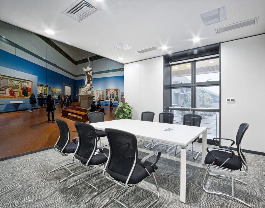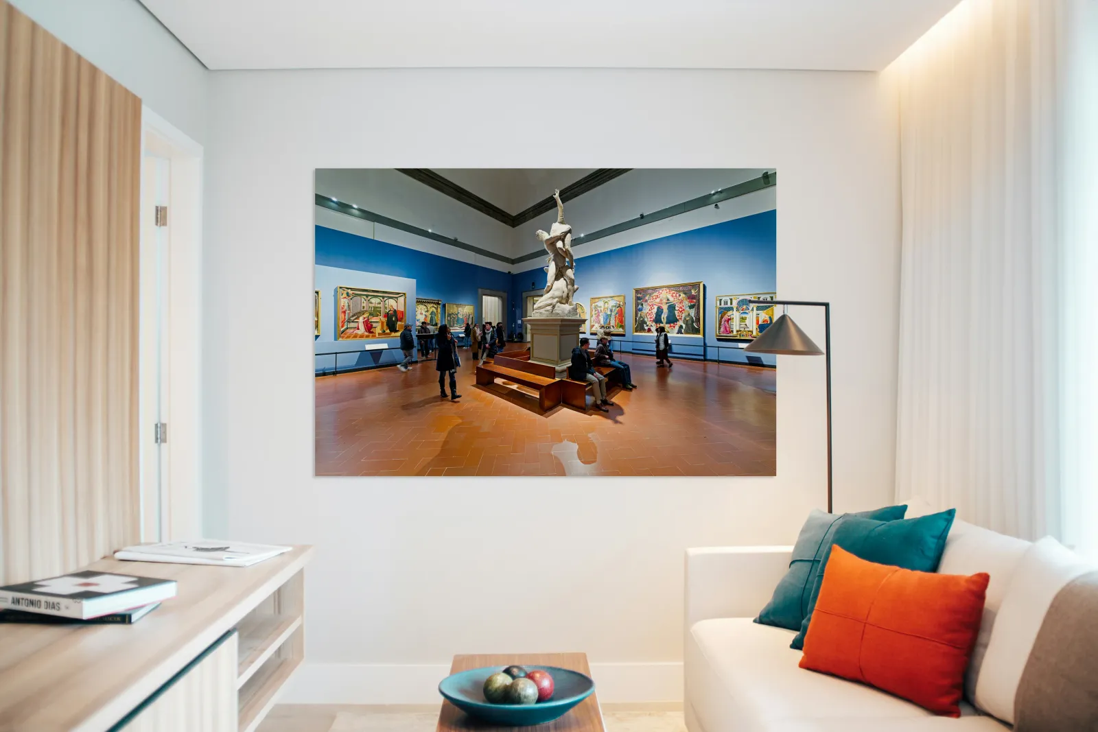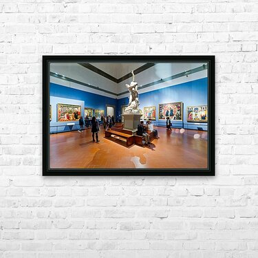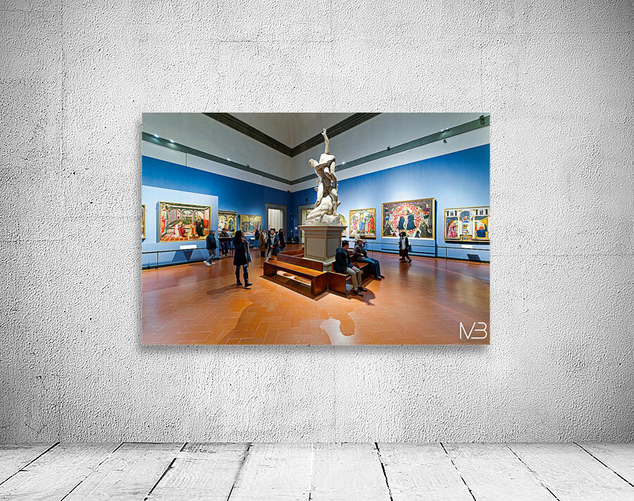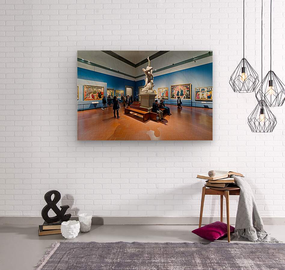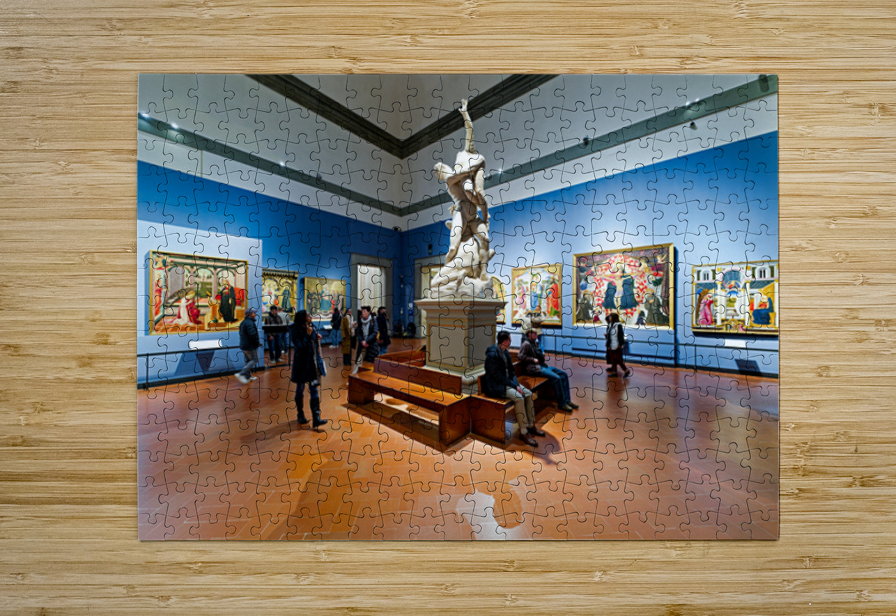 Visitors explore the Gallery of the Academy of Florence viewing Giambolognas Rape of the Sabins sculpture from 1582.