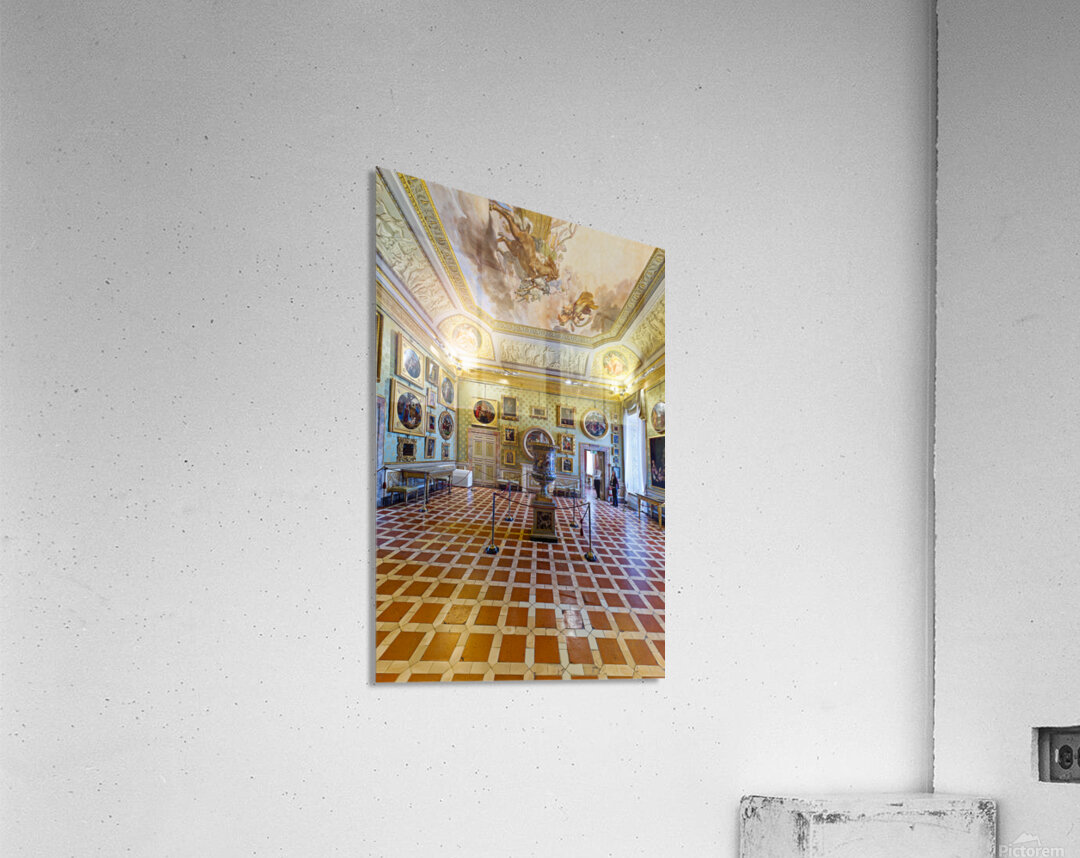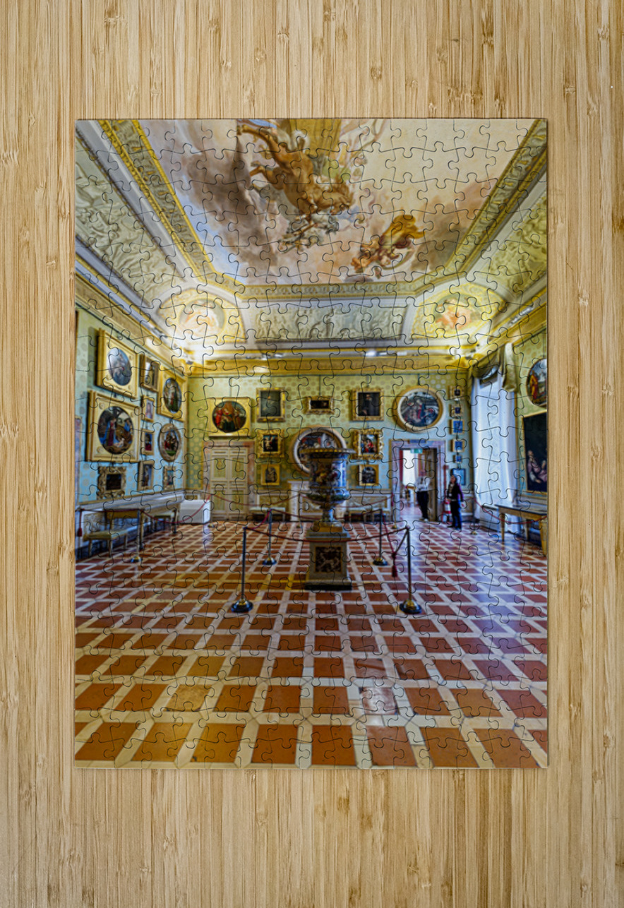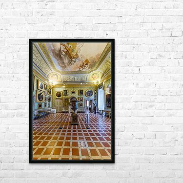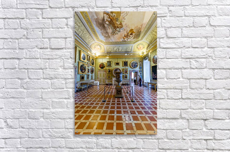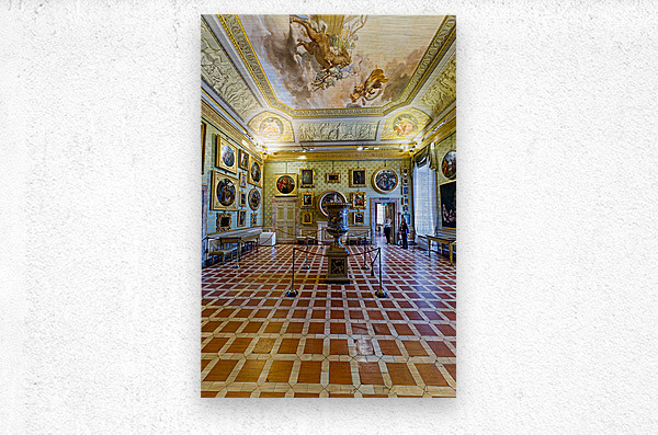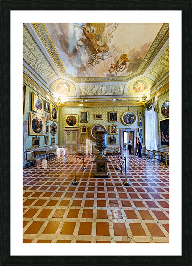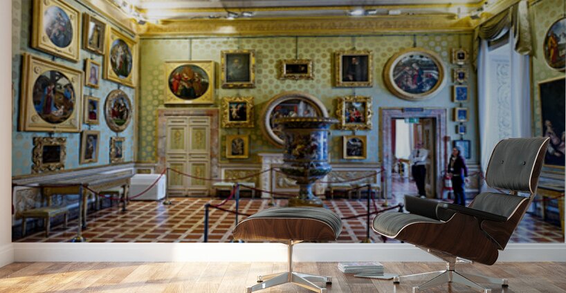 Visitors explore the Palatine Gallery in Pitti Palace Museum in Florence Italy. The room features many paintings and a unique ceiling.