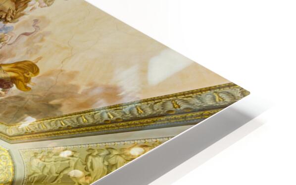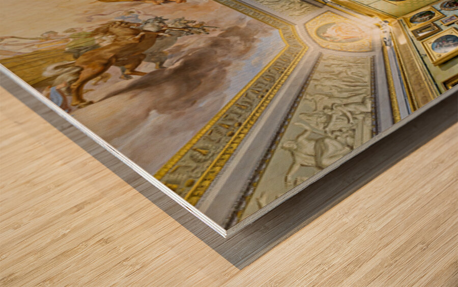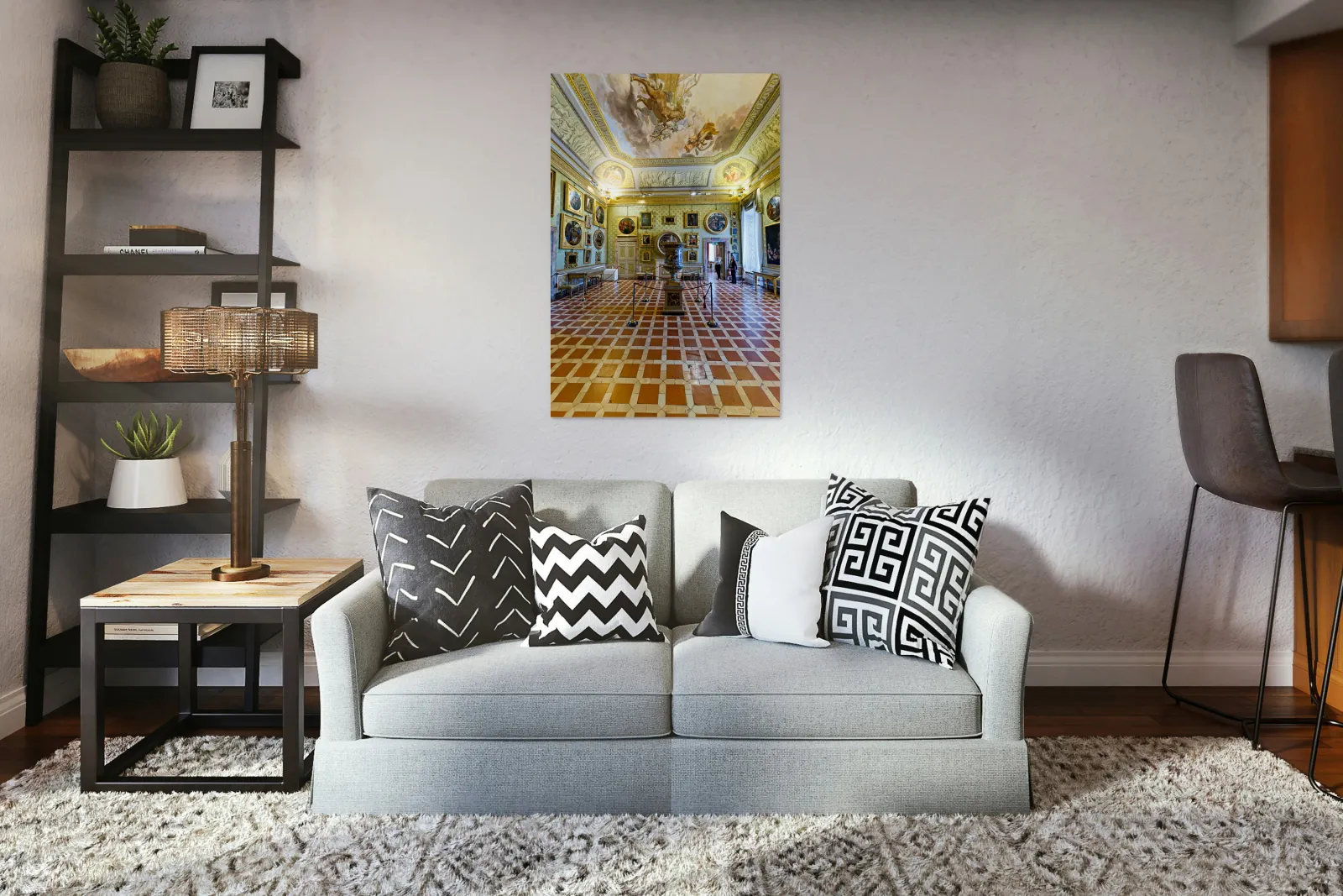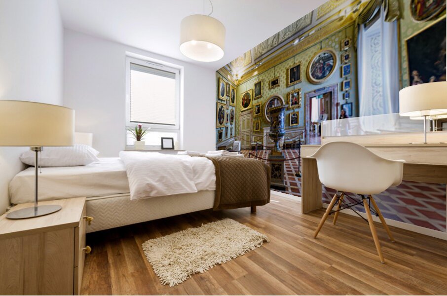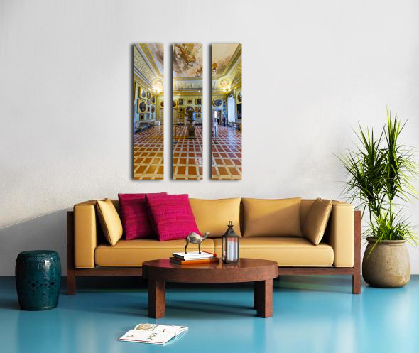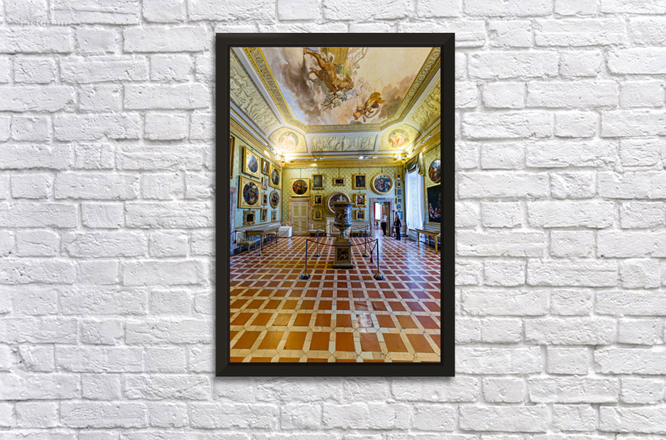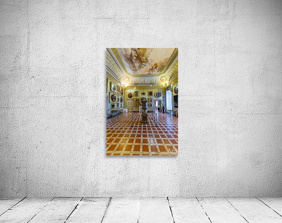 Visitors explore the Palatine Gallery in Pitti Palace Museum in Florence Italy. The room features many paintings and a unique ceiling.