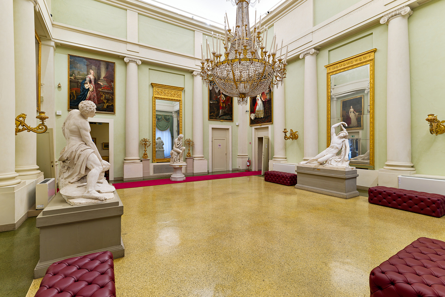 Visitors explore the Palatine Gallery in Palazzo Pitti. The room features large statues paintings and decorative details.