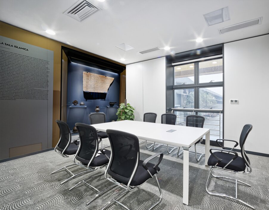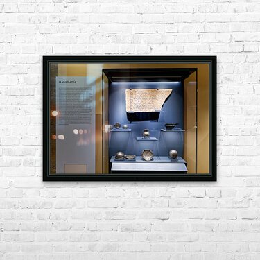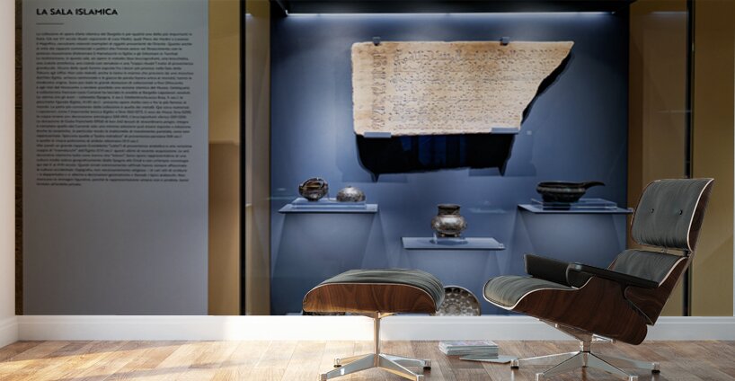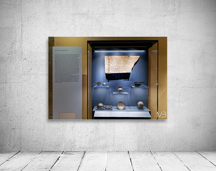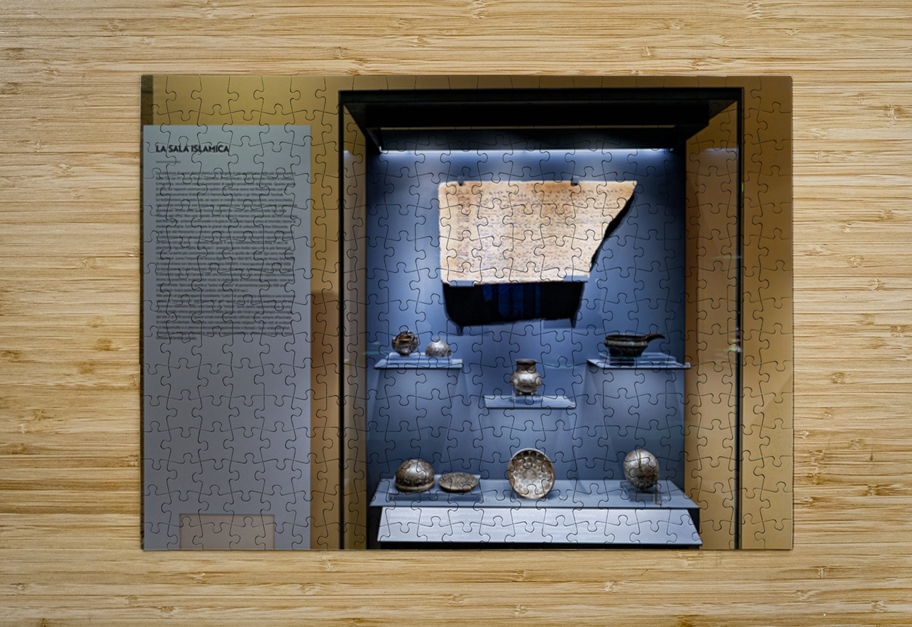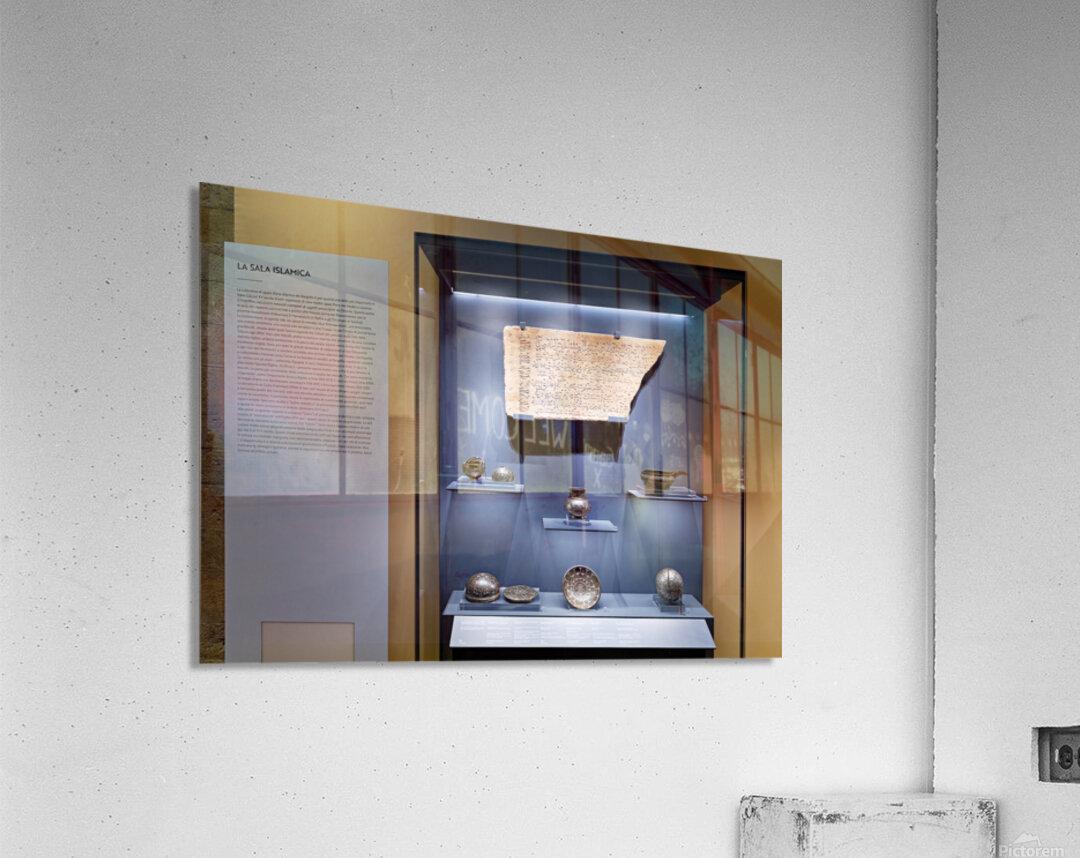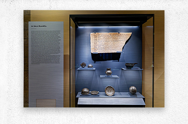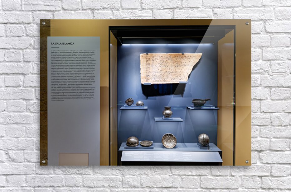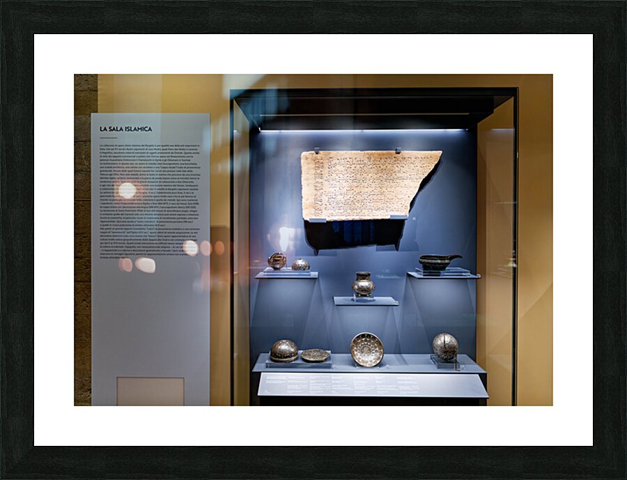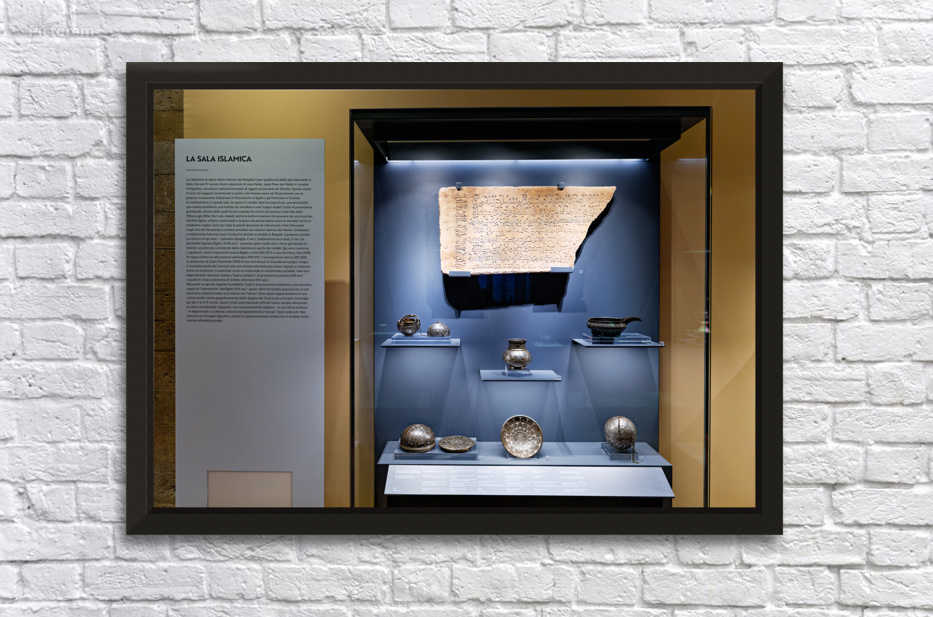 Islamic art pieces are displayed in glass cases at Museo Nazionale del Bargello in Florence. Visitors can explore the rich history and culture.