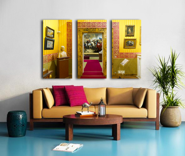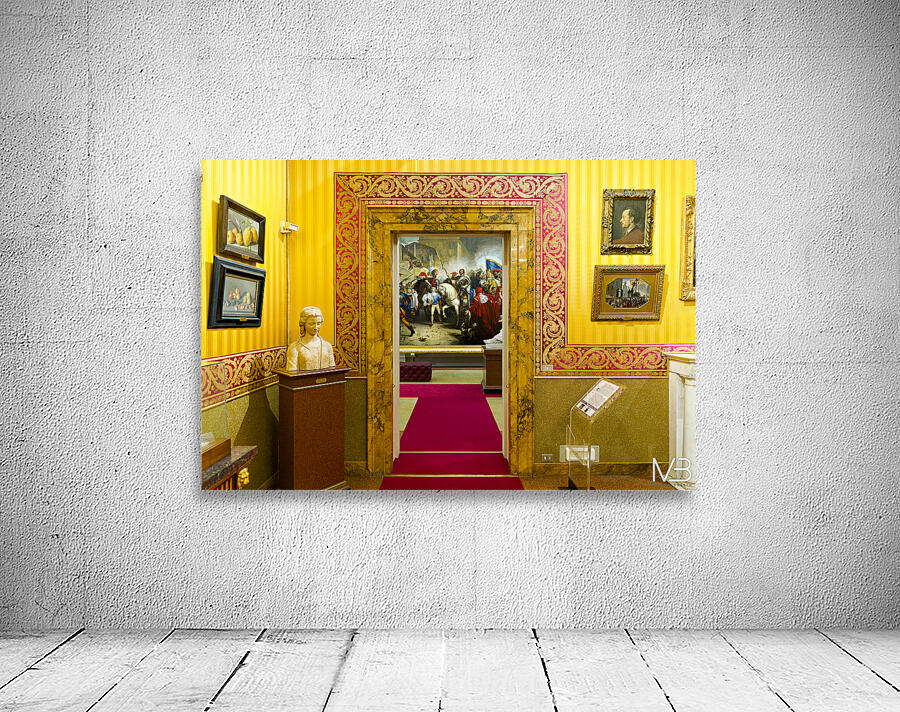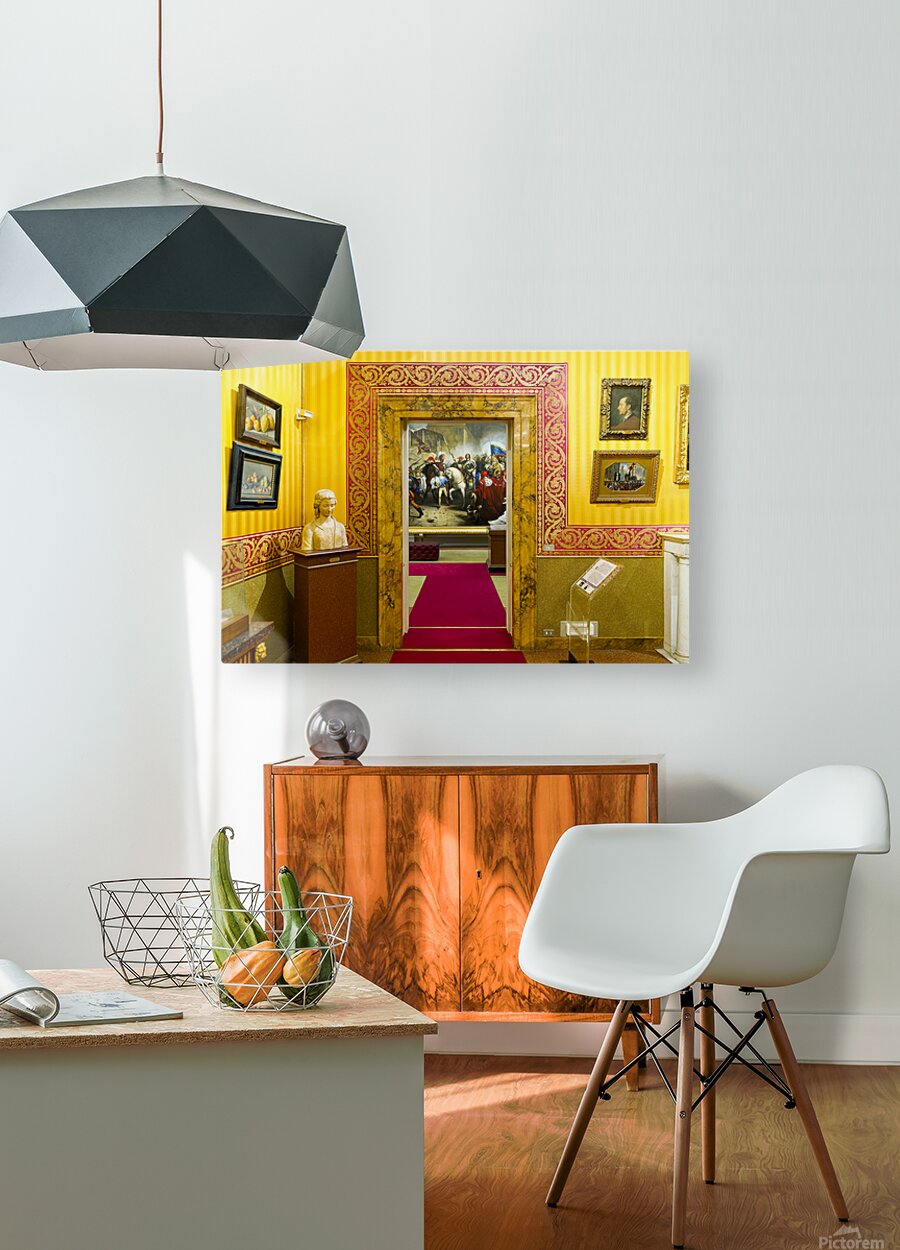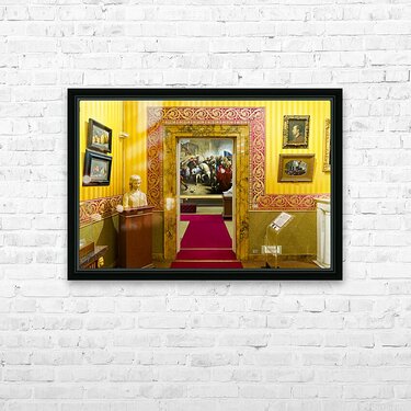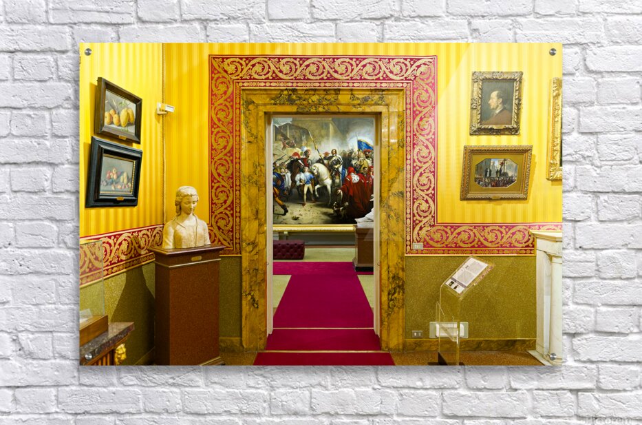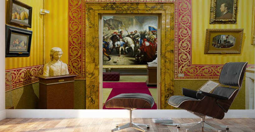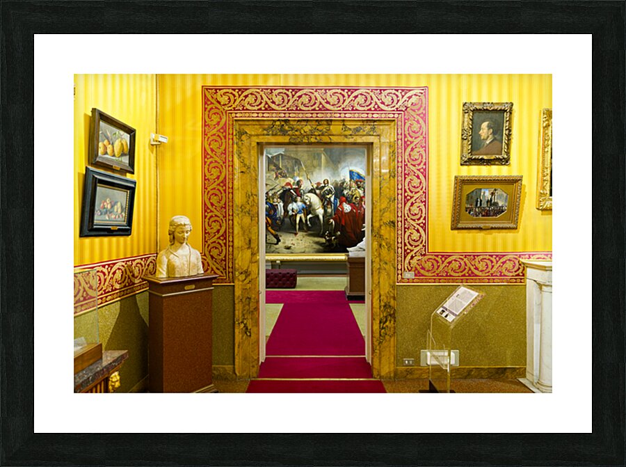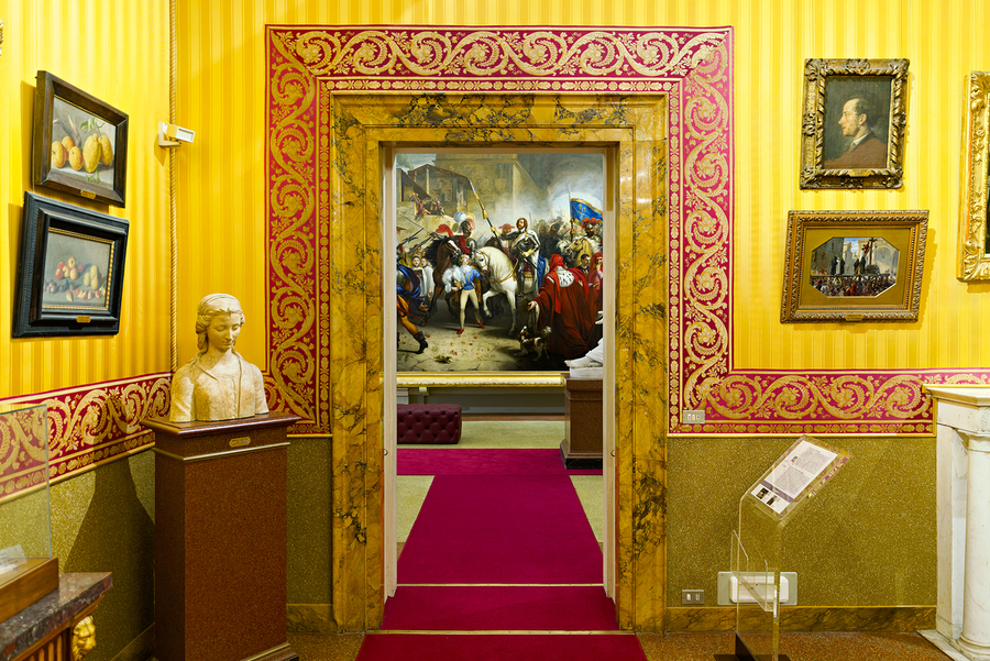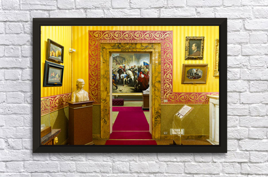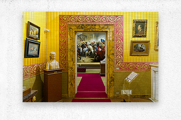 Visitors walk through the Palatine Gallery in Palazzo Pitti Florence. Colorful walls and artworks attract attention from all sides.
